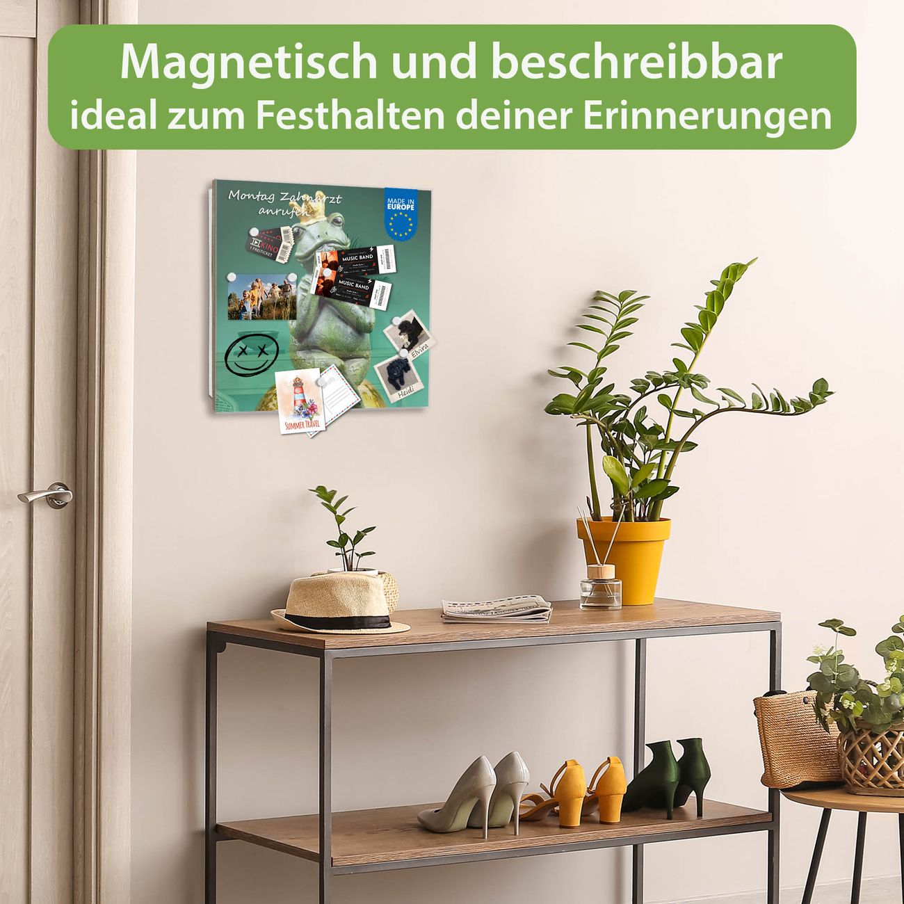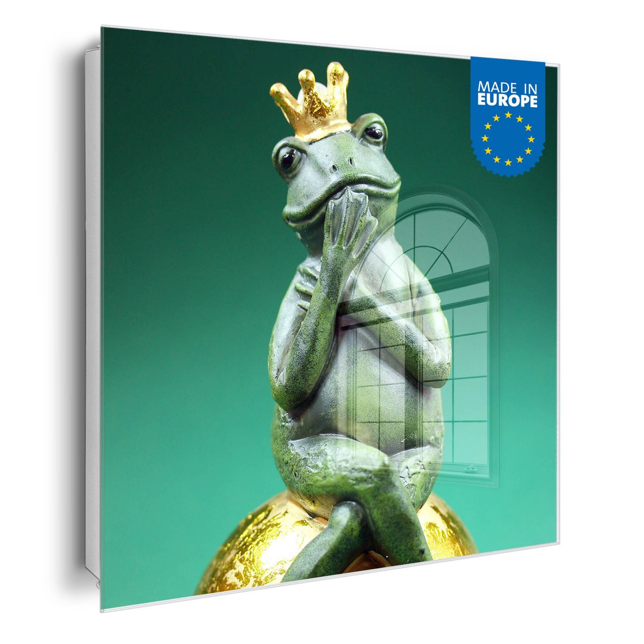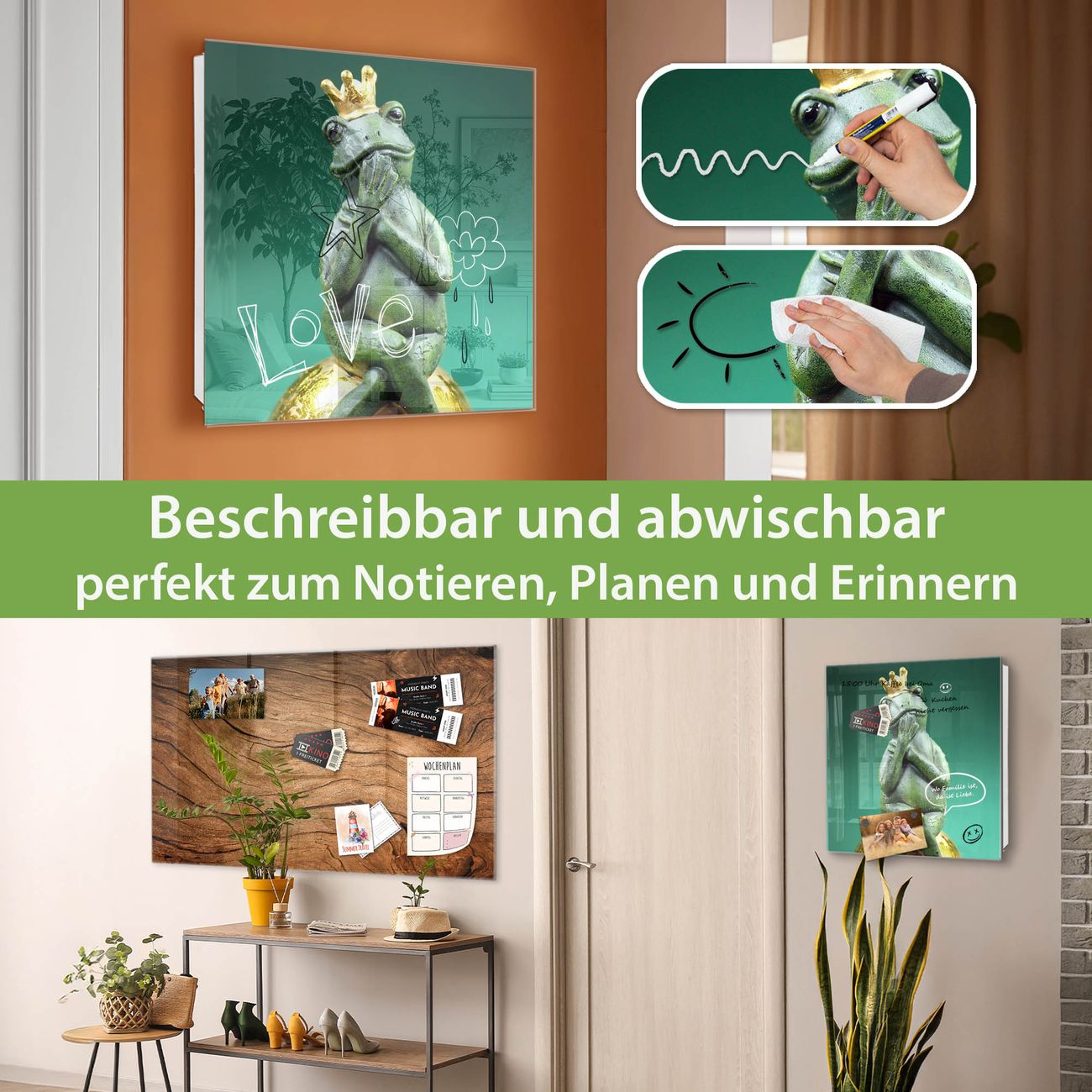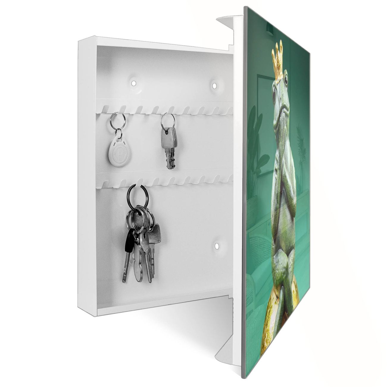 Bringe Ordnung und Eleganz in deinen Eingangsbereich mit dem banjado Schlüsselkasten Motiv Motiv Froschkönig. Die moderne Schlüsselbox kombiniert funktionales Design mit hochwertiger Verarbeitung und wird so zu einem echten Hingucker in Flur, Büro oder Ferienwohnung. ✅ Stilvolle Schlüsselaufbewahrung mit Glasfront im Motiv Motiv Froschkönig Der Design-Schlüsselkasten Motiv Motiv Froschkönig bietet Platz für bis zu 50 Schlüssel, die auf 5 stabilen Reihen mit je 10 Haken übersichtlich verstaut werden. Mit seinen kompakten Maßen von 30 x 30 x 5 cm passt die Schlüsselbox perfekt auch in kleinere Räume. Der weiß lackierte Stahlkorpus mit rechts angeschlagenem Türscharnier harmoniert mit der Glasfront und fügt sich nahtlos in jedes Wohnambiente ein. Ob als Schlüsselorganizer für Zuhause oder als praktische Lösung für Büros, Praxen und Gewerbe, der banjado Schlüsselkasten sorgt für Ordnung und Übersicht. Dank der magnetischen, mit Kreidestiften beschreibbaren Glasfront kannst du Notizen anheften oder Termine direkt auf der Oberfläche festhalten. Die Schlüsselbox Motiv Motiv Froschkönig zur Wandmontage wird inklusive Befestigungsmaterial geliefert und ist schnell angebracht. So hast du deine Schlüssel jederzeit griffbereit und zugleich stilvoll verstaut. Mit diesem banjado Schlüsselkasten Motiv Motiv Froschkönig kombinierst du praktische Aufbewahrung mit stilvollem Wohndesign. Ob privat oder geschäftlich, die Schlüsselbox sorgt für mehr Ordnung, Übersicht und ein wohnliches Ambiente.Vorteile im Überblick
