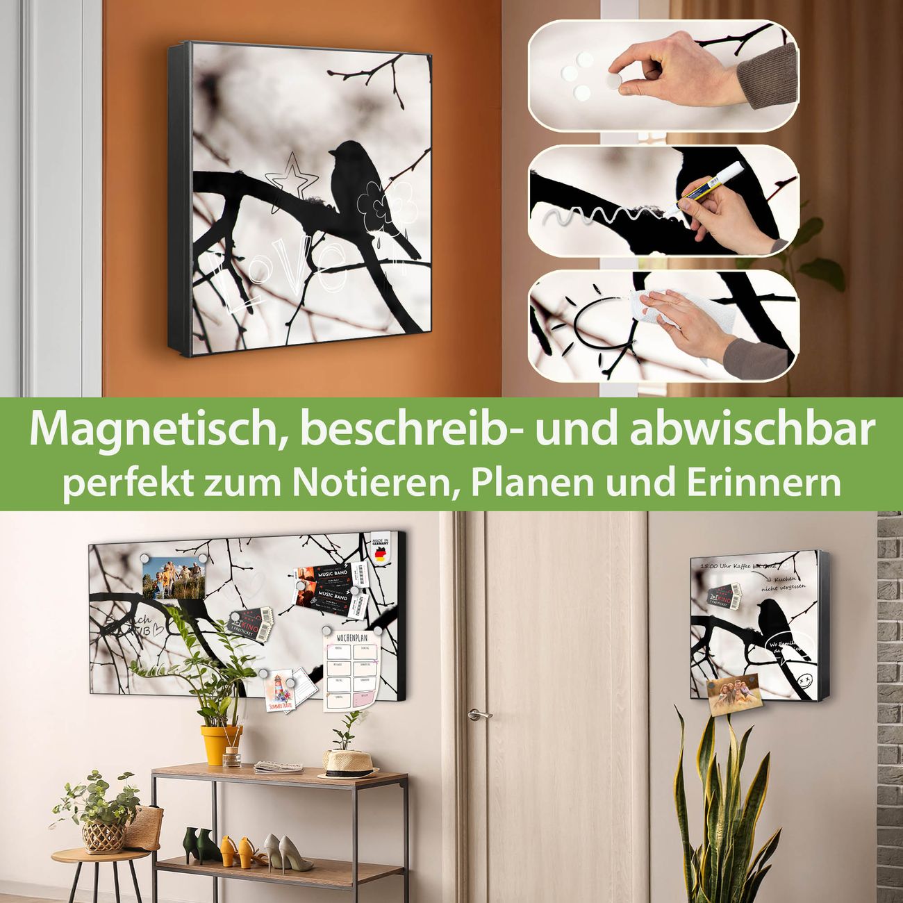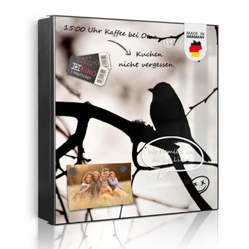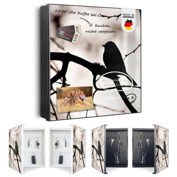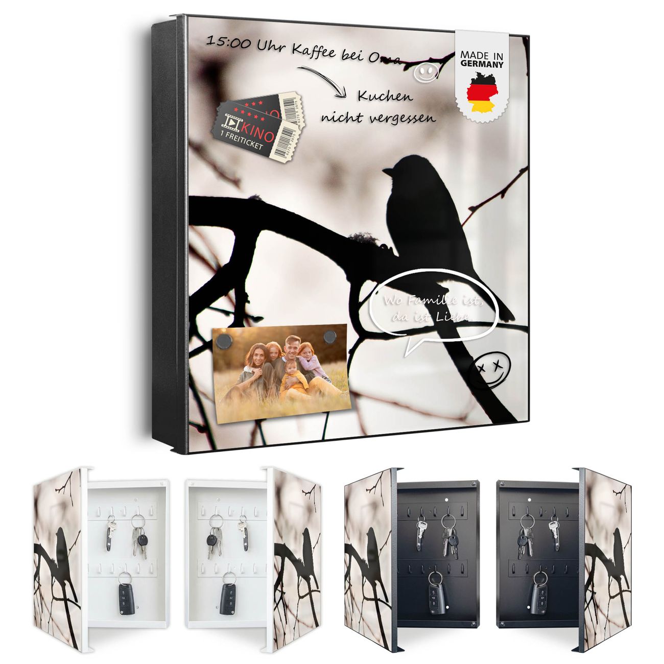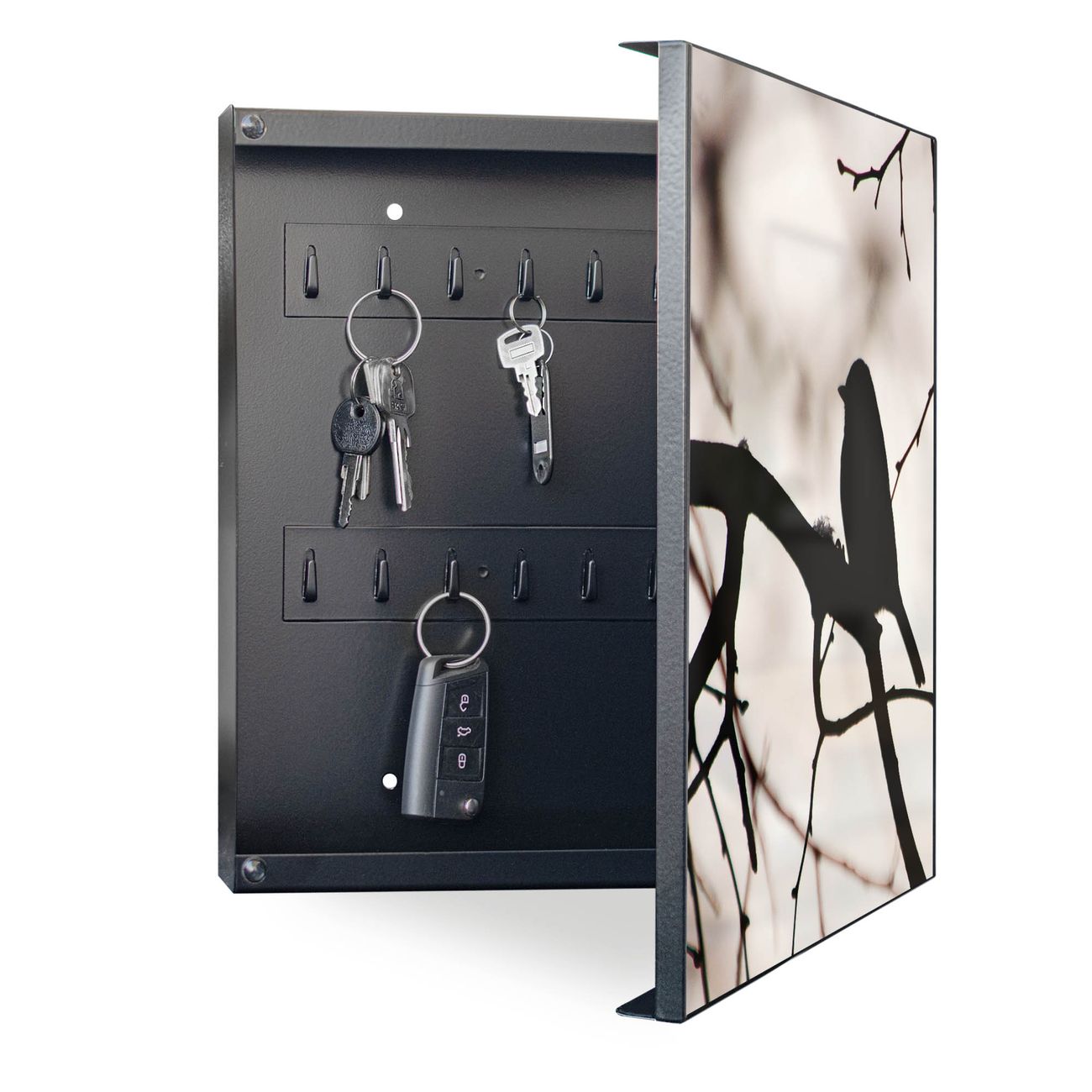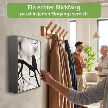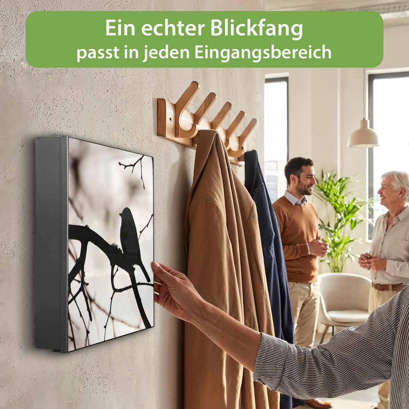 Bringe Ordnung und Eleganz in deinen Eingangsbereich mit dem banjado Schlüsselkasten Motiv Motiv Früher Vogel. Die moderne Schlüsselbox kombiniert funktionales Design mit hochwertiger Verarbeitung und wird so zu einem echten Hingucker in Flur, Büro oder Ferienwohnung. ✅ Stilvolle Schlüsselaufbewahrung mit Motiv Motiv Früher Vogel Der Design-Schlüsselkasten Motiv Motiv Früher Vogel bietet Platz für bis zu 32 Schlüssel, die auf 4 stabilen Reihen mit je 8 Haken übersichtlich verstaut werden. Mit seinen kompakten Maßen von 30 x 30 x 5 cm passt die Schlüsselbox perfekt auch in kleinere Räume. Der schwarz lackierte Stahlkorpus mit rechts angeschlagenem Türscharnier harmoniert mit gedruckten Folie auf der Front und fügt sich nahtlos in jedes Wohnambiente ein. Ob als Schlüsselorganizer für Zuhause oder als praktische Lösung für Büros, Praxen und Gewerbe, der banjado Schlüsselkasten sorgt für Ordnung und Übersicht. Dank der magnetischen, mit Kreidestiften beschreibbaren Folie auf der Front kannst du Notizen anheften oder Termine direkt auf der Oberfläche festhalten. Die Schlüsselbox Motiv Motiv Früher Vogel zur Wandmontage wird inklusive Befestigungsmaterial geliefert und ist schnell angebracht. So hast du deine Schlüssel jederzeit griffbereit und zugleich stilvoll verstaut. Mit diesem banjado Schlüsselkasten Motiv Motiv Früher Vogel kombinierst du praktische Aufbewahrung mit stilvollem Wohndesign. Ob privat oder geschäftlich, die Schlüsselbox sorgt für mehr Ordnung, Übersicht und ein wohnliches Ambiente.Vorteile im Überblick