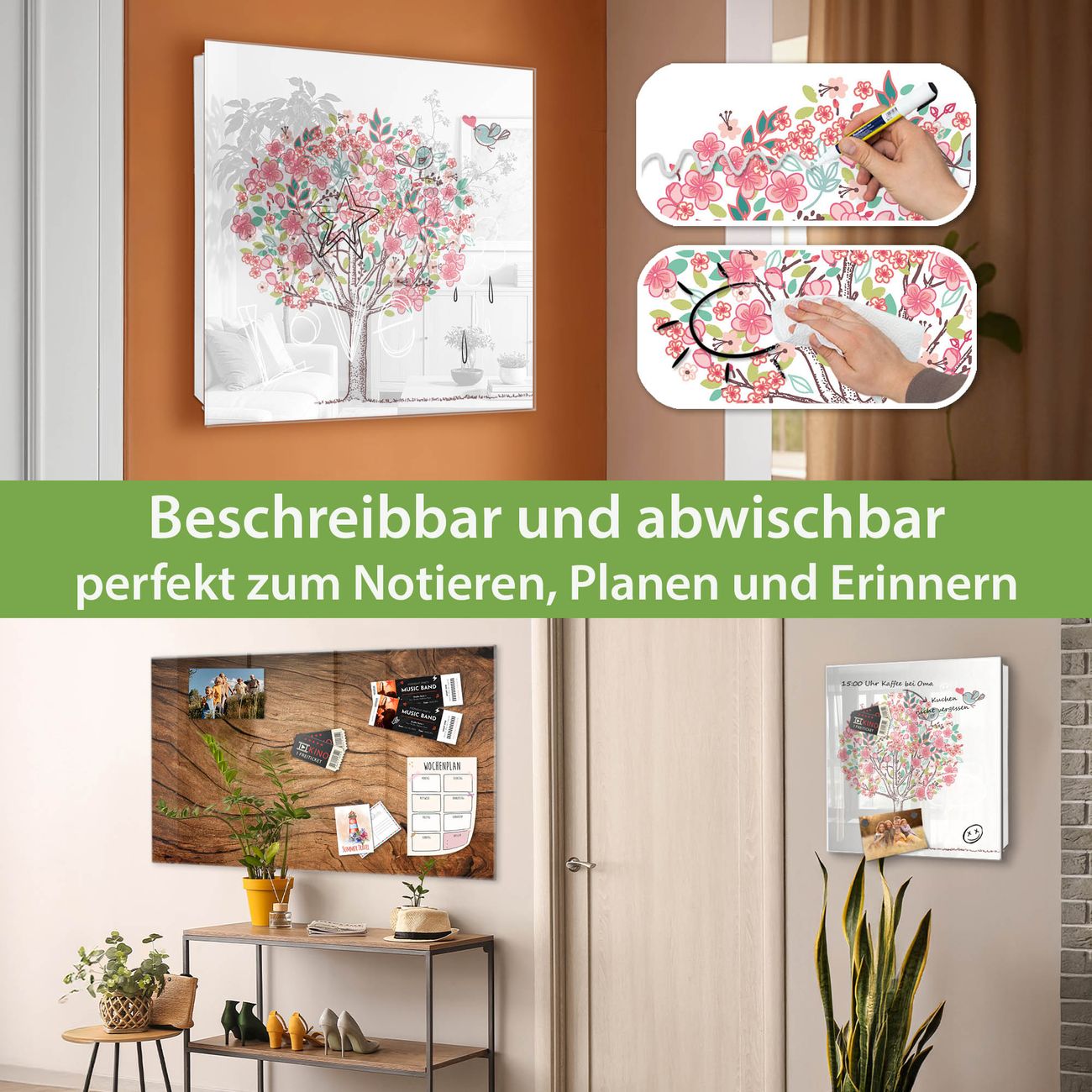 Bringe Ordnung und Eleganz in deinen Eingangsbereich mit dem banjado Schlüsselkasten Motiv Motiv Frühlingsgefühle. Die moderne Schlüsselbox kombiniert funktionales Design mit hochwertiger Verarbeitung und wird so zu einem echten Hingucker in Flur, Büro oder Ferienwohnung. ✅ Stilvolle Schlüsselaufbewahrung mit Glasfront im Motiv Motiv Frühlingsgefühle Der Design-Schlüsselkasten Motiv Motiv Frühlingsgefühle bietet Platz für bis zu 50 Schlüssel, die auf 5 stabilen Reihen mit je 10 Haken übersichtlich verstaut werden. Mit seinen kompakten Maßen von 30 x 30 x 5 cm passt die Schlüsselbox perfekt auch in kleinere Räume. Der weiß lackierte Stahlkorpus mit rechts angeschlagenem Türscharnier harmoniert mit der Glasfront und fügt sich nahtlos in jedes Wohnambiente ein. Ob als Schlüsselorganizer für Zuhause oder als praktische Lösung für Büros, Praxen und Gewerbe, der banjado Schlüsselkasten sorgt für Ordnung und Übersicht. Dank der magnetischen, mit Kreidestiften beschreibbaren Glasfront kannst du Notizen anheften oder Termine direkt auf der Oberfläche festhalten. Die Schlüsselbox Motiv Motiv Frühlingsgefühle zur Wandmontage wird inklusive Befestigungsmaterial geliefert und ist schnell angebracht. So hast du deine Schlüssel jederzeit griffbereit und zugleich stilvoll verstaut. Mit diesem banjado Schlüsselkasten Motiv Motiv Frühlingsgefühle kombinierst du praktische Aufbewahrung mit stilvollem Wohndesign. Ob privat oder geschäftlich, die Schlüsselbox sorgt für mehr Ordnung, Übersicht und ein wohnliches Ambiente.Vorteile im Überblick