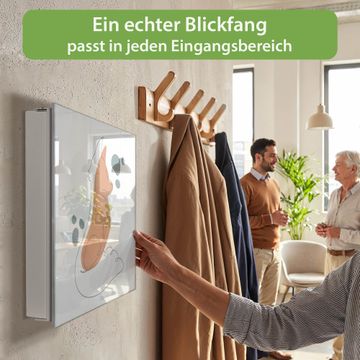 Bringe Ordnung und Eleganz in deinen Eingangsbereich mit dem banjado Schlüsselkasten Motiv Motiv Fuchs in Linien. Die moderne Schlüsselbox kombiniert funktionales Design mit hochwertiger Verarbeitung und wird so zu einem echten Hingucker in Flur, Büro oder Ferienwohnung. ✅ Stilvolle Schlüsselaufbewahrung mit Glasfront im Motiv Motiv Fuchs in Linien Der Design-Schlüsselkasten Motiv Motiv Fuchs in Linien bietet Platz für bis zu 50 Schlüssel, die auf 5 stabilen Reihen mit je 10 Haken übersichtlich verstaut werden. Mit seinen kompakten Maßen von 30 x 30 x 5 cm passt die Schlüsselbox perfekt auch in kleinere Räume. Der weiß lackierte Stahlkorpus mit rechts angeschlagenem Türscharnier harmoniert mit der Glasfront und fügt sich nahtlos in jedes Wohnambiente ein. Ob als Schlüsselorganizer für Zuhause oder als praktische Lösung für Büros, Praxen und Gewerbe, der banjado Schlüsselkasten sorgt für Ordnung und Übersicht. Dank der magnetischen, mit Kreidestiften beschreibbaren Glasfront kannst du Notizen anheften oder Termine direkt auf der Oberfläche festhalten. Die Schlüsselbox Motiv Motiv Fuchs in Linien zur Wandmontage wird inklusive Befestigungsmaterial geliefert und ist schnell angebracht. So hast du deine Schlüssel jederzeit griffbereit und zugleich stilvoll verstaut. Mit diesem banjado Schlüsselkasten Motiv Motiv Fuchs in Linien kombinierst du praktische Aufbewahrung mit stilvollem Wohndesign. Ob privat oder geschäftlich, die Schlüsselbox sorgt für mehr Ordnung, Übersicht und ein wohnliches Ambiente.Vorteile im Überblick