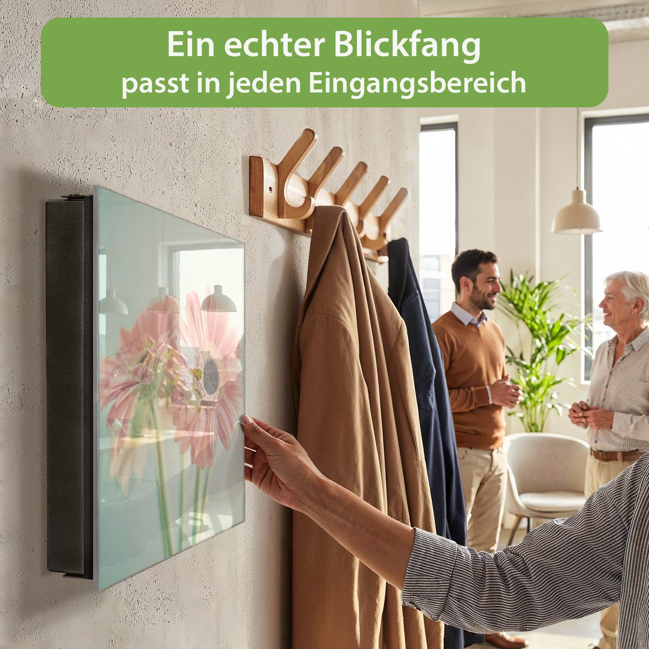 Bringe Ordnung und Eleganz in deinen Eingangsbereich mit dem banjado Schlüsselkasten Motiv Motiv Fünf Gerbera. Die moderne Schlüsselbox kombiniert funktionales Design mit hochwertiger Verarbeitung und wird so zu einem echten Hingucker in Flur, Büro oder Ferienwohnung. ✅ Stilvolle Schlüsselaufbewahrung mit Glasfront im Motiv Motiv Fünf Gerbera Der Design-Schlüsselkasten Motiv Motiv Fünf Gerbera bietet Platz für bis zu 50 Schlüssel, die auf 5 stabilen Reihen mit je 10 Haken übersichtlich verstaut werden. Mit seinen kompakten Maßen von 30 x 30 x 5 cm passt die Schlüsselbox perfekt auch in kleinere Räume. Der schwarz lackierte Stahlkorpus mit rechts angeschlagenem Türscharnier harmoniert mit der Glasfront und fügt sich nahtlos in jedes Wohnambiente ein. Ob als Schlüsselorganizer für Zuhause oder als praktische Lösung für Büros, Praxen und Gewerbe, der banjado Schlüsselkasten sorgt für Ordnung und Übersicht. Dank der magnetischen, mit Kreidestiften beschreibbaren Glasfront kannst du Notizen anheften oder Termine direkt auf der Oberfläche festhalten. Die Schlüsselbox Motiv Motiv Fünf Gerbera zur Wandmontage wird inklusive Befestigungsmaterial geliefert und ist schnell angebracht. So hast du deine Schlüssel jederzeit griffbereit und zugleich stilvoll verstaut. Mit diesem banjado Schlüsselkasten Motiv Motiv Fünf Gerbera kombinierst du praktische Aufbewahrung mit stilvollem Wohndesign. Ob privat oder geschäftlich, die Schlüsselbox sorgt für mehr Ordnung, Übersicht und ein wohnliches Ambiente.Vorteile im Überblick