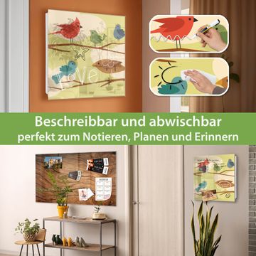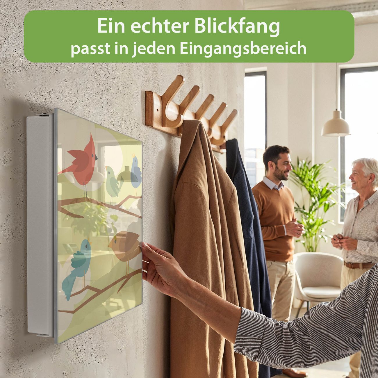 Bringe Ordnung und Eleganz in deinen Eingangsbereich mit dem banjado Schlüsselkasten Motiv Motiv Fünf Vögel. Die moderne Schlüsselbox kombiniert funktionales Design mit hochwertiger Verarbeitung und wird so zu einem echten Hingucker in Flur, Büro oder Ferienwohnung. ✅ Stilvolle Schlüsselaufbewahrung mit Glasfront im Motiv Motiv Fünf Vögel Der Design-Schlüsselkasten Motiv Motiv Fünf Vögel bietet Platz für bis zu 50 Schlüssel, die auf 5 stabilen Reihen mit je 10 Haken übersichtlich verstaut werden. Mit seinen kompakten Maßen von 30 x 30 x 5 cm passt die Schlüsselbox perfekt auch in kleinere Räume. Der weiß lackierte Stahlkorpus mit rechts angeschlagenem Türscharnier harmoniert mit der Glasfront und fügt sich nahtlos in jedes Wohnambiente ein. Ob als Schlüsselorganizer für Zuhause oder als praktische Lösung für Büros, Praxen und Gewerbe, der banjado Schlüsselkasten sorgt für Ordnung und Übersicht. Dank der magnetischen, mit Kreidestiften beschreibbaren Glasfront kannst du Notizen anheften oder Termine direkt auf der Oberfläche festhalten. Die Schlüsselbox Motiv Motiv Fünf Vögel zur Wandmontage wird inklusive Befestigungsmaterial geliefert und ist schnell angebracht. So hast du deine Schlüssel jederzeit griffbereit und zugleich stilvoll verstaut. Mit diesem banjado Schlüsselkasten Motiv Motiv Fünf Vögel kombinierst du praktische Aufbewahrung mit stilvollem Wohndesign. Ob privat oder geschäftlich, die Schlüsselbox sorgt für mehr Ordnung, Übersicht und ein wohnliches Ambiente.Vorteile im Überblick