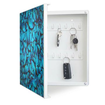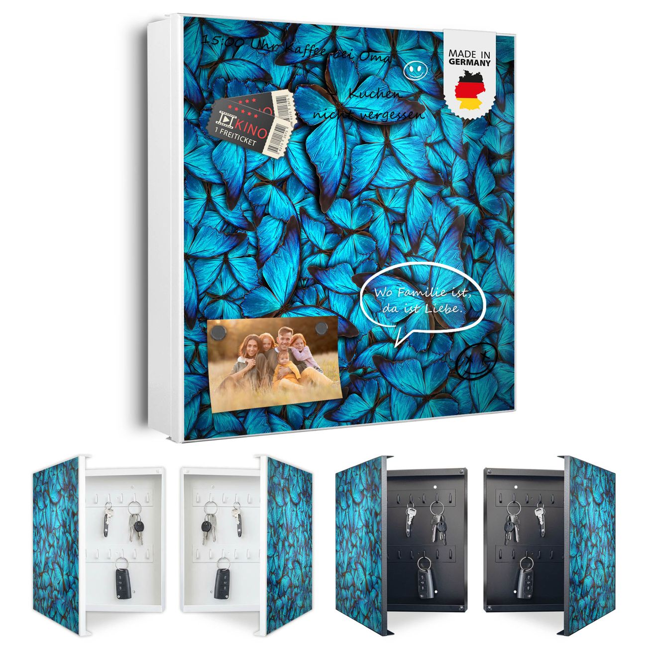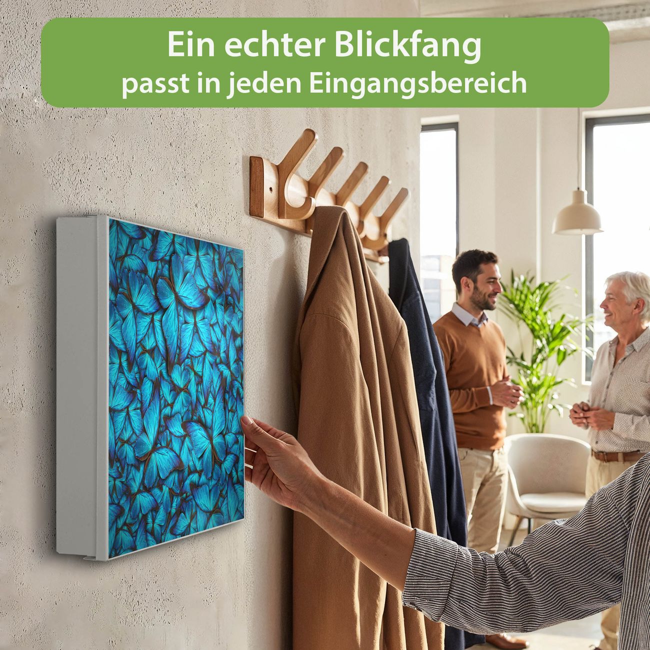 Bringe Ordnung und Eleganz in deinen Eingangsbereich mit dem banjado Schlüsselkasten Motiv Motiv Fürstliche Falter. Die moderne Schlüsselbox kombiniert funktionales Design mit hochwertiger Verarbeitung und wird so zu einem echten Hingucker in Flur, Büro oder Ferienwohnung. ✅ Stilvolle Schlüsselaufbewahrung mit Motiv Motiv Fürstliche Falter Der Design-Schlüsselkasten Motiv Motiv Fürstliche Falter bietet Platz für bis zu 32 Schlüssel, die auf 4 stabilen Reihen mit je 8 Haken übersichtlich verstaut werden. Mit seinen kompakten Maßen von 30 x 30 x 5 cm passt die Schlüsselbox perfekt auch in kleinere Räume. Der weiß lackierte Stahlkorpus mit links angeschlagenem Türscharnier harmoniert mit gedruckten Folie auf der Front und fügt sich nahtlos in jedes Wohnambiente ein. Ob als Schlüsselorganizer für Zuhause oder als praktische Lösung für Büros, Praxen und Gewerbe, der banjado Schlüsselkasten sorgt für Ordnung und Übersicht. Dank der magnetischen, mit Kreidestiften beschreibbaren Folie auf der Front kannst du Notizen anheften oder Termine direkt auf der Oberfläche festhalten. Die Schlüsselbox Motiv Motiv Fürstliche Falter zur Wandmontage wird inklusive Befestigungsmaterial geliefert und ist schnell angebracht. So hast du deine Schlüssel jederzeit griffbereit und zugleich stilvoll verstaut. Mit diesem banjado Schlüsselkasten Motiv Motiv Fürstliche Falter kombinierst du praktische Aufbewahrung mit stilvollem Wohndesign. Ob privat oder geschäftlich, die Schlüsselbox sorgt für mehr Ordnung, Übersicht und ein wohnliches Ambiente.Vorteile im Überblick