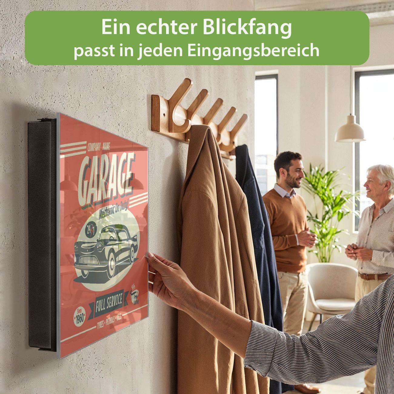 Bringe Ordnung und Eleganz in deinen Eingangsbereich mit dem banjado Schlüsselkasten Motiv Motiv Full Service. Die moderne Schlüsselbox kombiniert funktionales Design mit hochwertiger Verarbeitung und wird so zu einem echten Hingucker in Flur, Büro oder Ferienwohnung. ✅ Stilvolle Schlüsselaufbewahrung mit Glasfront im Motiv Motiv Full Service Der Design-Schlüsselkasten Motiv Motiv Full Service bietet Platz für bis zu 50 Schlüssel, die auf 5 stabilen Reihen mit je 10 Haken übersichtlich verstaut werden. Mit seinen kompakten Maßen von 30 x 30 x 5 cm passt die Schlüsselbox perfekt auch in kleinere Räume. Der schwarz lackierte Stahlkorpus mit rechts angeschlagenem Türscharnier harmoniert mit der Glasfront und fügt sich nahtlos in jedes Wohnambiente ein. Ob als Schlüsselorganizer für Zuhause oder als praktische Lösung für Büros, Praxen und Gewerbe, der banjado Schlüsselkasten sorgt für Ordnung und Übersicht. Dank der magnetischen, mit Kreidestiften beschreibbaren Glasfront kannst du Notizen anheften oder Termine direkt auf der Oberfläche festhalten. Die Schlüsselbox Motiv Motiv Full Service zur Wandmontage wird inklusive Befestigungsmaterial geliefert und ist schnell angebracht. So hast du deine Schlüssel jederzeit griffbereit und zugleich stilvoll verstaut. Mit diesem banjado Schlüsselkasten Motiv Motiv Full Service kombinierst du praktische Aufbewahrung mit stilvollem Wohndesign. Ob privat oder geschäftlich, die Schlüsselbox sorgt für mehr Ordnung, Übersicht und ein wohnliches Ambiente.Vorteile im Überblick