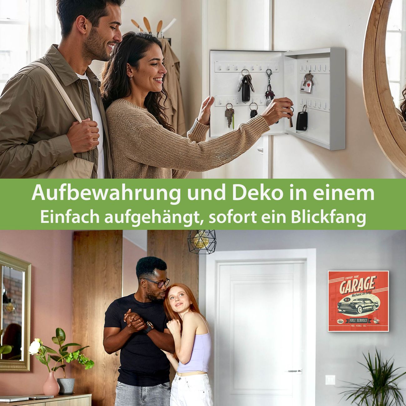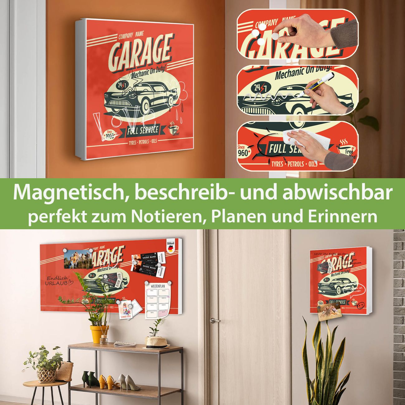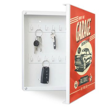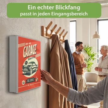 Bringe Ordnung und Eleganz in deinen Eingangsbereich mit dem banjado Schlüsselkasten Motiv Motiv Full Service. Die moderne Schlüsselbox kombiniert funktionales Design mit hochwertiger Verarbeitung und wird so zu einem echten Hingucker in Flur, Büro oder Ferienwohnung. ✅ Stilvolle Schlüsselaufbewahrung mit Motiv Motiv Full Service Der Design-Schlüsselkasten Motiv Motiv Full Service bietet Platz für bis zu 32 Schlüssel, die auf 4 stabilen Reihen mit je 8 Haken übersichtlich verstaut werden. Mit seinen kompakten Maßen von 30 x 30 x 5 cm passt die Schlüsselbox perfekt auch in kleinere Räume. Der weiß lackierte Stahlkorpus mit rechts angeschlagenem Türscharnier harmoniert mit gedruckten Folie auf der Front und fügt sich nahtlos in jedes Wohnambiente ein. Ob als Schlüsselorganizer für Zuhause oder als praktische Lösung für Büros, Praxen und Gewerbe, der banjado Schlüsselkasten sorgt für Ordnung und Übersicht. Dank der magnetischen, mit Kreidestiften beschreibbaren Folie auf der Front kannst du Notizen anheften oder Termine direkt auf der Oberfläche festhalten. Die Schlüsselbox Motiv Motiv Full Service zur Wandmontage wird inklusive Befestigungsmaterial geliefert und ist schnell angebracht. So hast du deine Schlüssel jederzeit griffbereit und zugleich stilvoll verstaut. Mit diesem banjado Schlüsselkasten Motiv Motiv Full Service kombinierst du praktische Aufbewahrung mit stilvollem Wohndesign. Ob privat oder geschäftlich, die Schlüsselbox sorgt für mehr Ordnung, Übersicht und ein wohnliches Ambiente.Vorteile im Überblick