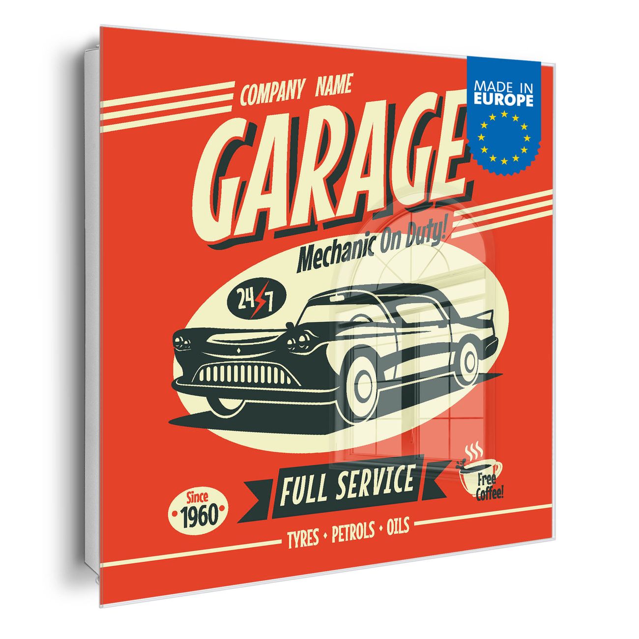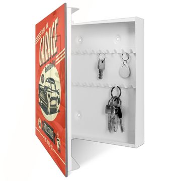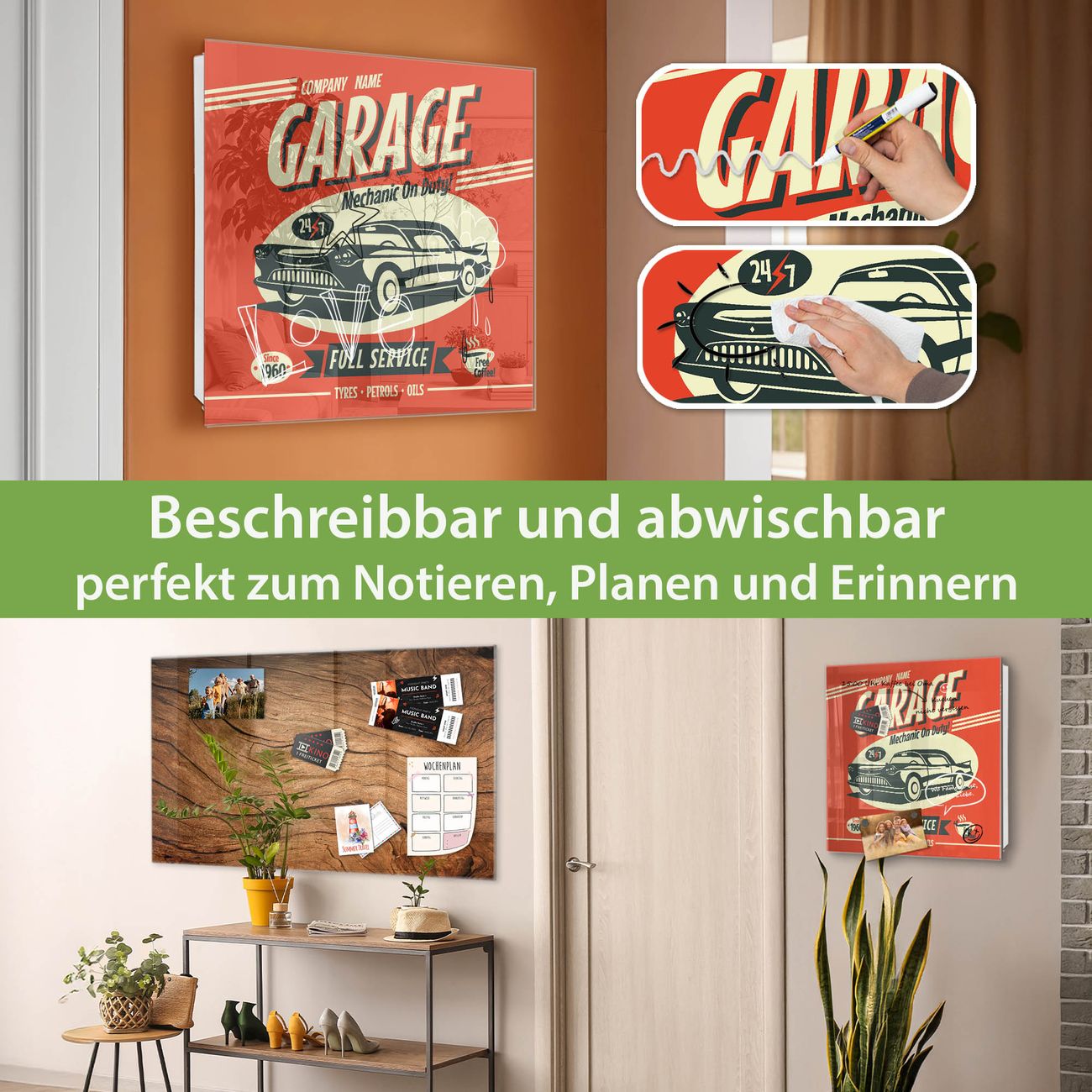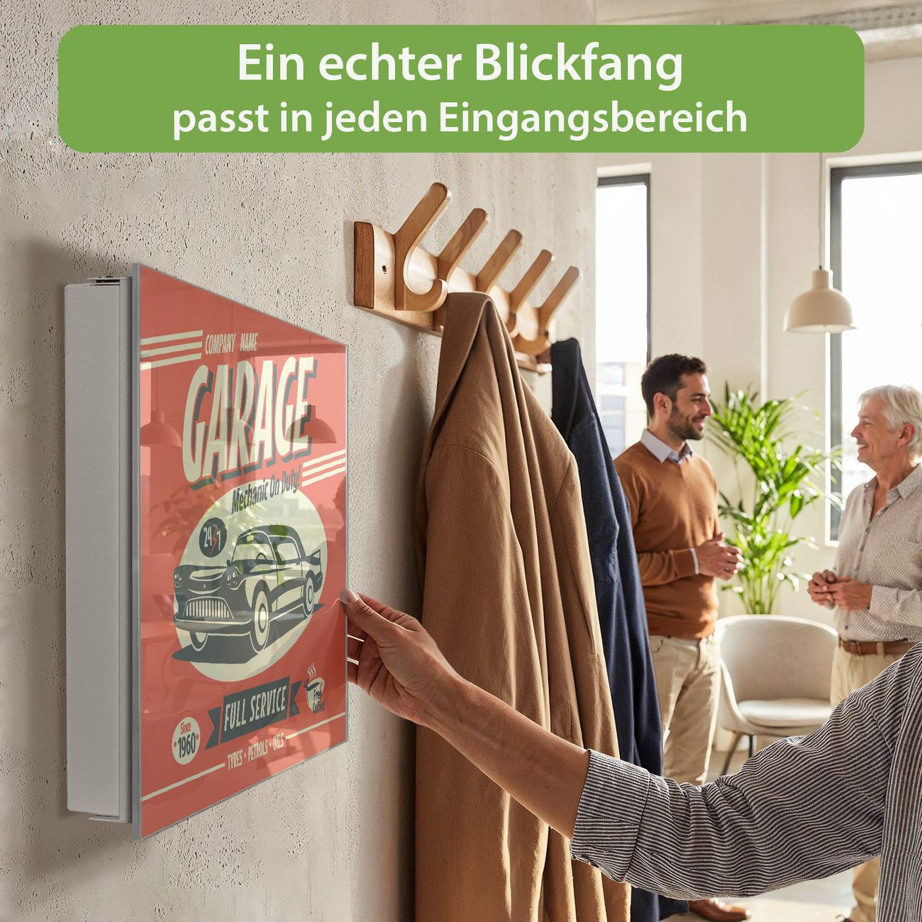 Bringe Ordnung und Eleganz in deinen Eingangsbereich mit dem banjado Schlüsselkasten Motiv Motiv Full Service. Die moderne Schlüsselbox kombiniert funktionales Design mit hochwertiger Verarbeitung und wird so zu einem echten Hingucker in Flur, Büro oder Ferienwohnung. ✅ Stilvolle Schlüsselaufbewahrung mit Glasfront im Motiv Motiv Full Service Der Design-Schlüsselkasten Motiv Motiv Full Service bietet Platz für bis zu 50 Schlüssel, die auf 5 stabilen Reihen mit je 10 Haken übersichtlich verstaut werden. Mit seinen kompakten Maßen von 30 x 30 x 5 cm passt die Schlüsselbox perfekt auch in kleinere Räume. Der weiß lackierte Stahlkorpus mit rechts angeschlagenem Türscharnier harmoniert mit der Glasfront und fügt sich nahtlos in jedes Wohnambiente ein. Ob als Schlüsselorganizer für Zuhause oder als praktische Lösung für Büros, Praxen und Gewerbe, der banjado Schlüsselkasten sorgt für Ordnung und Übersicht. Dank der magnetischen, mit Kreidestiften beschreibbaren Glasfront kannst du Notizen anheften oder Termine direkt auf der Oberfläche festhalten. Die Schlüsselbox Motiv Motiv Full Service zur Wandmontage wird inklusive Befestigungsmaterial geliefert und ist schnell angebracht. So hast du deine Schlüssel jederzeit griffbereit und zugleich stilvoll verstaut. Mit diesem banjado Schlüsselkasten Motiv Motiv Full Service kombinierst du praktische Aufbewahrung mit stilvollem Wohndesign. Ob privat oder geschäftlich, die Schlüsselbox sorgt für mehr Ordnung, Übersicht und ein wohnliches Ambiente.Vorteile im Überblick