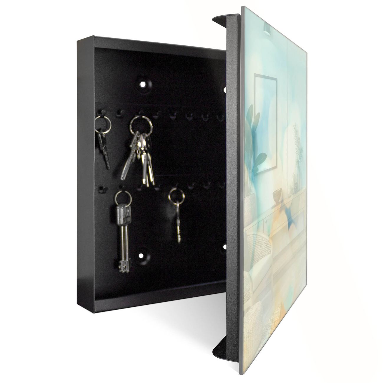 Bringe Ordnung und Eleganz in deinen Eingangsbereich mit dem banjado Schlüsselkasten Motiv Motiv Funkelnde Lichter. Die moderne Schlüsselbox kombiniert funktionales Design mit hochwertiger Verarbeitung und wird so zu einem echten Hingucker in Flur, Büro oder Ferienwohnung. ✅ Stilvolle Schlüsselaufbewahrung mit Glasfront im Motiv Motiv Funkelnde Lichter Der Design-Schlüsselkasten Motiv Motiv Funkelnde Lichter bietet Platz für bis zu 50 Schlüssel, die auf 5 stabilen Reihen mit je 10 Haken übersichtlich verstaut werden. Mit seinen kompakten Maßen von 30 x 30 x 5 cm passt die Schlüsselbox perfekt auch in kleinere Räume. Der schwarz lackierte Stahlkorpus mit rechts angeschlagenem Türscharnier harmoniert mit der Glasfront und fügt sich nahtlos in jedes Wohnambiente ein. Ob als Schlüsselorganizer für Zuhause oder als praktische Lösung für Büros, Praxen und Gewerbe, der banjado Schlüsselkasten sorgt für Ordnung und Übersicht. Dank der magnetischen, mit Kreidestiften beschreibbaren Glasfront kannst du Notizen anheften oder Termine direkt auf der Oberfläche festhalten. Die Schlüsselbox Motiv Motiv Funkelnde Lichter zur Wandmontage wird inklusive Befestigungsmaterial geliefert und ist schnell angebracht. So hast du deine Schlüssel jederzeit griffbereit und zugleich stilvoll verstaut. Mit diesem banjado Schlüsselkasten Motiv Motiv Funkelnde Lichter kombinierst du praktische Aufbewahrung mit stilvollem Wohndesign. Ob privat oder geschäftlich, die Schlüsselbox sorgt für mehr Ordnung, Übersicht und ein wohnliches Ambiente.Vorteile im Überblick