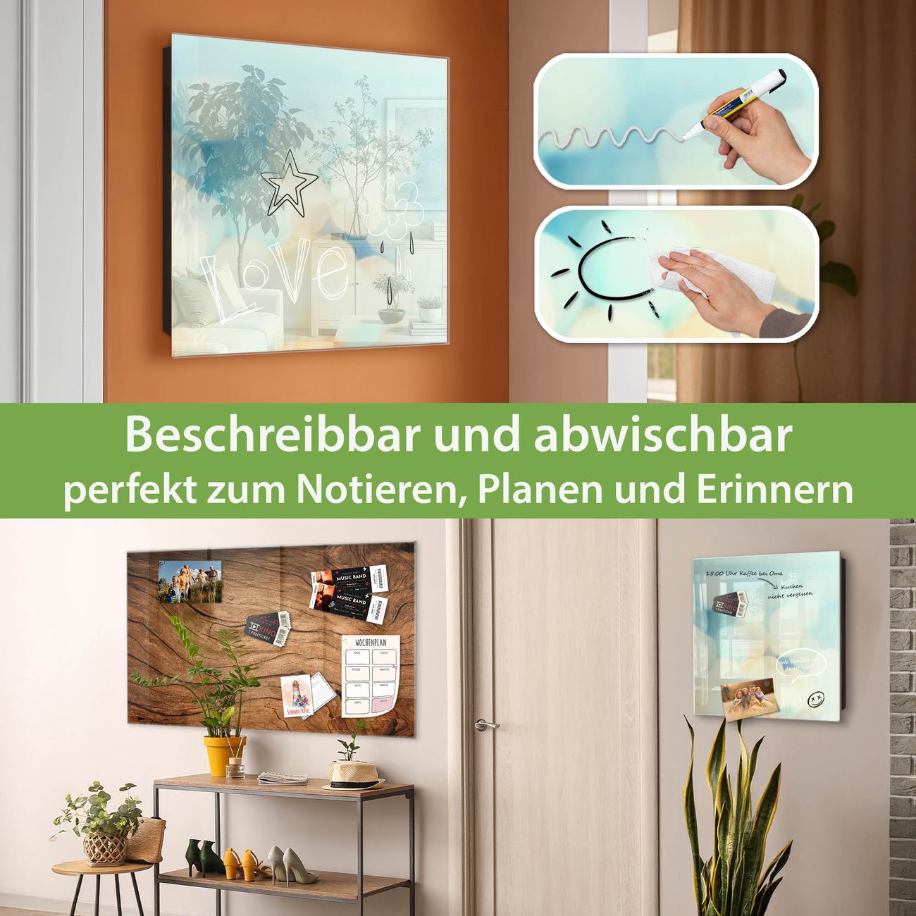 ✅ Magnetisch und mit Kreidestift beschreibbar, gehärtetes Glas, rechts angeschlagene TürOrdnung und Design in einem