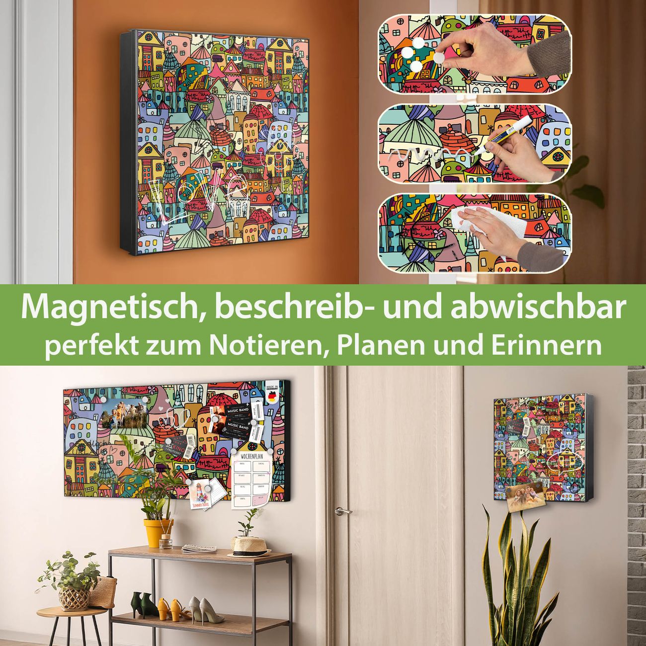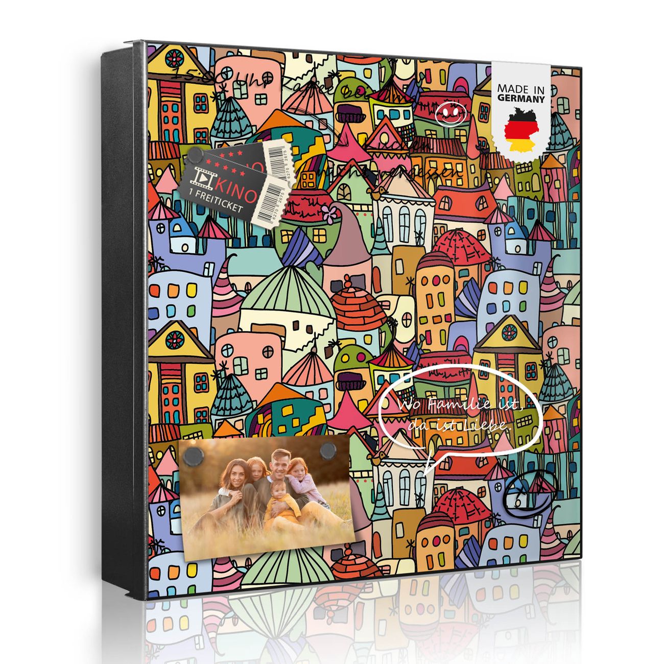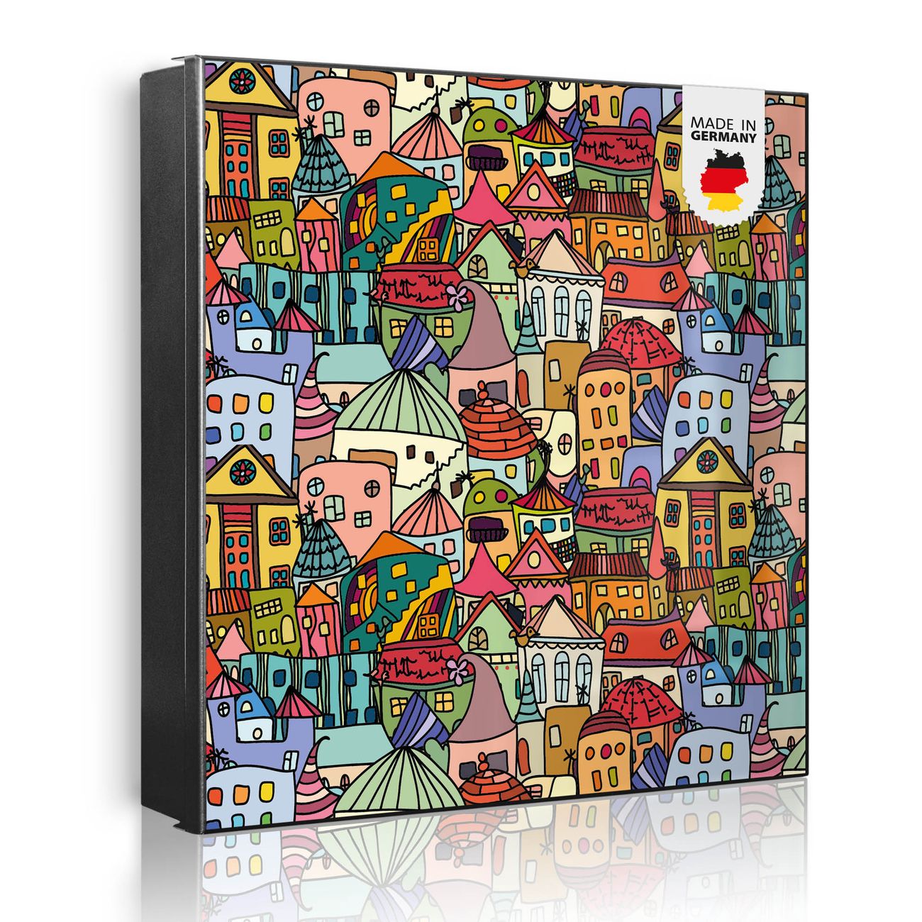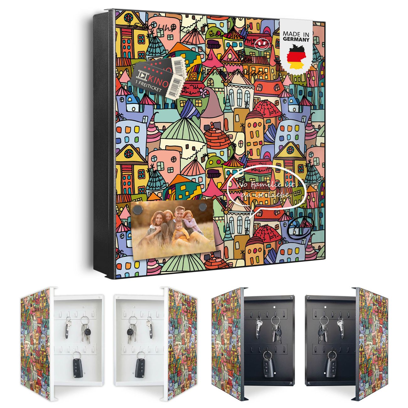 Bringe Ordnung und Eleganz in deinen Eingangsbereich mit dem banjado Schlüsselkasten Motiv Motiv Funky Town. Die moderne Schlüsselbox kombiniert funktionales Design mit hochwertiger Verarbeitung und wird so zu einem echten Hingucker in Flur, Büro oder Ferienwohnung. ✅ Stilvolle Schlüsselaufbewahrung mit Motiv Motiv Funky Town Der Design-Schlüsselkasten Motiv Motiv Funky Town bietet Platz für bis zu 32 Schlüssel, die auf 4 stabilen Reihen mit je 8 Haken übersichtlich verstaut werden. Mit seinen kompakten Maßen von 30 x 30 x 5 cm passt die Schlüsselbox perfekt auch in kleinere Räume. Der schwarz lackierte Stahlkorpus mit rechts angeschlagenem Türscharnier harmoniert mit gedruckten Folie auf der Front und fügt sich nahtlos in jedes Wohnambiente ein. Ob als Schlüsselorganizer für Zuhause oder als praktische Lösung für Büros, Praxen und Gewerbe, der banjado Schlüsselkasten sorgt für Ordnung und Übersicht. Dank der magnetischen, mit Kreidestiften beschreibbaren Folie auf der Front kannst du Notizen anheften oder Termine direkt auf der Oberfläche festhalten. Die Schlüsselbox Motiv Motiv Funky Town zur Wandmontage wird inklusive Befestigungsmaterial geliefert und ist schnell angebracht. So hast du deine Schlüssel jederzeit griffbereit und zugleich stilvoll verstaut. Mit diesem banjado Schlüsselkasten Motiv Motiv Funky Town kombinierst du praktische Aufbewahrung mit stilvollem Wohndesign. Ob privat oder geschäftlich, die Schlüsselbox sorgt für mehr Ordnung, Übersicht und ein wohnliches Ambiente.Vorteile im Überblick