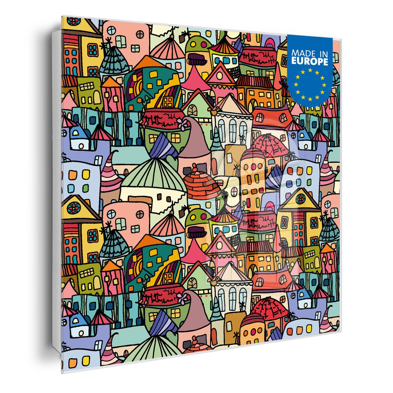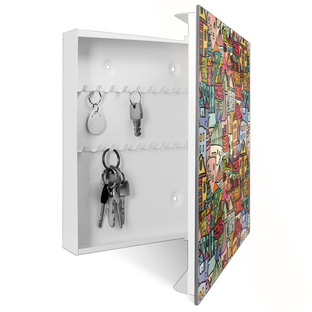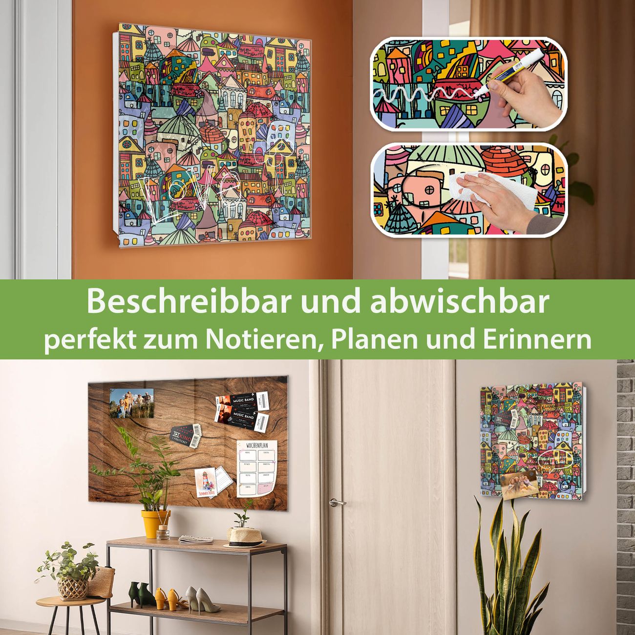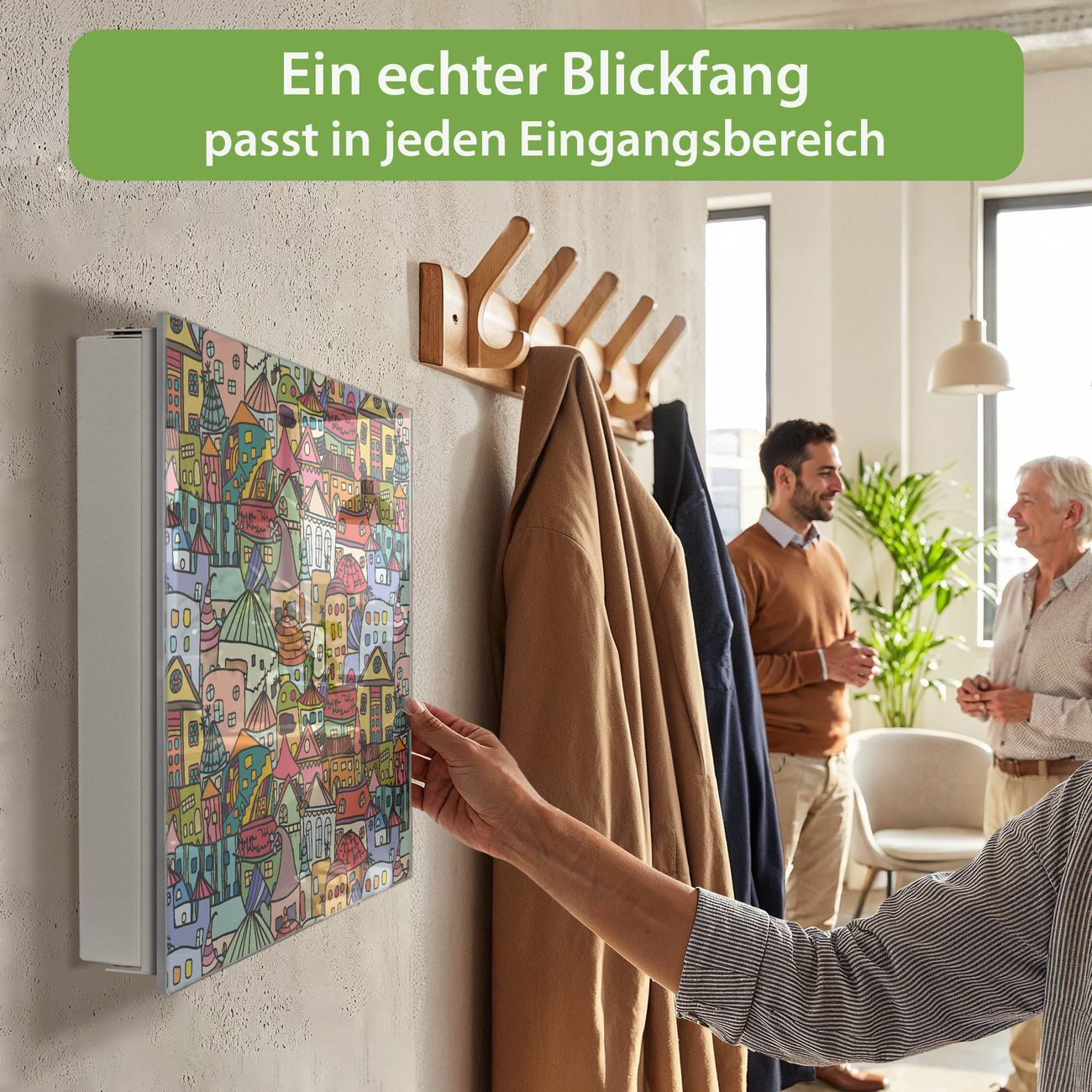 Bringe Ordnung und Eleganz in deinen Eingangsbereich mit dem banjado Schlüsselkasten Motiv Motiv Funky Town. Die moderne Schlüsselbox kombiniert funktionales Design mit hochwertiger Verarbeitung und wird so zu einem echten Hingucker in Flur, Büro oder Ferienwohnung. ✅ Stilvolle Schlüsselaufbewahrung mit Glasfront im Motiv Motiv Funky Town Der Design-Schlüsselkasten Motiv Motiv Funky Town bietet Platz für bis zu 50 Schlüssel, die auf 5 stabilen Reihen mit je 10 Haken übersichtlich verstaut werden. Mit seinen kompakten Maßen von 30 x 30 x 5 cm passt die Schlüsselbox perfekt auch in kleinere Räume. Der weiß lackierte Stahlkorpus mit rechts angeschlagenem Türscharnier harmoniert mit der Glasfront und fügt sich nahtlos in jedes Wohnambiente ein. Ob als Schlüsselorganizer für Zuhause oder als praktische Lösung für Büros, Praxen und Gewerbe, der banjado Schlüsselkasten sorgt für Ordnung und Übersicht. Dank der magnetischen, mit Kreidestiften beschreibbaren Glasfront kannst du Notizen anheften oder Termine direkt auf der Oberfläche festhalten. Die Schlüsselbox Motiv Motiv Funky Town zur Wandmontage wird inklusive Befestigungsmaterial geliefert und ist schnell angebracht. So hast du deine Schlüssel jederzeit griffbereit und zugleich stilvoll verstaut. Mit diesem banjado Schlüsselkasten Motiv Motiv Funky Town kombinierst du praktische Aufbewahrung mit stilvollem Wohndesign. Ob privat oder geschäftlich, die Schlüsselbox sorgt für mehr Ordnung, Übersicht und ein wohnliches Ambiente.Vorteile im Überblick