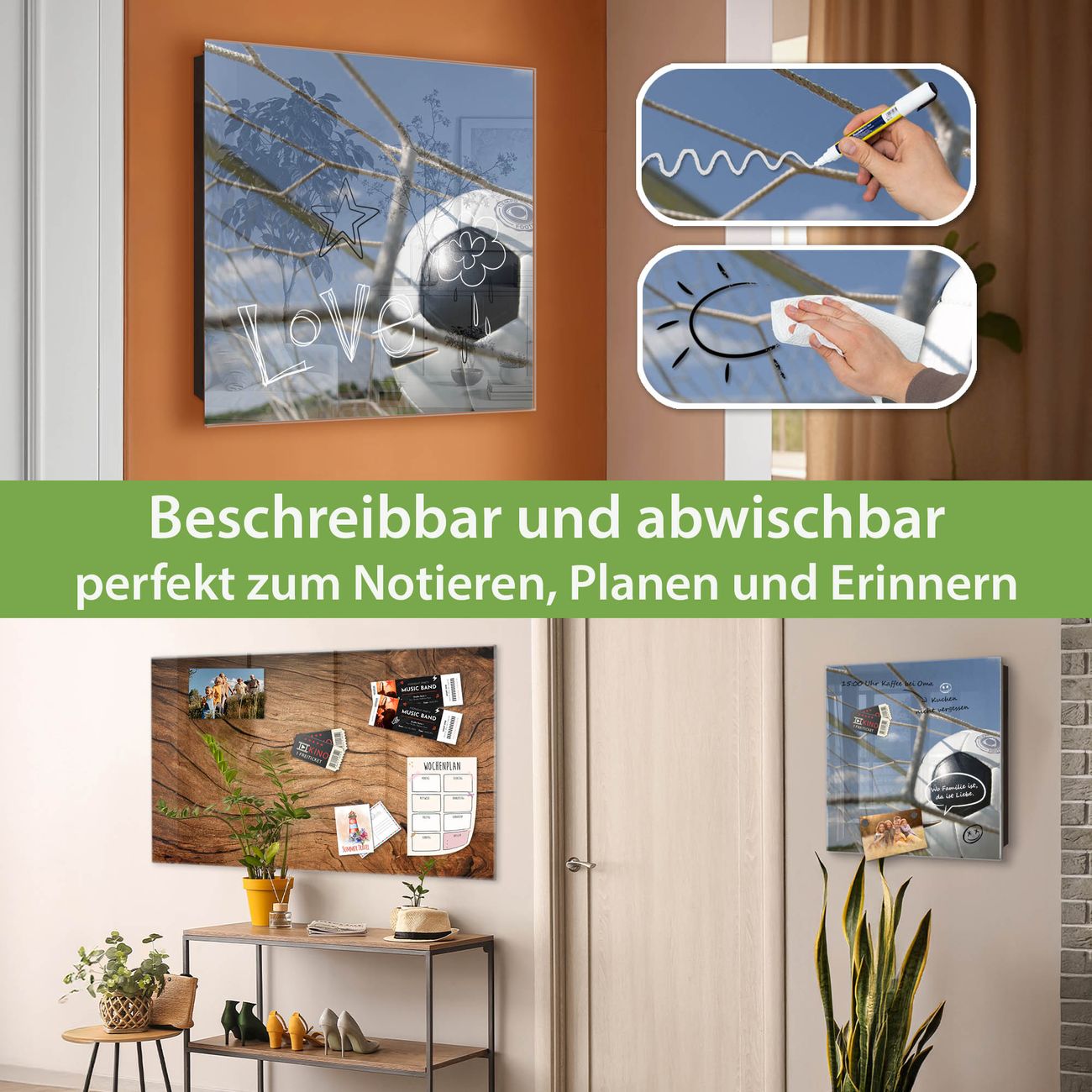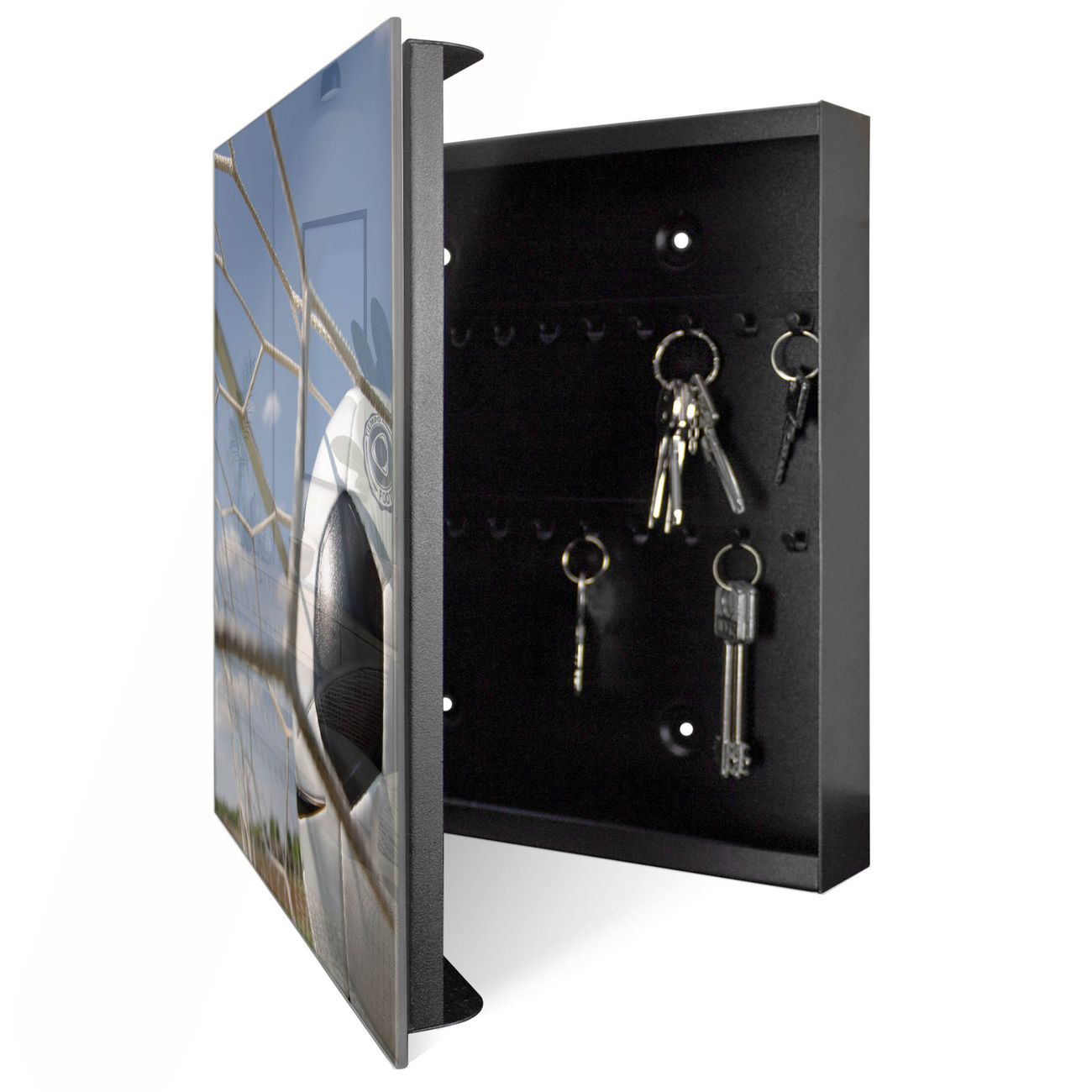 Bringe Ordnung und Eleganz in deinen Eingangsbereich mit dem banjado Schlüsselkasten Motiv Motiv Fußball. Die moderne Schlüsselbox kombiniert funktionales Design mit hochwertiger Verarbeitung und wird so zu einem echten Hingucker in Flur, Büro oder Ferienwohnung. ✅ Stilvolle Schlüsselaufbewahrung mit Glasfront im Motiv Motiv Fußball Der Design-Schlüsselkasten Motiv Motiv Fußball bietet Platz für bis zu 50 Schlüssel, die auf 5 stabilen Reihen mit je 10 Haken übersichtlich verstaut werden. Mit seinen kompakten Maßen von 30 x 30 x 5 cm passt die Schlüsselbox perfekt auch in kleinere Räume. Der schwarz lackierte Stahlkorpus mit rechts angeschlagenem Türscharnier harmoniert mit der Glasfront und fügt sich nahtlos in jedes Wohnambiente ein. Ob als Schlüsselorganizer für Zuhause oder als praktische Lösung für Büros, Praxen und Gewerbe, der banjado Schlüsselkasten sorgt für Ordnung und Übersicht. Dank der magnetischen, mit Kreidestiften beschreibbaren Glasfront kannst du Notizen anheften oder Termine direkt auf der Oberfläche festhalten. Die Schlüsselbox Motiv Motiv Fußball zur Wandmontage wird inklusive Befestigungsmaterial geliefert und ist schnell angebracht. So hast du deine Schlüssel jederzeit griffbereit und zugleich stilvoll verstaut. Mit diesem banjado Schlüsselkasten Motiv Motiv Fußball kombinierst du praktische Aufbewahrung mit stilvollem Wohndesign. Ob privat oder geschäftlich, die Schlüsselbox sorgt für mehr Ordnung, Übersicht und ein wohnliches Ambiente.Vorteile im Überblick