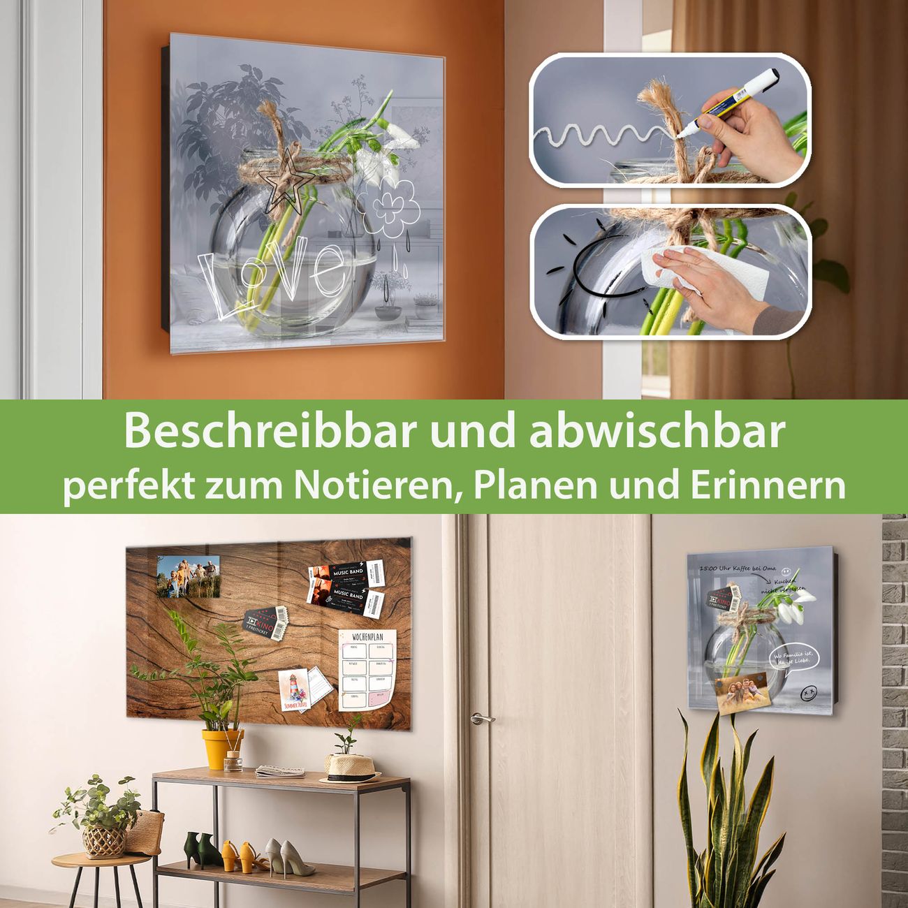 Bringe Ordnung und Eleganz in deinen Eingangsbereich mit dem banjado Schlüsselkasten Motiv Motiv Gänseblümchen im Glas. Die moderne Schlüsselbox kombiniert funktionales Design mit hochwertiger Verarbeitung und wird so zu einem echten Hingucker in Flur, Büro oder Ferienwohnung. ✅ Stilvolle Schlüsselaufbewahrung mit Glasfront im Motiv Motiv Gänseblümchen im Glas Der Design-Schlüsselkasten Motiv Motiv Gänseblümchen im Glas bietet Platz für bis zu 50 Schlüssel, die auf 5 stabilen Reihen mit je 10 Haken übersichtlich verstaut werden. Mit seinen kompakten Maßen von 30 x 30 x 5 cm passt die Schlüsselbox perfekt auch in kleinere Räume. Der schwarz lackierte Stahlkorpus mit rechts angeschlagenem Türscharnier harmoniert mit der Glasfront und fügt sich nahtlos in jedes Wohnambiente ein. Ob als Schlüsselorganizer für Zuhause oder als praktische Lösung für Büros, Praxen und Gewerbe, der banjado Schlüsselkasten sorgt für Ordnung und Übersicht. Dank der magnetischen, mit Kreidestiften beschreibbaren Glasfront kannst du Notizen anheften oder Termine direkt auf der Oberfläche festhalten. Die Schlüsselbox Motiv Motiv Gänseblümchen im Glas zur Wandmontage wird inklusive Befestigungsmaterial geliefert und ist schnell angebracht. So hast du deine Schlüssel jederzeit griffbereit und zugleich stilvoll verstaut. Mit diesem banjado Schlüsselkasten Motiv Motiv Gänseblümchen im Glas kombinierst du praktische Aufbewahrung mit stilvollem Wohndesign. Ob privat oder geschäftlich, die Schlüsselbox sorgt für mehr Ordnung, Übersicht und ein wohnliches Ambiente.Vorteile im Überblick