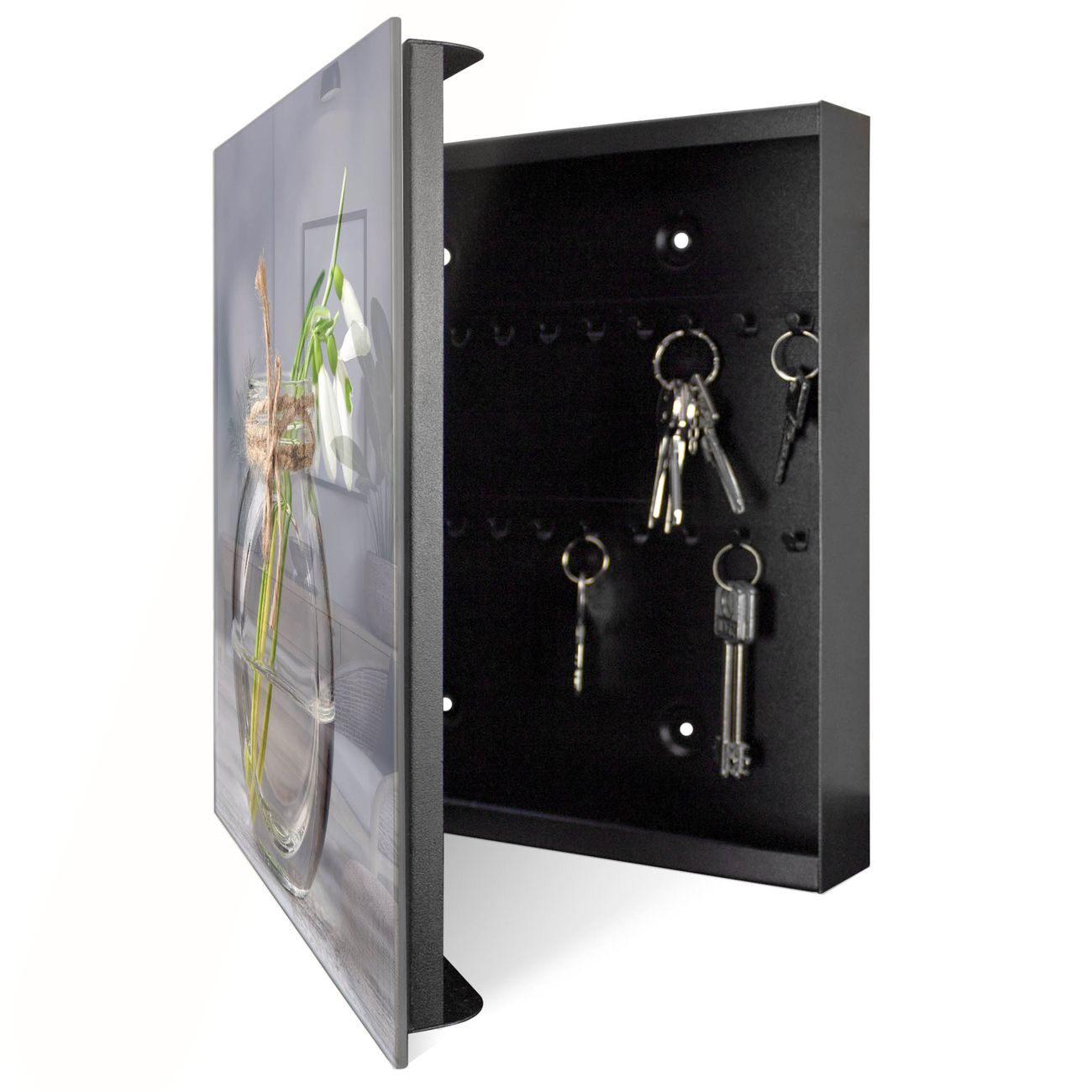 Bringe Ordnung und Eleganz in deinen Eingangsbereich mit dem banjado Schlüsselkasten Motiv Motiv Gänseblümchen im Glas. Die moderne Schlüsselbox kombiniert funktionales Design mit hochwertiger Verarbeitung und wird so zu einem echten Hingucker in Flur, Büro oder Ferienwohnung. ✅ Stilvolle Schlüsselaufbewahrung mit Glasfront im Motiv Motiv Gänseblümchen im Glas Der Design-Schlüsselkasten Motiv Motiv Gänseblümchen im Glas bietet Platz für bis zu 50 Schlüssel, die auf 5 stabilen Reihen mit je 10 Haken übersichtlich verstaut werden. Mit seinen kompakten Maßen von 30 x 30 x 5 cm passt die Schlüsselbox perfekt auch in kleinere Räume. Der schwarz lackierte Stahlkorpus mit rechts angeschlagenem Türscharnier harmoniert mit der Glasfront und fügt sich nahtlos in jedes Wohnambiente ein. Ob als Schlüsselorganizer für Zuhause oder als praktische Lösung für Büros, Praxen und Gewerbe, der banjado Schlüsselkasten sorgt für Ordnung und Übersicht. Dank der magnetischen, mit Kreidestiften beschreibbaren Glasfront kannst du Notizen anheften oder Termine direkt auf der Oberfläche festhalten. Die Schlüsselbox Motiv Motiv Gänseblümchen im Glas zur Wandmontage wird inklusive Befestigungsmaterial geliefert und ist schnell angebracht. So hast du deine Schlüssel jederzeit griffbereit und zugleich stilvoll verstaut. Mit diesem banjado Schlüsselkasten Motiv Motiv Gänseblümchen im Glas kombinierst du praktische Aufbewahrung mit stilvollem Wohndesign. Ob privat oder geschäftlich, die Schlüsselbox sorgt für mehr Ordnung, Übersicht und ein wohnliches Ambiente.Vorteile im Überblick