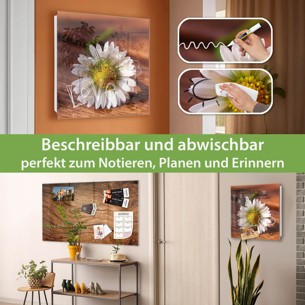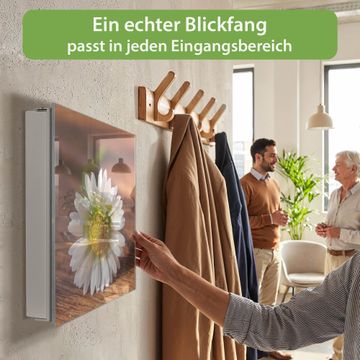 Bringe Ordnung und Eleganz in deinen Eingangsbereich mit dem banjado Schlüsselkasten Motiv Motiv Gänseblümchen. Die moderne Schlüsselbox kombiniert funktionales Design mit hochwertiger Verarbeitung und wird so zu einem echten Hingucker in Flur, Büro oder Ferienwohnung. ✅ Stilvolle Schlüsselaufbewahrung mit Glasfront im Motiv Motiv Gänseblümchen Der Design-Schlüsselkasten Motiv Motiv Gänseblümchen bietet Platz für bis zu 50 Schlüssel, die auf 5 stabilen Reihen mit je 10 Haken übersichtlich verstaut werden. Mit seinen kompakten Maßen von 30 x 30 x 5 cm passt die Schlüsselbox perfekt auch in kleinere Räume. Der weiß lackierte Stahlkorpus mit rechts angeschlagenem Türscharnier harmoniert mit der Glasfront und fügt sich nahtlos in jedes Wohnambiente ein. Ob als Schlüsselorganizer für Zuhause oder als praktische Lösung für Büros, Praxen und Gewerbe, der banjado Schlüsselkasten sorgt für Ordnung und Übersicht. Dank der magnetischen, mit Kreidestiften beschreibbaren Glasfront kannst du Notizen anheften oder Termine direkt auf der Oberfläche festhalten. Die Schlüsselbox Motiv Motiv Gänseblümchen zur Wandmontage wird inklusive Befestigungsmaterial geliefert und ist schnell angebracht. So hast du deine Schlüssel jederzeit griffbereit und zugleich stilvoll verstaut. Mit diesem banjado Schlüsselkasten Motiv Motiv Gänseblümchen kombinierst du praktische Aufbewahrung mit stilvollem Wohndesign. Ob privat oder geschäftlich, die Schlüsselbox sorgt für mehr Ordnung, Übersicht und ein wohnliches Ambiente.Vorteile im Überblick