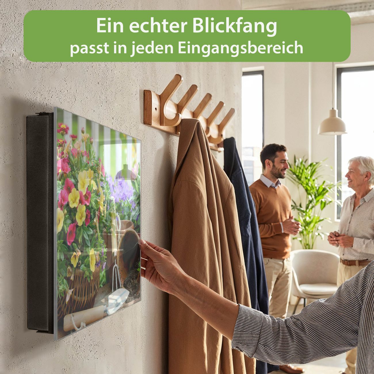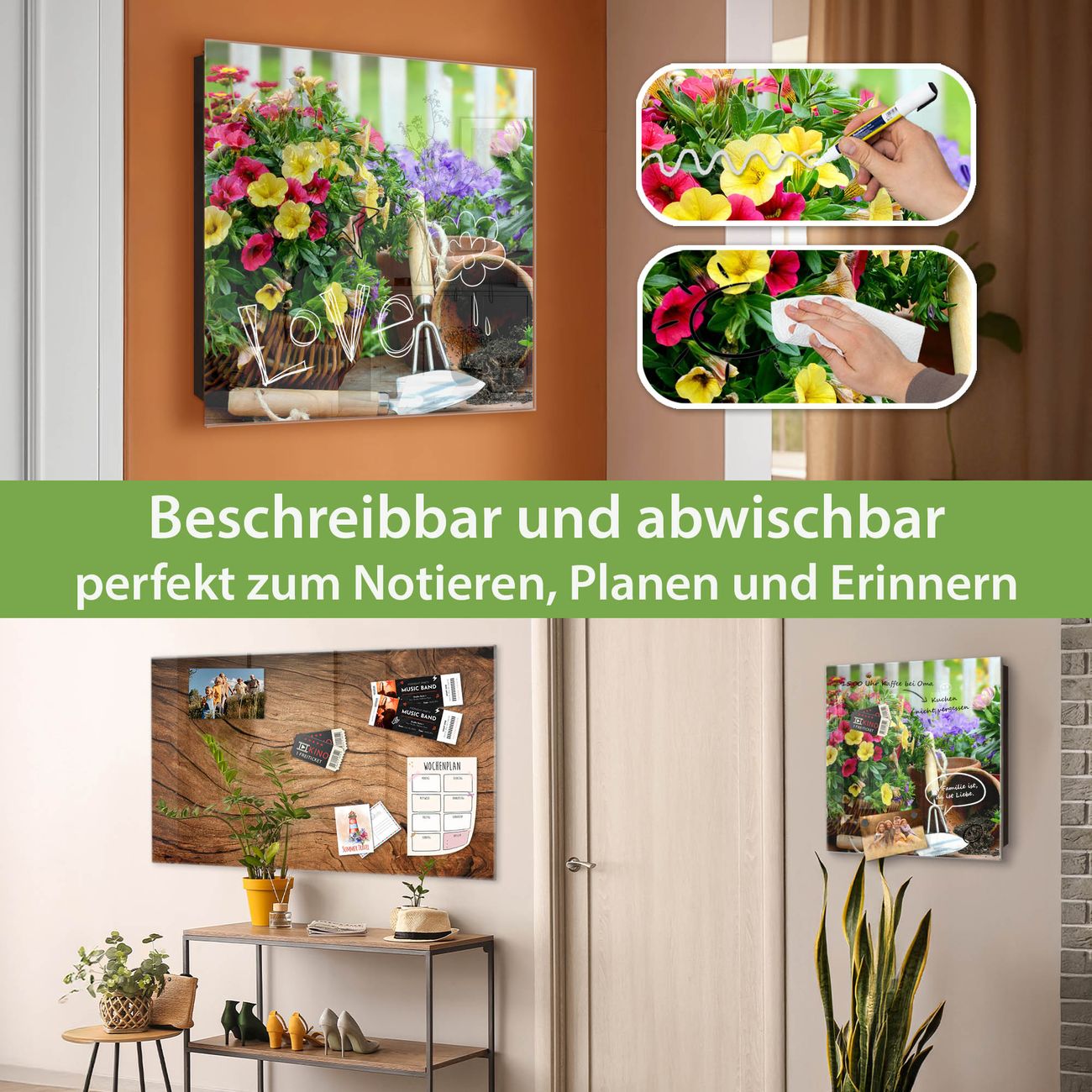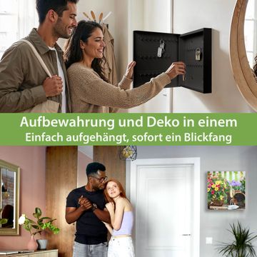 Bringe Ordnung und Eleganz in deinen Eingangsbereich mit dem banjado Schlüsselkasten Motiv Motiv Gartenfreude. Die moderne Schlüsselbox kombiniert funktionales Design mit hochwertiger Verarbeitung und wird so zu einem echten Hingucker in Flur, Büro oder Ferienwohnung. ✅ Stilvolle Schlüsselaufbewahrung mit Glasfront im Motiv Motiv Gartenfreude Der Design-Schlüsselkasten Motiv Motiv Gartenfreude bietet Platz für bis zu 50 Schlüssel, die auf 5 stabilen Reihen mit je 10 Haken übersichtlich verstaut werden. Mit seinen kompakten Maßen von 30 x 30 x 5 cm passt die Schlüsselbox perfekt auch in kleinere Räume. Der schwarz lackierte Stahlkorpus mit rechts angeschlagenem Türscharnier harmoniert mit der Glasfront und fügt sich nahtlos in jedes Wohnambiente ein. Ob als Schlüsselorganizer für Zuhause oder als praktische Lösung für Büros, Praxen und Gewerbe, der banjado Schlüsselkasten sorgt für Ordnung und Übersicht. Dank der magnetischen, mit Kreidestiften beschreibbaren Glasfront kannst du Notizen anheften oder Termine direkt auf der Oberfläche festhalten. Die Schlüsselbox Motiv Motiv Gartenfreude zur Wandmontage wird inklusive Befestigungsmaterial geliefert und ist schnell angebracht. So hast du deine Schlüssel jederzeit griffbereit und zugleich stilvoll verstaut. Mit diesem banjado Schlüsselkasten Motiv Motiv Gartenfreude kombinierst du praktische Aufbewahrung mit stilvollem Wohndesign. Ob privat oder geschäftlich, die Schlüsselbox sorgt für mehr Ordnung, Übersicht und ein wohnliches Ambiente.Vorteile im Überblick