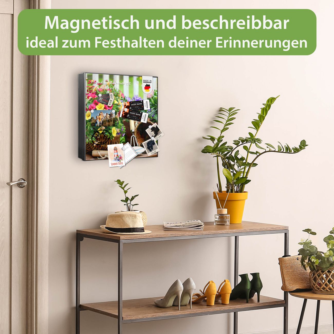 Bringe Ordnung und Eleganz in deinen Eingangsbereich mit dem banjado Schlüsselkasten Motiv Motiv Gartenfreude. Die moderne Schlüsselbox kombiniert funktionales Design mit hochwertiger Verarbeitung und wird so zu einem echten Hingucker in Flur, Büro oder Ferienwohnung. ✅ Stilvolle Schlüsselaufbewahrung mit Motiv Motiv Gartenfreude Der Design-Schlüsselkasten Motiv Motiv Gartenfreude bietet Platz für bis zu 32 Schlüssel, die auf 4 stabilen Reihen mit je 8 Haken übersichtlich verstaut werden. Mit seinen kompakten Maßen von 30 x 30 x 5 cm passt die Schlüsselbox perfekt auch in kleinere Räume. Der schwarz lackierte Stahlkorpus mit rechts angeschlagenem Türscharnier harmoniert mit gedruckten Folie auf der Front und fügt sich nahtlos in jedes Wohnambiente ein. Ob als Schlüsselorganizer für Zuhause oder als praktische Lösung für Büros, Praxen und Gewerbe, der banjado Schlüsselkasten sorgt für Ordnung und Übersicht. Dank der magnetischen, mit Kreidestiften beschreibbaren Folie auf der Front kannst du Notizen anheften oder Termine direkt auf der Oberfläche festhalten. Die Schlüsselbox Motiv Motiv Gartenfreude zur Wandmontage wird inklusive Befestigungsmaterial geliefert und ist schnell angebracht. So hast du deine Schlüssel jederzeit griffbereit und zugleich stilvoll verstaut. Mit diesem banjado Schlüsselkasten Motiv Motiv Gartenfreude kombinierst du praktische Aufbewahrung mit stilvollem Wohndesign. Ob privat oder geschäftlich, die Schlüsselbox sorgt für mehr Ordnung, Übersicht und ein wohnliches Ambiente.Vorteile im Überblick
