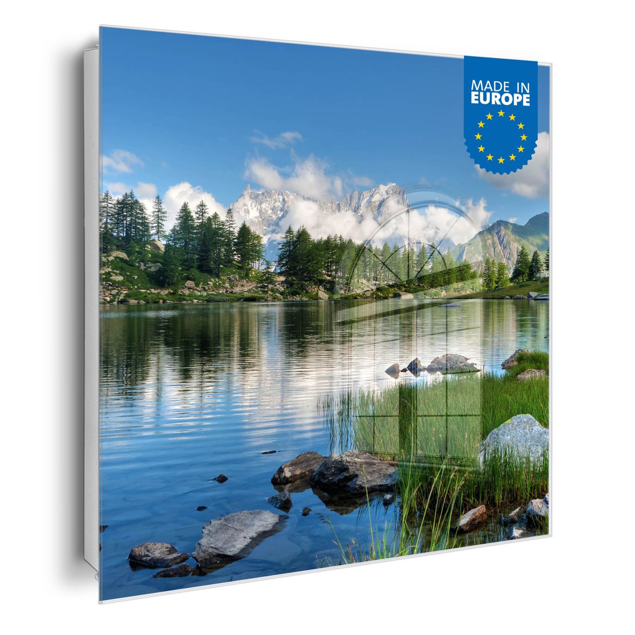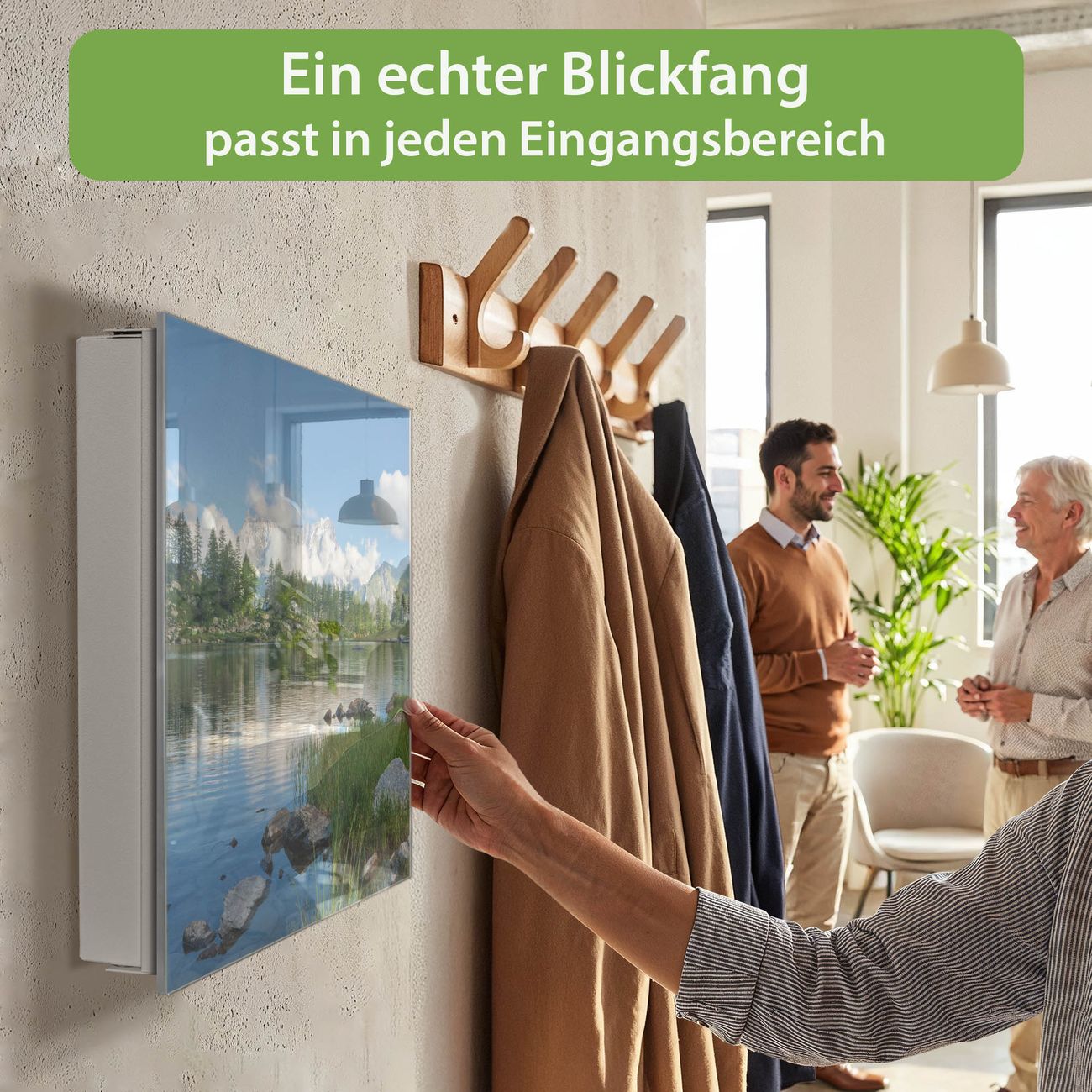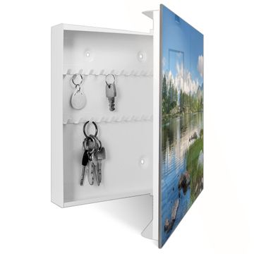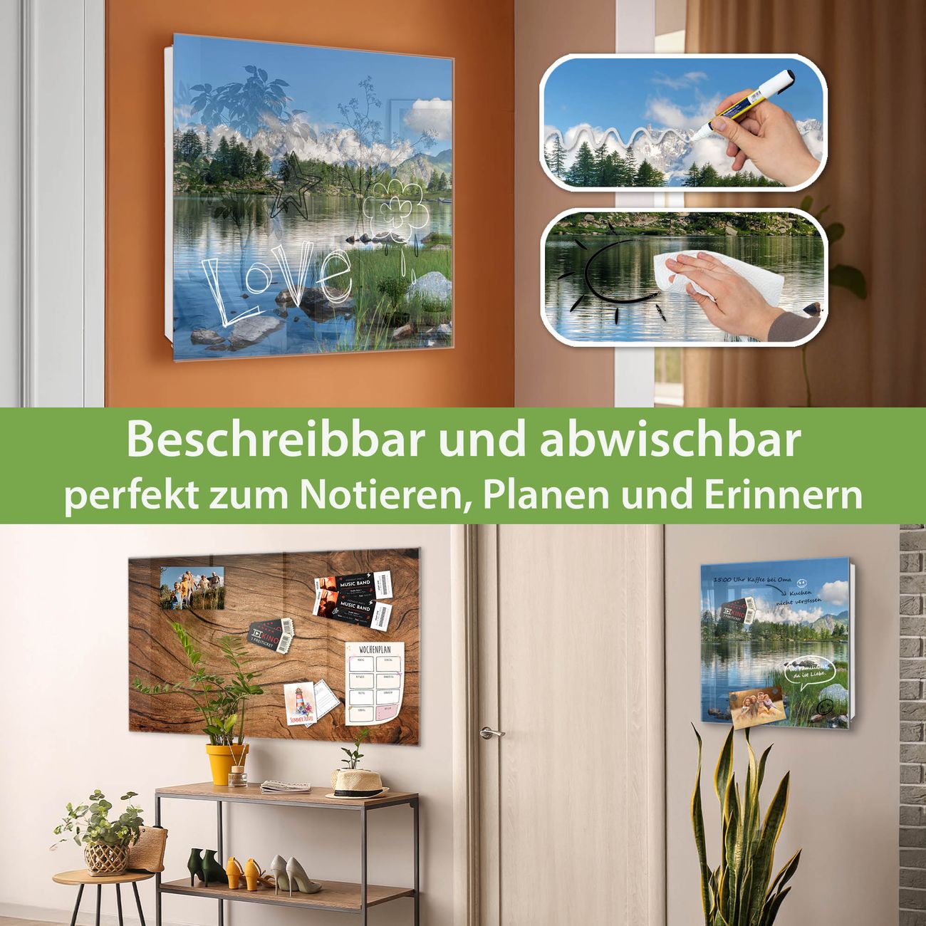 Bringe Ordnung und Eleganz in deinen Eingangsbereich mit dem banjado Schlüsselkasten Motiv Motiv Gebirgssee. Die moderne Schlüsselbox kombiniert funktionales Design mit hochwertiger Verarbeitung und wird so zu einem echten Hingucker in Flur, Büro oder Ferienwohnung. ✅ Stilvolle Schlüsselaufbewahrung mit Glasfront im Motiv Motiv Gebirgssee Der Design-Schlüsselkasten Motiv Motiv Gebirgssee bietet Platz für bis zu 50 Schlüssel, die auf 5 stabilen Reihen mit je 10 Haken übersichtlich verstaut werden. Mit seinen kompakten Maßen von 30 x 30 x 5 cm passt die Schlüsselbox perfekt auch in kleinere Räume. Der weiß lackierte Stahlkorpus mit rechts angeschlagenem Türscharnier harmoniert mit der Glasfront und fügt sich nahtlos in jedes Wohnambiente ein. Ob als Schlüsselorganizer für Zuhause oder als praktische Lösung für Büros, Praxen und Gewerbe, der banjado Schlüsselkasten sorgt für Ordnung und Übersicht. Dank der magnetischen, mit Kreidestiften beschreibbaren Glasfront kannst du Notizen anheften oder Termine direkt auf der Oberfläche festhalten. Die Schlüsselbox Motiv Motiv Gebirgssee zur Wandmontage wird inklusive Befestigungsmaterial geliefert und ist schnell angebracht. So hast du deine Schlüssel jederzeit griffbereit und zugleich stilvoll verstaut. Mit diesem banjado Schlüsselkasten Motiv Motiv Gebirgssee kombinierst du praktische Aufbewahrung mit stilvollem Wohndesign. Ob privat oder geschäftlich, die Schlüsselbox sorgt für mehr Ordnung, Übersicht und ein wohnliches Ambiente.Vorteile im Überblick
