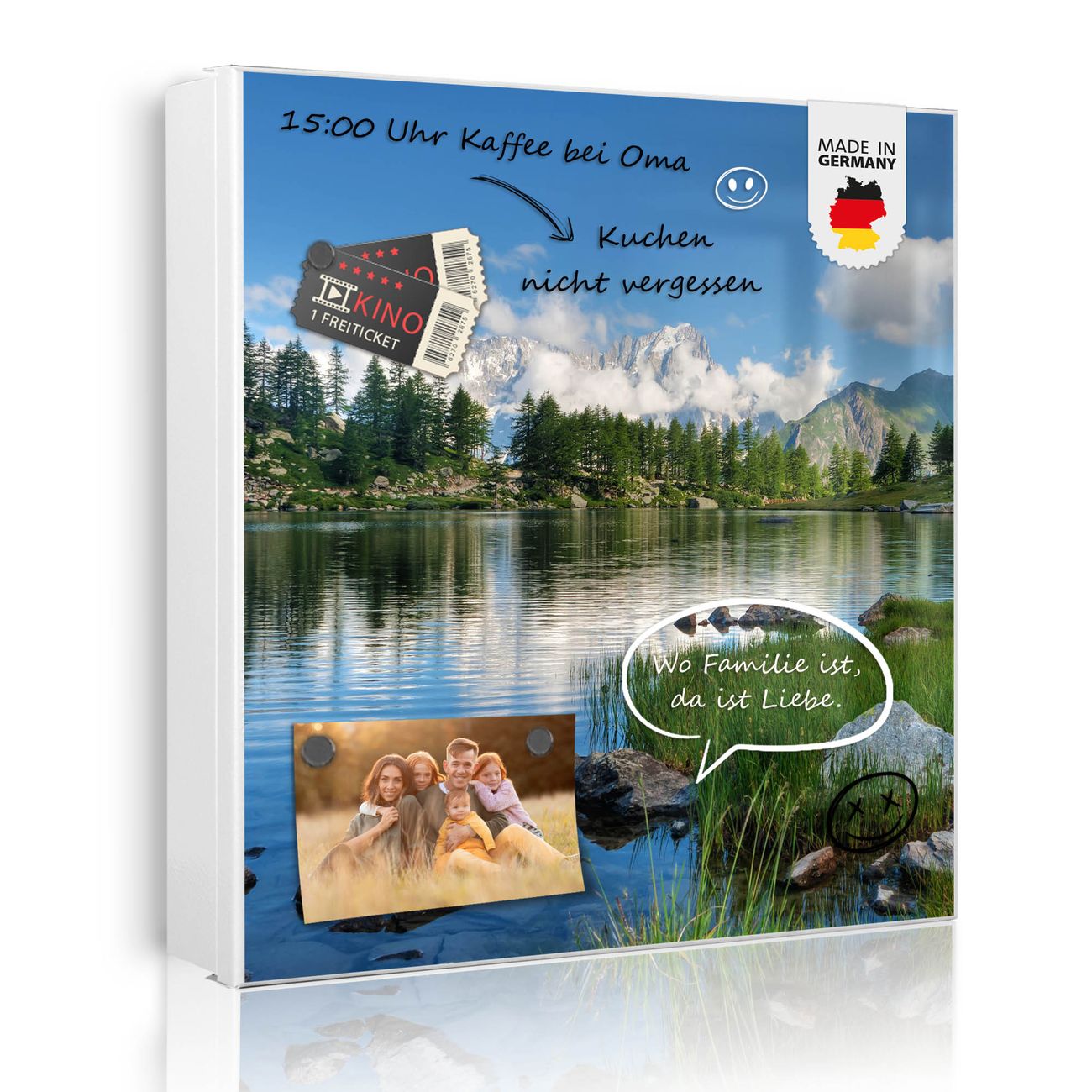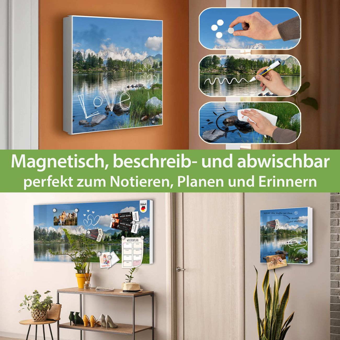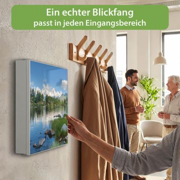 Bringe Ordnung und Eleganz in deinen Eingangsbereich mit dem banjado Schlüsselkasten Motiv Motiv Gebirgssee. Die moderne Schlüsselbox kombiniert funktionales Design mit hochwertiger Verarbeitung und wird so zu einem echten Hingucker in Flur, Büro oder Ferienwohnung. ✅ Stilvolle Schlüsselaufbewahrung mit Motiv Motiv Gebirgssee Der Design-Schlüsselkasten Motiv Motiv Gebirgssee bietet Platz für bis zu 32 Schlüssel, die auf 4 stabilen Reihen mit je 8 Haken übersichtlich verstaut werden. Mit seinen kompakten Maßen von 30 x 30 x 5 cm passt die Schlüsselbox perfekt auch in kleinere Räume. Der weiß lackierte Stahlkorpus mit rechts angeschlagenem Türscharnier harmoniert mit gedruckten Folie auf der Front und fügt sich nahtlos in jedes Wohnambiente ein. Ob als Schlüsselorganizer für Zuhause oder als praktische Lösung für Büros, Praxen und Gewerbe, der banjado Schlüsselkasten sorgt für Ordnung und Übersicht. Dank der magnetischen, mit Kreidestiften beschreibbaren Folie auf der Front kannst du Notizen anheften oder Termine direkt auf der Oberfläche festhalten. Die Schlüsselbox Motiv Motiv Gebirgssee zur Wandmontage wird inklusive Befestigungsmaterial geliefert und ist schnell angebracht. So hast du deine Schlüssel jederzeit griffbereit und zugleich stilvoll verstaut. Mit diesem banjado Schlüsselkasten Motiv Motiv Gebirgssee kombinierst du praktische Aufbewahrung mit stilvollem Wohndesign. Ob privat oder geschäftlich, die Schlüsselbox sorgt für mehr Ordnung, Übersicht und ein wohnliches Ambiente.Vorteile im Überblick