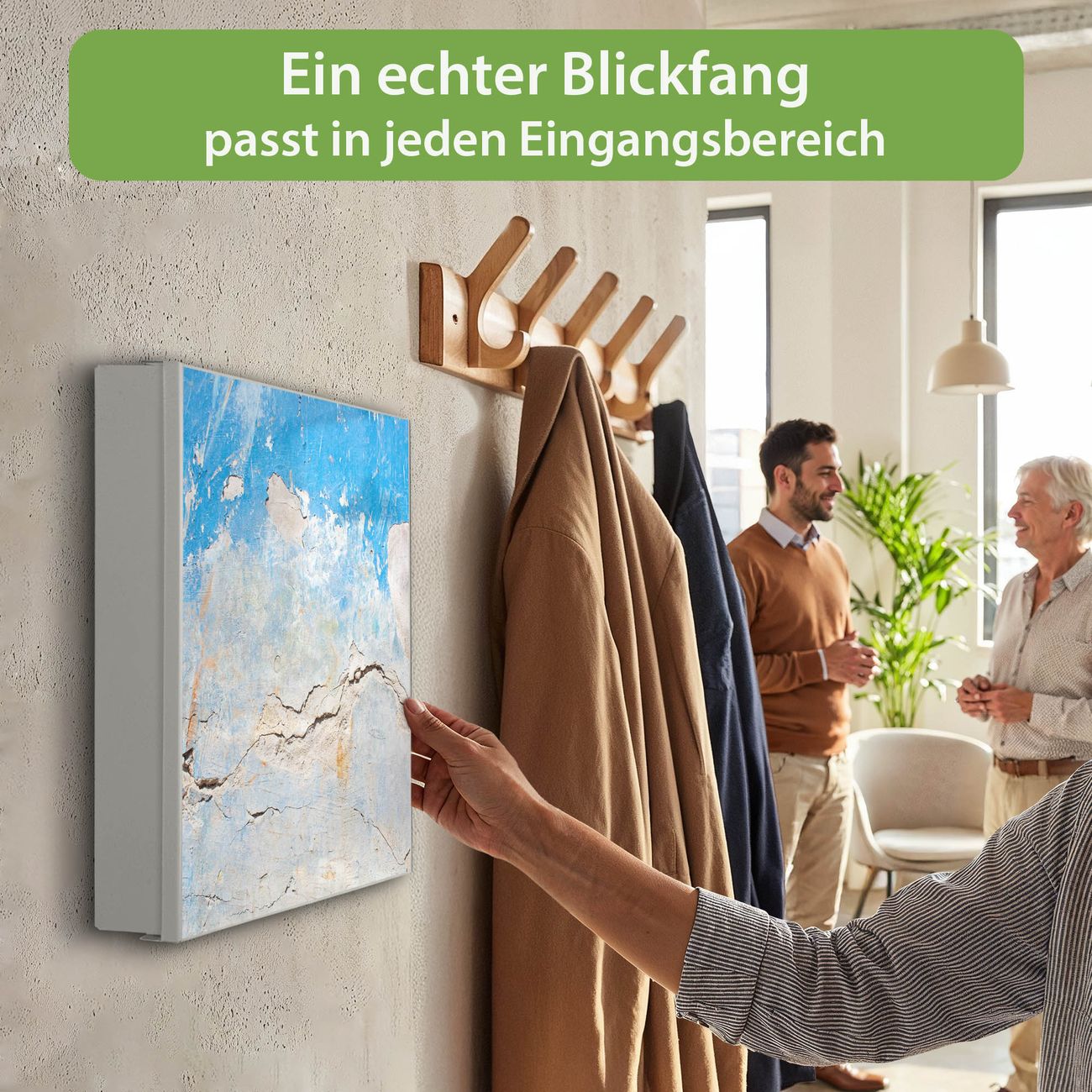Bringe Ordnung und Eleganz in deinen Eingangsbereich mit dem banjado Schlüsselkasten Motiv Motiv Gebrochene Wand. Die moderne Schlüsselbox kombiniert funktionales Design mit hochwertiger Verarbeitung und wird so zu einem echten Hingucker in Flur, Büro oder Ferienwohnung. ✅ Stilvolle Schlüsselaufbewahrung mit Motiv Motiv Gebrochene Wand Der Design-Schlüsselkasten Motiv Motiv Gebrochene Wand bietet Platz für bis zu 32 Schlüssel, die auf 4 stabilen Reihen mit je 8 Haken übersichtlich verstaut werden. Mit seinen kompakten Maßen von 30 x 30 x 5 cm passt die Schlüsselbox perfekt auch in kleinere Räume. Der weiß lackierte Stahlkorpus mit rechts angeschlagenem Türscharnier harmoniert mit gedruckten Folie auf der Front und fügt sich nahtlos in jedes Wohnambiente ein. Ob als Schlüsselorganizer für Zuhause oder als praktische Lösung für Büros, Praxen und Gewerbe, der banjado Schlüsselkasten sorgt für Ordnung und Übersicht. Dank der magnetischen, mit Kreidestiften beschreibbaren Folie auf der Front kannst du Notizen anheften oder Termine direkt auf der Oberfläche festhalten. Die Schlüsselbox Motiv Motiv Gebrochene Wand zur Wandmontage wird inklusive Befestigungsmaterial geliefert und ist schnell angebracht. So hast du deine Schlüssel jederzeit griffbereit und zugleich stilvoll verstaut. Mit diesem banjado Schlüsselkasten Motiv Motiv Gebrochene Wand kombinierst du praktische Aufbewahrung mit stilvollem Wohndesign. Ob privat oder geschäftlich, die Schlüsselbox sorgt für mehr Ordnung, Übersicht und ein wohnliches Ambiente.Vorteile im Überblick