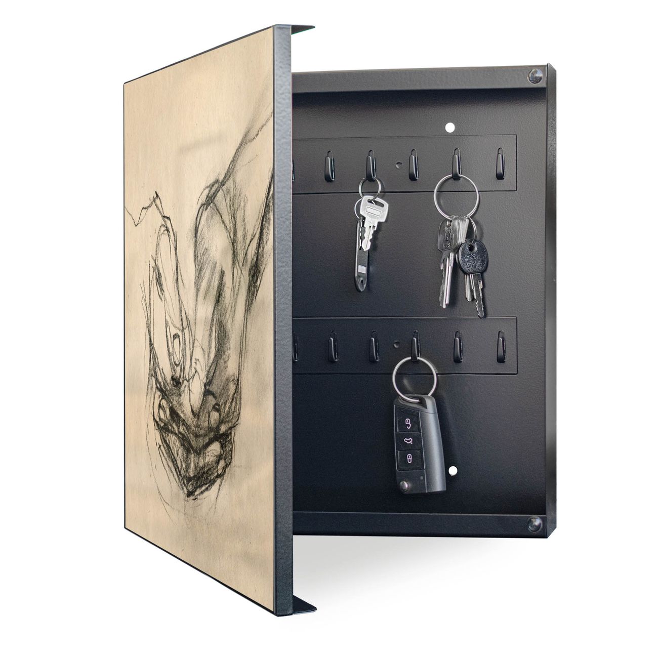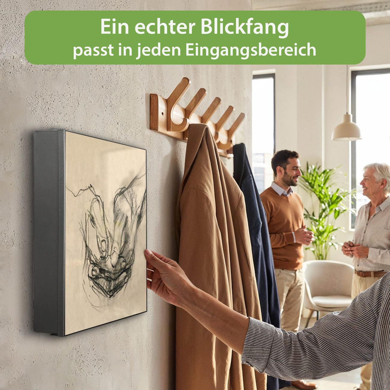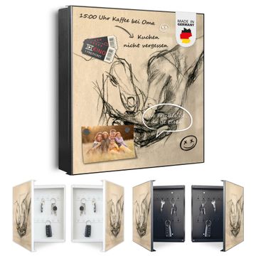 Bringe Ordnung und Eleganz in deinen Eingangsbereich mit dem banjado Schlüsselkasten Motiv Motiv Gefaltete Hände. Die moderne Schlüsselbox kombiniert funktionales Design mit hochwertiger Verarbeitung und wird so zu einem echten Hingucker in Flur, Büro oder Ferienwohnung. ✅ Stilvolle Schlüsselaufbewahrung mit Motiv Motiv Gefaltete Hände Der Design-Schlüsselkasten Motiv Motiv Gefaltete Hände bietet Platz für bis zu 32 Schlüssel, die auf 4 stabilen Reihen mit je 8 Haken übersichtlich verstaut werden. Mit seinen kompakten Maßen von 30 x 30 x 5 cm passt die Schlüsselbox perfekt auch in kleinere Räume. Der schwarz lackierte Stahlkorpus mit links angeschlagenem Türscharnier harmoniert mit gedruckten Folie auf der Front und fügt sich nahtlos in jedes Wohnambiente ein. Ob als Schlüsselorganizer für Zuhause oder als praktische Lösung für Büros, Praxen und Gewerbe, der banjado Schlüsselkasten sorgt für Ordnung und Übersicht. Dank der magnetischen, mit Kreidestiften beschreibbaren Folie auf der Front kannst du Notizen anheften oder Termine direkt auf der Oberfläche festhalten. Die Schlüsselbox Motiv Motiv Gefaltete Hände zur Wandmontage wird inklusive Befestigungsmaterial geliefert und ist schnell angebracht. So hast du deine Schlüssel jederzeit griffbereit und zugleich stilvoll verstaut. Mit diesem banjado Schlüsselkasten Motiv Motiv Gefaltete Hände kombinierst du praktische Aufbewahrung mit stilvollem Wohndesign. Ob privat oder geschäftlich, die Schlüsselbox sorgt für mehr Ordnung, Übersicht und ein wohnliches Ambiente.Vorteile im Überblick
