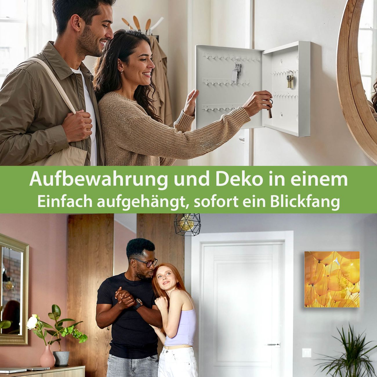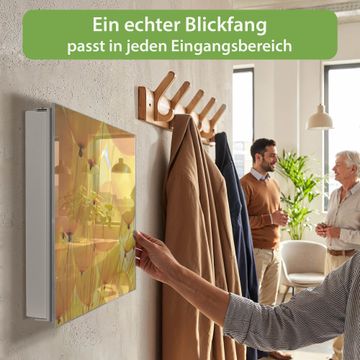 Bringe Ordnung und Eleganz in deinen Eingangsbereich mit dem banjado Schlüsselkasten Motiv Motiv Gelbe Luftballons. Die moderne Schlüsselbox kombiniert funktionales Design mit hochwertiger Verarbeitung und wird so zu einem echten Hingucker in Flur, Büro oder Ferienwohnung. ✅ Stilvolle Schlüsselaufbewahrung mit Glasfront im Motiv Motiv Gelbe Luftballons Der Design-Schlüsselkasten Motiv Motiv Gelbe Luftballons bietet Platz für bis zu 50 Schlüssel, die auf 5 stabilen Reihen mit je 10 Haken übersichtlich verstaut werden. Mit seinen kompakten Maßen von 30 x 30 x 5 cm passt die Schlüsselbox perfekt auch in kleinere Räume. Der weiß lackierte Stahlkorpus mit rechts angeschlagenem Türscharnier harmoniert mit der Glasfront und fügt sich nahtlos in jedes Wohnambiente ein. Ob als Schlüsselorganizer für Zuhause oder als praktische Lösung für Büros, Praxen und Gewerbe, der banjado Schlüsselkasten sorgt für Ordnung und Übersicht. Dank der magnetischen, mit Kreidestiften beschreibbaren Glasfront kannst du Notizen anheften oder Termine direkt auf der Oberfläche festhalten. Die Schlüsselbox Motiv Motiv Gelbe Luftballons zur Wandmontage wird inklusive Befestigungsmaterial geliefert und ist schnell angebracht. So hast du deine Schlüssel jederzeit griffbereit und zugleich stilvoll verstaut. Mit diesem banjado Schlüsselkasten Motiv Motiv Gelbe Luftballons kombinierst du praktische Aufbewahrung mit stilvollem Wohndesign. Ob privat oder geschäftlich, die Schlüsselbox sorgt für mehr Ordnung, Übersicht und ein wohnliches Ambiente.Vorteile im Überblick