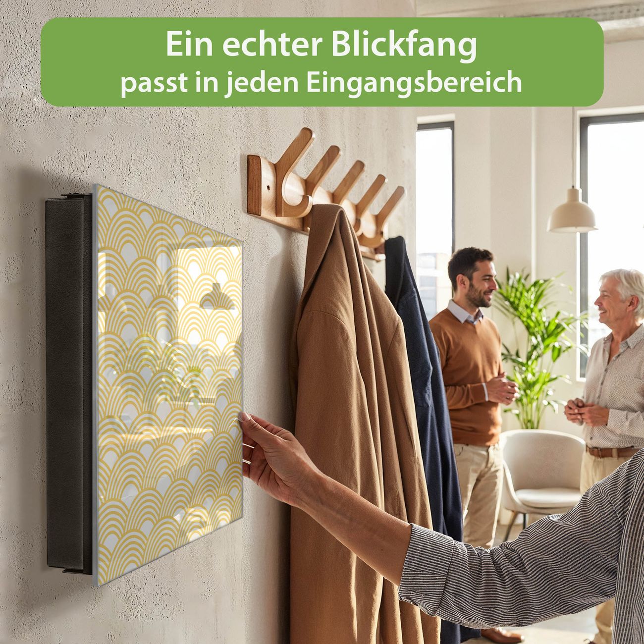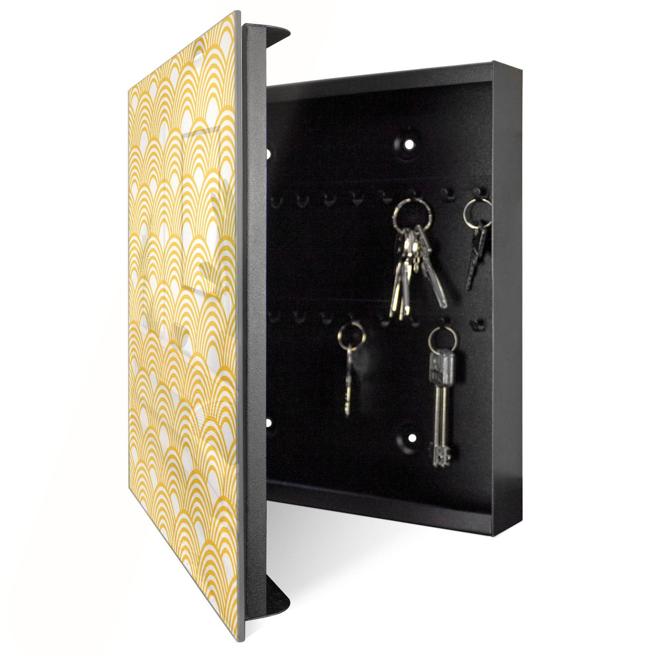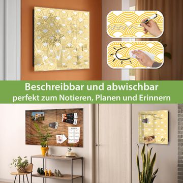 Bringe Ordnung und Eleganz in deinen Eingangsbereich mit dem banjado Schlüsselkasten Motiv Motiv Gelbe Wellen. Die moderne Schlüsselbox kombiniert funktionales Design mit hochwertiger Verarbeitung und wird so zu einem echten Hingucker in Flur, Büro oder Ferienwohnung. ✅ Stilvolle Schlüsselaufbewahrung mit Glasfront im Motiv Motiv Gelbe Wellen Der Design-Schlüsselkasten Motiv Motiv Gelbe Wellen bietet Platz für bis zu 50 Schlüssel, die auf 5 stabilen Reihen mit je 10 Haken übersichtlich verstaut werden. Mit seinen kompakten Maßen von 30 x 30 x 5 cm passt die Schlüsselbox perfekt auch in kleinere Räume. Der schwarz lackierte Stahlkorpus mit rechts angeschlagenem Türscharnier harmoniert mit der Glasfront und fügt sich nahtlos in jedes Wohnambiente ein. Ob als Schlüsselorganizer für Zuhause oder als praktische Lösung für Büros, Praxen und Gewerbe, der banjado Schlüsselkasten sorgt für Ordnung und Übersicht. Dank der magnetischen, mit Kreidestiften beschreibbaren Glasfront kannst du Notizen anheften oder Termine direkt auf der Oberfläche festhalten. Die Schlüsselbox Motiv Motiv Gelbe Wellen zur Wandmontage wird inklusive Befestigungsmaterial geliefert und ist schnell angebracht. So hast du deine Schlüssel jederzeit griffbereit und zugleich stilvoll verstaut. Mit diesem banjado Schlüsselkasten Motiv Motiv Gelbe Wellen kombinierst du praktische Aufbewahrung mit stilvollem Wohndesign. Ob privat oder geschäftlich, die Schlüsselbox sorgt für mehr Ordnung, Übersicht und ein wohnliches Ambiente.Vorteile im Überblick