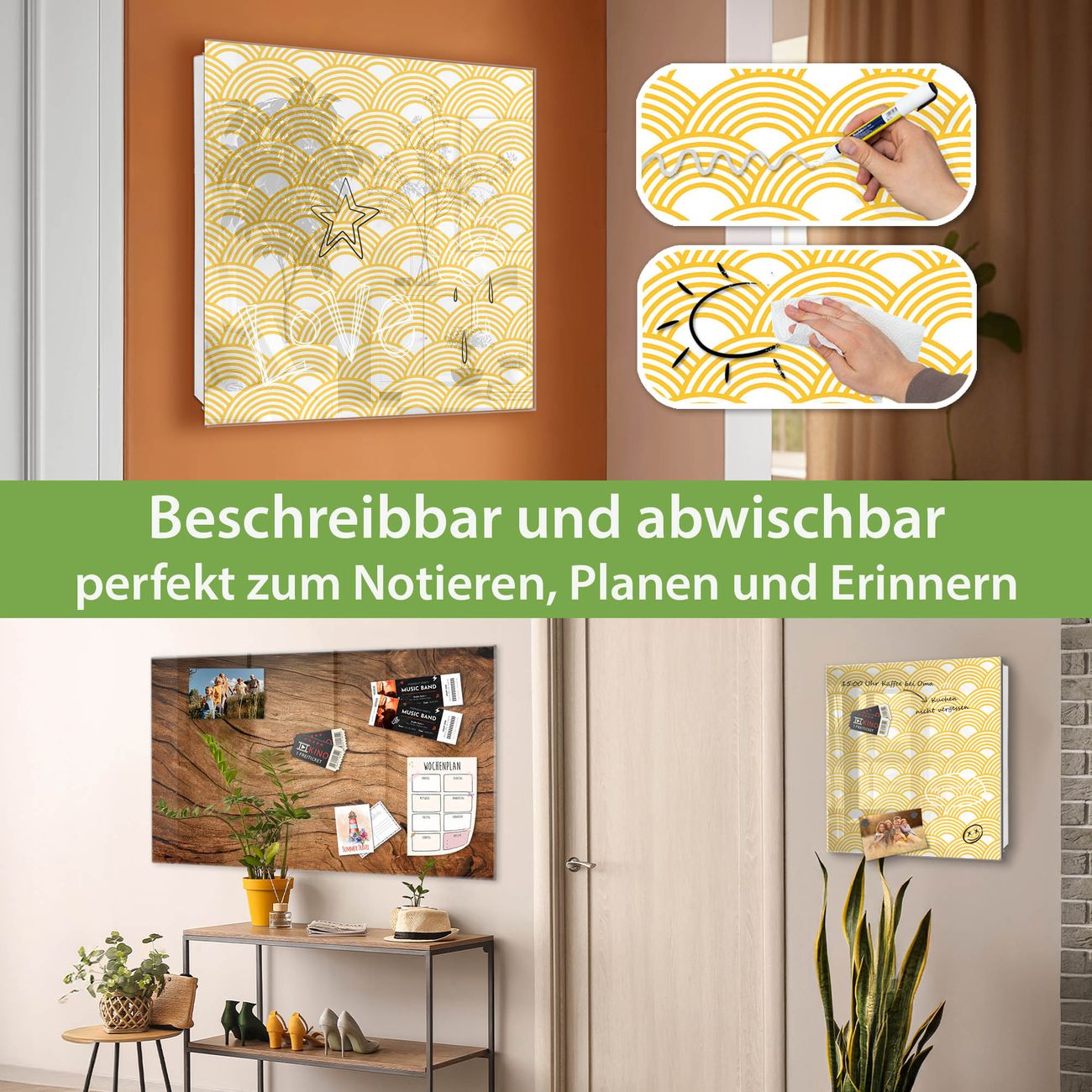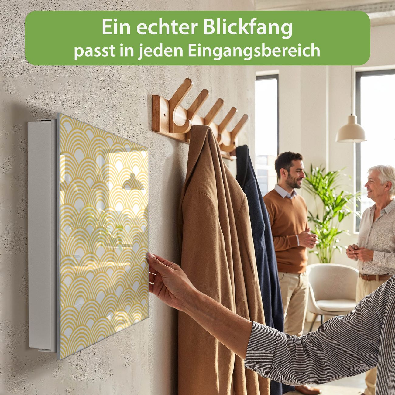Bringe Ordnung und Eleganz in deinen Eingangsbereich mit dem banjado Schlüsselkasten Motiv Motiv Gelbe Wellen. Die moderne Schlüsselbox kombiniert funktionales Design mit hochwertiger Verarbeitung und wird so zu einem echten Hingucker in Flur, Büro oder Ferienwohnung. ✅ Stilvolle Schlüsselaufbewahrung mit Glasfront im Motiv Motiv Gelbe Wellen Der Design-Schlüsselkasten Motiv Motiv Gelbe Wellen bietet Platz für bis zu 50 Schlüssel, die auf 5 stabilen Reihen mit je 10 Haken übersichtlich verstaut werden. Mit seinen kompakten Maßen von 30 x 30 x 5 cm passt die Schlüsselbox perfekt auch in kleinere Räume. Der weiß lackierte Stahlkorpus mit rechts angeschlagenem Türscharnier harmoniert mit der Glasfront und fügt sich nahtlos in jedes Wohnambiente ein. Ob als Schlüsselorganizer für Zuhause oder als praktische Lösung für Büros, Praxen und Gewerbe, der banjado Schlüsselkasten sorgt für Ordnung und Übersicht. Dank der magnetischen, mit Kreidestiften beschreibbaren Glasfront kannst du Notizen anheften oder Termine direkt auf der Oberfläche festhalten. Die Schlüsselbox Motiv Motiv Gelbe Wellen zur Wandmontage wird inklusive Befestigungsmaterial geliefert und ist schnell angebracht. So hast du deine Schlüssel jederzeit griffbereit und zugleich stilvoll verstaut. Mit diesem banjado Schlüsselkasten Motiv Motiv Gelbe Wellen kombinierst du praktische Aufbewahrung mit stilvollem Wohndesign. Ob privat oder geschäftlich, die Schlüsselbox sorgt für mehr Ordnung, Übersicht und ein wohnliches Ambiente.Vorteile im Überblick