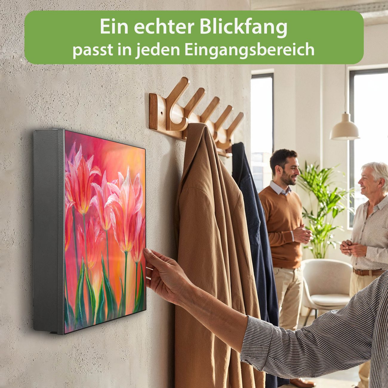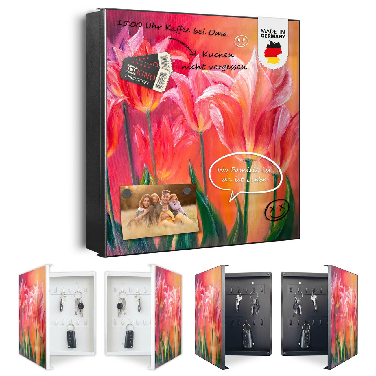 Bringe Ordnung und Eleganz in deinen Eingangsbereich mit dem banjado Schlüsselkasten Motiv Motiv Gemalte Tulpen. Die moderne Schlüsselbox kombiniert funktionales Design mit hochwertiger Verarbeitung und wird so zu einem echten Hingucker in Flur, Büro oder Ferienwohnung. ✅ Stilvolle Schlüsselaufbewahrung mit Motiv Motiv Gemalte Tulpen Der Design-Schlüsselkasten Motiv Motiv Gemalte Tulpen bietet Platz für bis zu 32 Schlüssel, die auf 4 stabilen Reihen mit je 8 Haken übersichtlich verstaut werden. Mit seinen kompakten Maßen von 30 x 30 x 5 cm passt die Schlüsselbox perfekt auch in kleinere Räume. Der schwarz lackierte Stahlkorpus mit rechts angeschlagenem Türscharnier harmoniert mit gedruckten Folie auf der Front und fügt sich nahtlos in jedes Wohnambiente ein. Ob als Schlüsselorganizer für Zuhause oder als praktische Lösung für Büros, Praxen und Gewerbe, der banjado Schlüsselkasten sorgt für Ordnung und Übersicht. Dank der magnetischen, mit Kreidestiften beschreibbaren Folie auf der Front kannst du Notizen anheften oder Termine direkt auf der Oberfläche festhalten. Die Schlüsselbox Motiv Motiv Gemalte Tulpen zur Wandmontage wird inklusive Befestigungsmaterial geliefert und ist schnell angebracht. So hast du deine Schlüssel jederzeit griffbereit und zugleich stilvoll verstaut. Mit diesem banjado Schlüsselkasten Motiv Motiv Gemalte Tulpen kombinierst du praktische Aufbewahrung mit stilvollem Wohndesign. Ob privat oder geschäftlich, die Schlüsselbox sorgt für mehr Ordnung, Übersicht und ein wohnliches Ambiente.Vorteile im Überblick