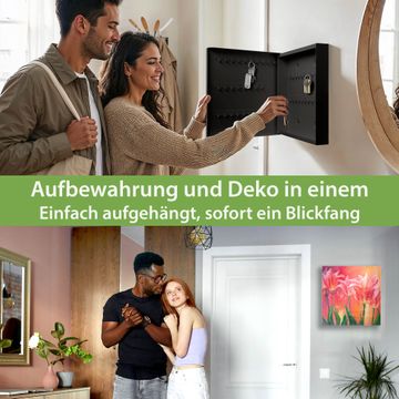 Bringe Ordnung und Eleganz in deinen Eingangsbereich mit dem banjado Schlüsselkasten Motiv Motiv Gemalte Tulpen. Die moderne Schlüsselbox kombiniert funktionales Design mit hochwertiger Verarbeitung und wird so zu einem echten Hingucker in Flur, Büro oder Ferienwohnung. ✅ Stilvolle Schlüsselaufbewahrung mit Glasfront im Motiv Motiv Gemalte Tulpen Der Design-Schlüsselkasten Motiv Motiv Gemalte Tulpen bietet Platz für bis zu 50 Schlüssel, die auf 5 stabilen Reihen mit je 10 Haken übersichtlich verstaut werden. Mit seinen kompakten Maßen von 30 x 30 x 5 cm passt die Schlüsselbox perfekt auch in kleinere Räume. Der schwarz lackierte Stahlkorpus mit rechts angeschlagenem Türscharnier harmoniert mit der Glasfront und fügt sich nahtlos in jedes Wohnambiente ein. Ob als Schlüsselorganizer für Zuhause oder als praktische Lösung für Büros, Praxen und Gewerbe, der banjado Schlüsselkasten sorgt für Ordnung und Übersicht. Dank der magnetischen, mit Kreidestiften beschreibbaren Glasfront kannst du Notizen anheften oder Termine direkt auf der Oberfläche festhalten. Die Schlüsselbox Motiv Motiv Gemalte Tulpen zur Wandmontage wird inklusive Befestigungsmaterial geliefert und ist schnell angebracht. So hast du deine Schlüssel jederzeit griffbereit und zugleich stilvoll verstaut. Mit diesem banjado Schlüsselkasten Motiv Motiv Gemalte Tulpen kombinierst du praktische Aufbewahrung mit stilvollem Wohndesign. Ob privat oder geschäftlich, die Schlüsselbox sorgt für mehr Ordnung, Übersicht und ein wohnliches Ambiente.Vorteile im Überblick