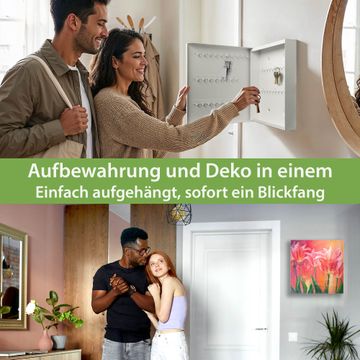 Bringe Ordnung und Eleganz in deinen Eingangsbereich mit dem banjado Schlüsselkasten Motiv Motiv Gemalte Tulpen. Die moderne Schlüsselbox kombiniert funktionales Design mit hochwertiger Verarbeitung und wird so zu einem echten Hingucker in Flur, Büro oder Ferienwohnung. ✅ Stilvolle Schlüsselaufbewahrung mit Glasfront im Motiv Motiv Gemalte Tulpen Der Design-Schlüsselkasten Motiv Motiv Gemalte Tulpen bietet Platz für bis zu 50 Schlüssel, die auf 5 stabilen Reihen mit je 10 Haken übersichtlich verstaut werden. Mit seinen kompakten Maßen von 30 x 30 x 5 cm passt die Schlüsselbox perfekt auch in kleinere Räume. Der weiß lackierte Stahlkorpus mit rechts angeschlagenem Türscharnier harmoniert mit der Glasfront und fügt sich nahtlos in jedes Wohnambiente ein. Ob als Schlüsselorganizer für Zuhause oder als praktische Lösung für Büros, Praxen und Gewerbe, der banjado Schlüsselkasten sorgt für Ordnung und Übersicht. Dank der magnetischen, mit Kreidestiften beschreibbaren Glasfront kannst du Notizen anheften oder Termine direkt auf der Oberfläche festhalten. Die Schlüsselbox Motiv Motiv Gemalte Tulpen zur Wandmontage wird inklusive Befestigungsmaterial geliefert und ist schnell angebracht. So hast du deine Schlüssel jederzeit griffbereit und zugleich stilvoll verstaut. Mit diesem banjado Schlüsselkasten Motiv Motiv Gemalte Tulpen kombinierst du praktische Aufbewahrung mit stilvollem Wohndesign. Ob privat oder geschäftlich, die Schlüsselbox sorgt für mehr Ordnung, Übersicht und ein wohnliches Ambiente.Vorteile im Überblick