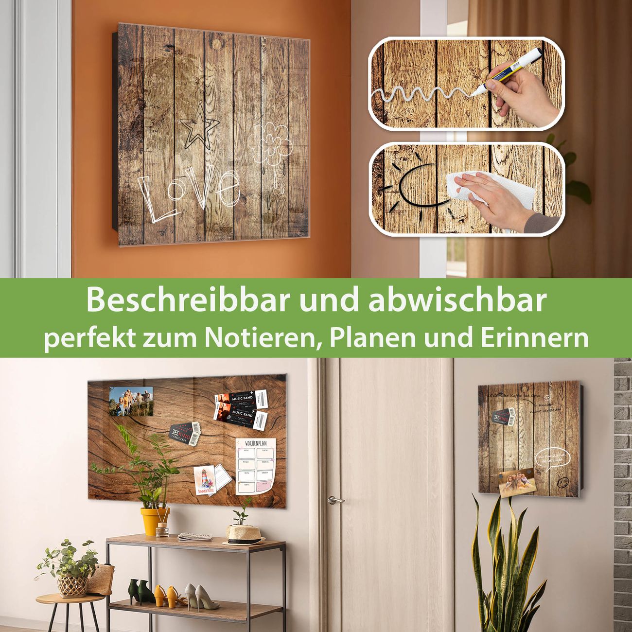 Bringe Ordnung und Eleganz in deinen Eingangsbereich mit dem banjado Schlüsselkasten Motiv Motiv Geöltes Holz. Die moderne Schlüsselbox kombiniert funktionales Design mit hochwertiger Verarbeitung und wird so zu einem echten Hingucker in Flur, Büro oder Ferienwohnung. ✅ Stilvolle Schlüsselaufbewahrung mit Glasfront im Motiv Motiv Geöltes Holz Der Design-Schlüsselkasten Motiv Motiv Geöltes Holz bietet Platz für bis zu 50 Schlüssel, die auf 5 stabilen Reihen mit je 10 Haken übersichtlich verstaut werden. Mit seinen kompakten Maßen von 30 x 30 x 5 cm passt die Schlüsselbox perfekt auch in kleinere Räume. Der schwarz lackierte Stahlkorpus mit rechts angeschlagenem Türscharnier harmoniert mit der Glasfront und fügt sich nahtlos in jedes Wohnambiente ein. Ob als Schlüsselorganizer für Zuhause oder als praktische Lösung für Büros, Praxen und Gewerbe, der banjado Schlüsselkasten sorgt für Ordnung und Übersicht. Dank der magnetischen, mit Kreidestiften beschreibbaren Glasfront kannst du Notizen anheften oder Termine direkt auf der Oberfläche festhalten. Die Schlüsselbox Motiv Motiv Geöltes Holz zur Wandmontage wird inklusive Befestigungsmaterial geliefert und ist schnell angebracht. So hast du deine Schlüssel jederzeit griffbereit und zugleich stilvoll verstaut. Mit diesem banjado Schlüsselkasten Motiv Motiv Geöltes Holz kombinierst du praktische Aufbewahrung mit stilvollem Wohndesign. Ob privat oder geschäftlich, die Schlüsselbox sorgt für mehr Ordnung, Übersicht und ein wohnliches Ambiente.Vorteile im Überblick