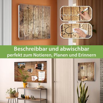 Bringe Ordnung und Eleganz in deinen Eingangsbereich mit dem banjado Schlüsselkasten Motiv Motiv Geöltes Holz. Die moderne Schlüsselbox kombiniert funktionales Design mit hochwertiger Verarbeitung und wird so zu einem echten Hingucker in Flur, Büro oder Ferienwohnung. ✅ Stilvolle Schlüsselaufbewahrung mit Glasfront im Motiv Motiv Geöltes Holz Der Design-Schlüsselkasten Motiv Motiv Geöltes Holz bietet Platz für bis zu 50 Schlüssel, die auf 5 stabilen Reihen mit je 10 Haken übersichtlich verstaut werden. Mit seinen kompakten Maßen von 30 x 30 x 5 cm passt die Schlüsselbox perfekt auch in kleinere Räume. Der weiß lackierte Stahlkorpus mit rechts angeschlagenem Türscharnier harmoniert mit der Glasfront und fügt sich nahtlos in jedes Wohnambiente ein. Ob als Schlüsselorganizer für Zuhause oder als praktische Lösung für Büros, Praxen und Gewerbe, der banjado Schlüsselkasten sorgt für Ordnung und Übersicht. Dank der magnetischen, mit Kreidestiften beschreibbaren Glasfront kannst du Notizen anheften oder Termine direkt auf der Oberfläche festhalten. Die Schlüsselbox Motiv Motiv Geöltes Holz zur Wandmontage wird inklusive Befestigungsmaterial geliefert und ist schnell angebracht. So hast du deine Schlüssel jederzeit griffbereit und zugleich stilvoll verstaut. Mit diesem banjado Schlüsselkasten Motiv Motiv Geöltes Holz kombinierst du praktische Aufbewahrung mit stilvollem Wohndesign. Ob privat oder geschäftlich, die Schlüsselbox sorgt für mehr Ordnung, Übersicht und ein wohnliches Ambiente.Vorteile im Überblick