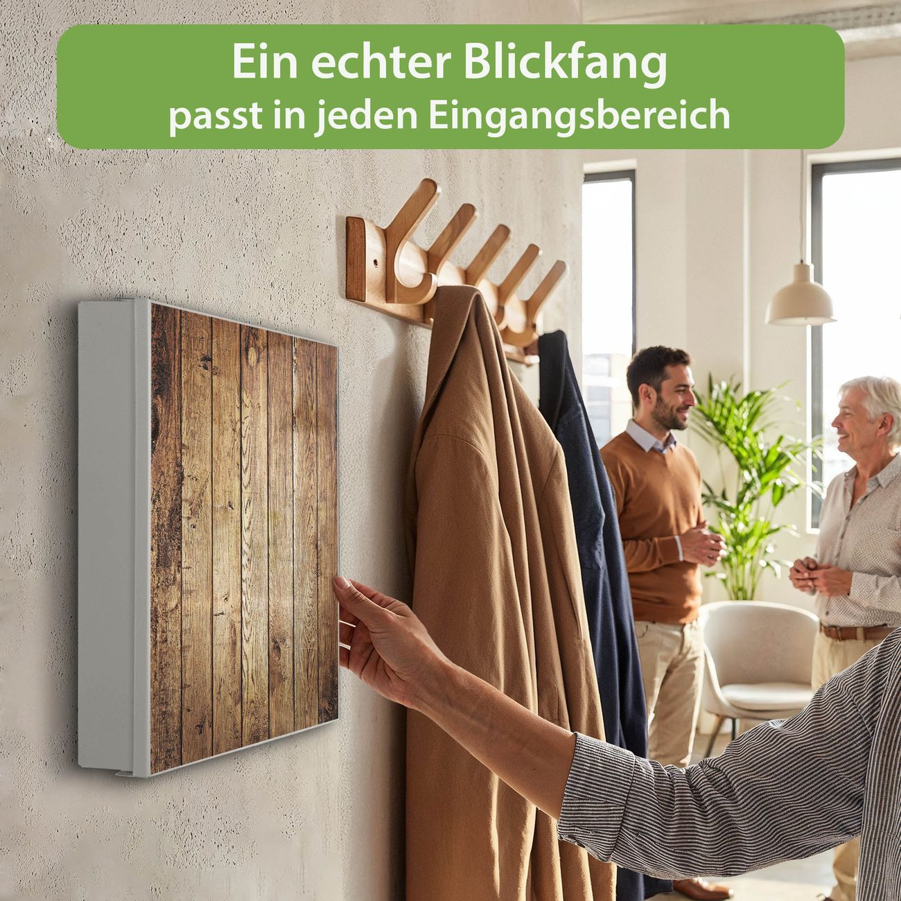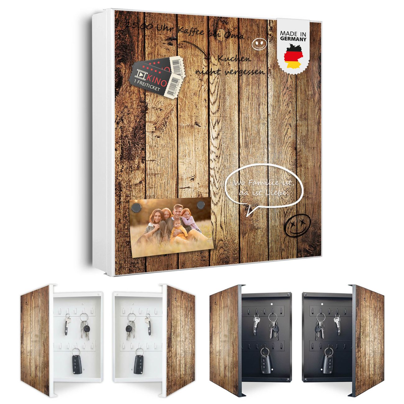 Bringe Ordnung und Eleganz in deinen Eingangsbereich mit dem banjado Schlüsselkasten Motiv Motiv Geöltes Holz. Die moderne Schlüsselbox kombiniert funktionales Design mit hochwertiger Verarbeitung und wird so zu einem echten Hingucker in Flur, Büro oder Ferienwohnung. ✅ Stilvolle Schlüsselaufbewahrung mit Motiv Motiv Geöltes Holz Der Design-Schlüsselkasten Motiv Motiv Geöltes Holz bietet Platz für bis zu 32 Schlüssel, die auf 4 stabilen Reihen mit je 8 Haken übersichtlich verstaut werden. Mit seinen kompakten Maßen von 30 x 30 x 5 cm passt die Schlüsselbox perfekt auch in kleinere Räume. Der weiß lackierte Stahlkorpus mit links angeschlagenem Türscharnier harmoniert mit gedruckten Folie auf der Front und fügt sich nahtlos in jedes Wohnambiente ein. Ob als Schlüsselorganizer für Zuhause oder als praktische Lösung für Büros, Praxen und Gewerbe, der banjado Schlüsselkasten sorgt für Ordnung und Übersicht. Dank der magnetischen, mit Kreidestiften beschreibbaren Folie auf der Front kannst du Notizen anheften oder Termine direkt auf der Oberfläche festhalten. Die Schlüsselbox Motiv Motiv Geöltes Holz zur Wandmontage wird inklusive Befestigungsmaterial geliefert und ist schnell angebracht. So hast du deine Schlüssel jederzeit griffbereit und zugleich stilvoll verstaut. Mit diesem banjado Schlüsselkasten Motiv Motiv Geöltes Holz kombinierst du praktische Aufbewahrung mit stilvollem Wohndesign. Ob privat oder geschäftlich, die Schlüsselbox sorgt für mehr Ordnung, Übersicht und ein wohnliches Ambiente.Vorteile im Überblick
