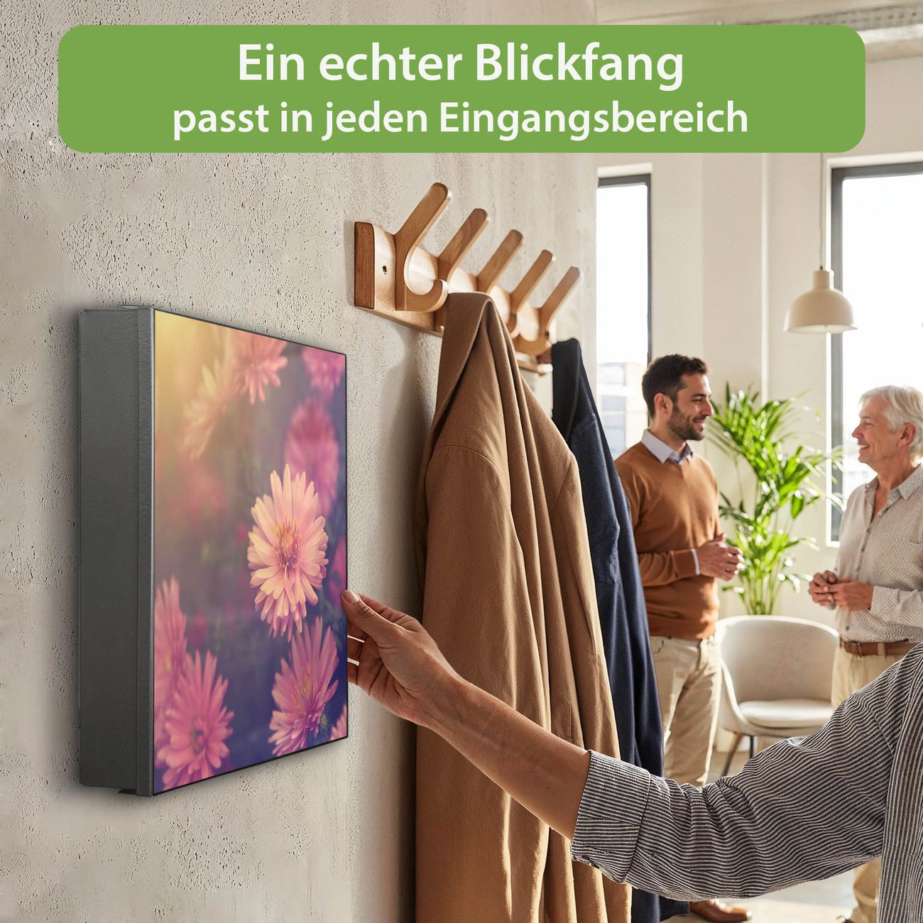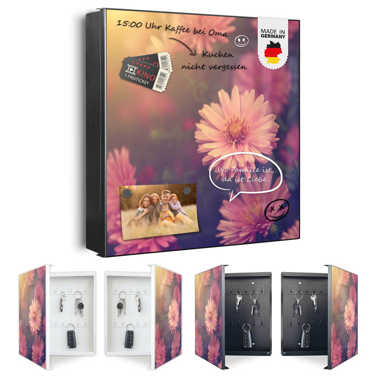 Bringe Ordnung und Eleganz in deinen Eingangsbereich mit dem banjado Schlüsselkasten Motiv Motiv Gerbera 2. Die moderne Schlüsselbox kombiniert funktionales Design mit hochwertiger Verarbeitung und wird so zu einem echten Hingucker in Flur, Büro oder Ferienwohnung. ✅ Stilvolle Schlüsselaufbewahrung mit Motiv Motiv Gerbera 2 Der Design-Schlüsselkasten Motiv Motiv Gerbera 2 bietet Platz für bis zu 32 Schlüssel, die auf 4 stabilen Reihen mit je 8 Haken übersichtlich verstaut werden. Mit seinen kompakten Maßen von 30 x 30 x 5 cm passt die Schlüsselbox perfekt auch in kleinere Räume. Der schwarz lackierte Stahlkorpus mit links angeschlagenem Türscharnier harmoniert mit gedruckten Folie auf der Front und fügt sich nahtlos in jedes Wohnambiente ein. Ob als Schlüsselorganizer für Zuhause oder als praktische Lösung für Büros, Praxen und Gewerbe, der banjado Schlüsselkasten sorgt für Ordnung und Übersicht. Dank der magnetischen, mit Kreidestiften beschreibbaren Folie auf der Front kannst du Notizen anheften oder Termine direkt auf der Oberfläche festhalten. Die Schlüsselbox Motiv Motiv Gerbera 2 zur Wandmontage wird inklusive Befestigungsmaterial geliefert und ist schnell angebracht. So hast du deine Schlüssel jederzeit griffbereit und zugleich stilvoll verstaut. Mit diesem banjado Schlüsselkasten Motiv Motiv Gerbera 2 kombinierst du praktische Aufbewahrung mit stilvollem Wohndesign. Ob privat oder geschäftlich, die Schlüsselbox sorgt für mehr Ordnung, Übersicht und ein wohnliches Ambiente.Vorteile im Überblick
