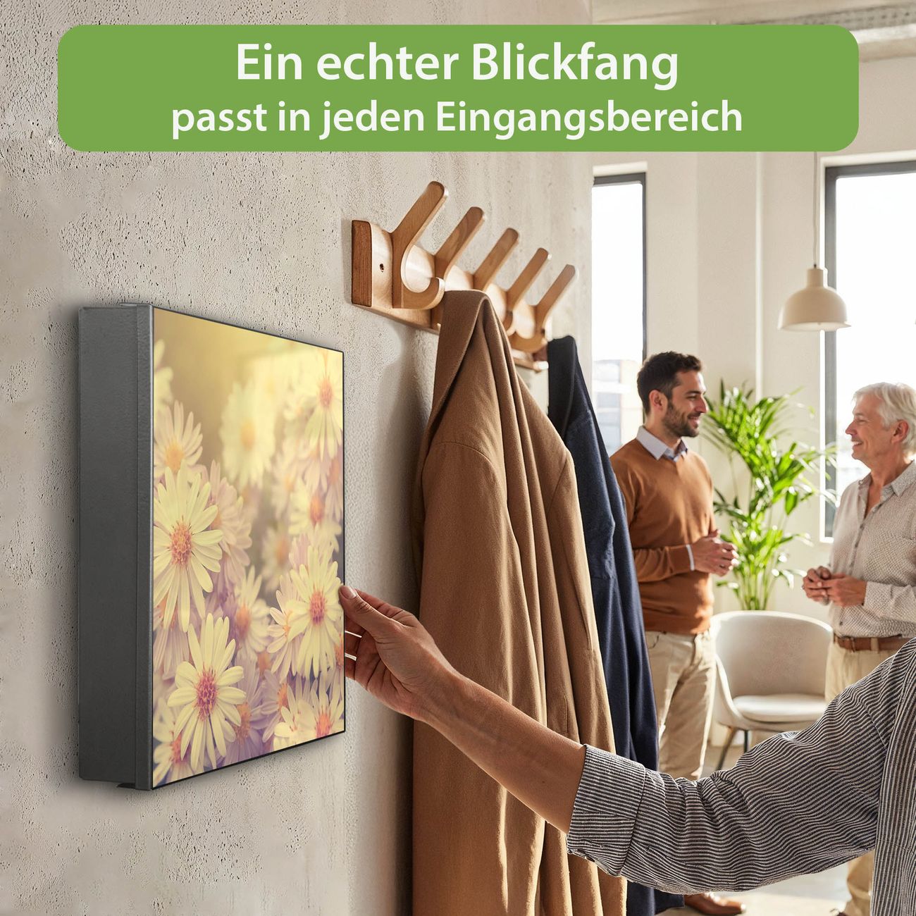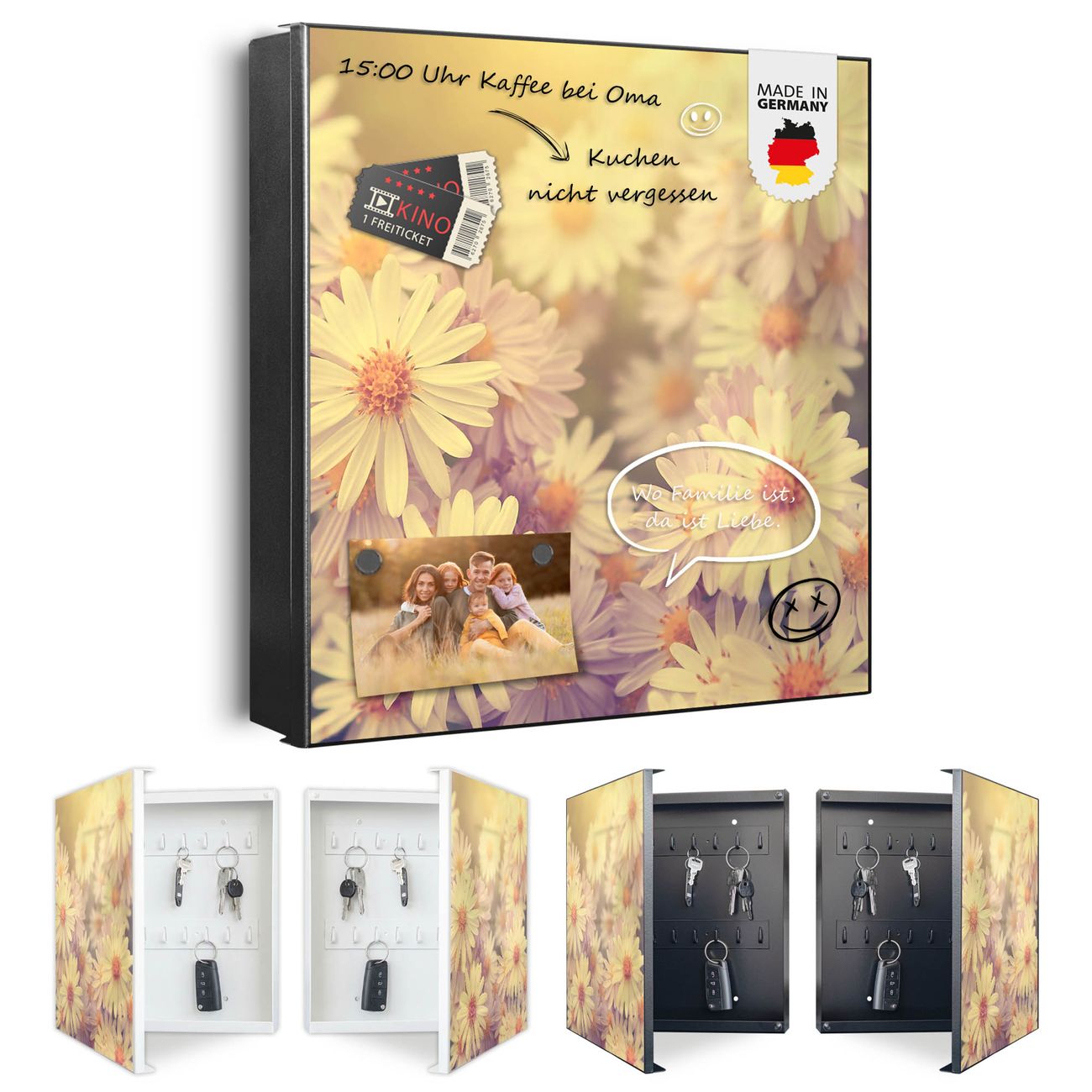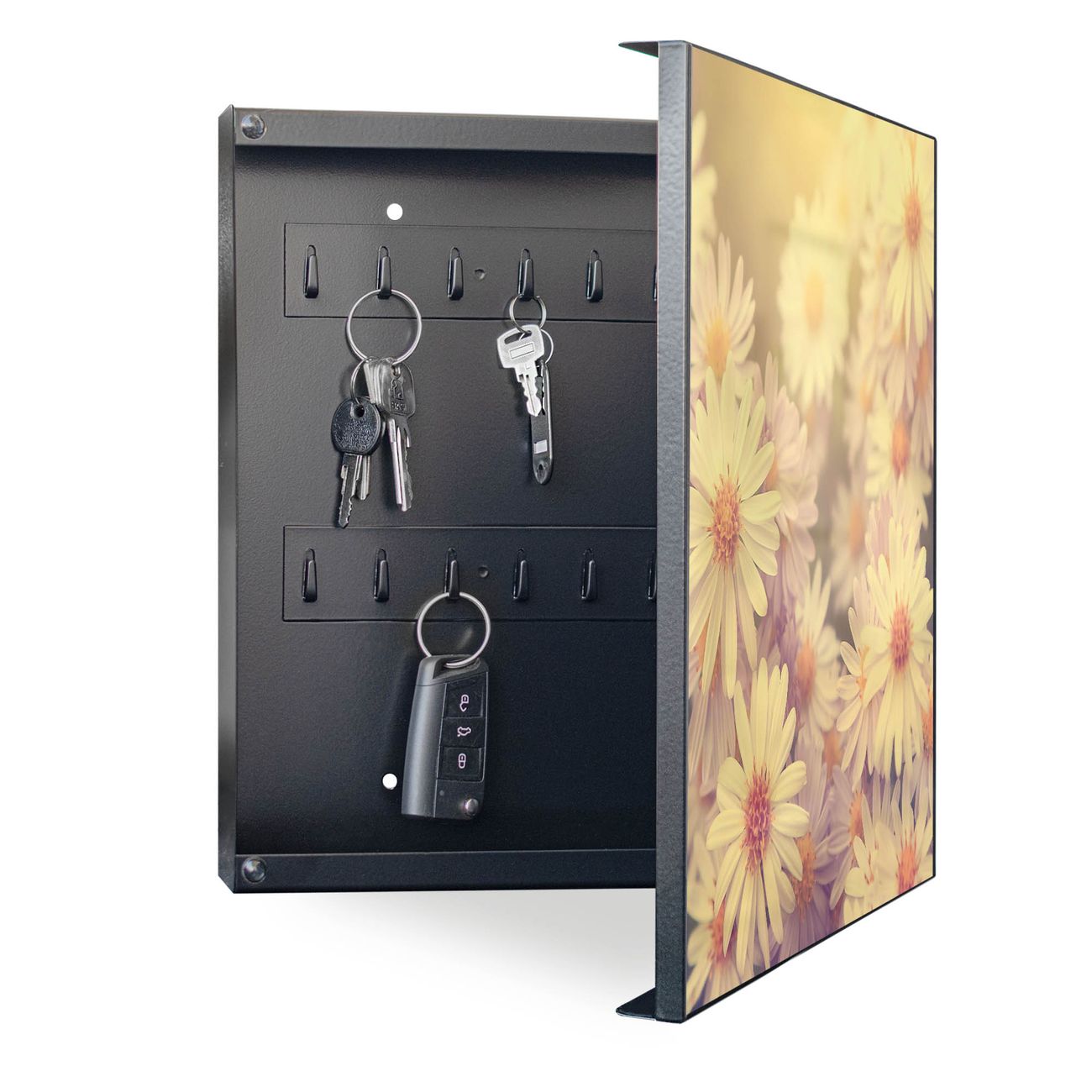 Bringe Ordnung und Eleganz in deinen Eingangsbereich mit dem banjado Schlüsselkasten Motiv Motiv Gerbera 3. Die moderne Schlüsselbox kombiniert funktionales Design mit hochwertiger Verarbeitung und wird so zu einem echten Hingucker in Flur, Büro oder Ferienwohnung. ✅ Stilvolle Schlüsselaufbewahrung mit Motiv Motiv Gerbera 3 Der Design-Schlüsselkasten Motiv Motiv Gerbera 3 bietet Platz für bis zu 32 Schlüssel, die auf 4 stabilen Reihen mit je 8 Haken übersichtlich verstaut werden. Mit seinen kompakten Maßen von 30 x 30 x 5 cm passt die Schlüsselbox perfekt auch in kleinere Räume. Der schwarz lackierte Stahlkorpus mit rechts angeschlagenem Türscharnier harmoniert mit gedruckten Folie auf der Front und fügt sich nahtlos in jedes Wohnambiente ein. Ob als Schlüsselorganizer für Zuhause oder als praktische Lösung für Büros, Praxen und Gewerbe, der banjado Schlüsselkasten sorgt für Ordnung und Übersicht. Dank der magnetischen, mit Kreidestiften beschreibbaren Folie auf der Front kannst du Notizen anheften oder Termine direkt auf der Oberfläche festhalten. Die Schlüsselbox Motiv Motiv Gerbera 3 zur Wandmontage wird inklusive Befestigungsmaterial geliefert und ist schnell angebracht. So hast du deine Schlüssel jederzeit griffbereit und zugleich stilvoll verstaut. Mit diesem banjado Schlüsselkasten Motiv Motiv Gerbera 3 kombinierst du praktische Aufbewahrung mit stilvollem Wohndesign. Ob privat oder geschäftlich, die Schlüsselbox sorgt für mehr Ordnung, Übersicht und ein wohnliches Ambiente.Vorteile im Überblick
