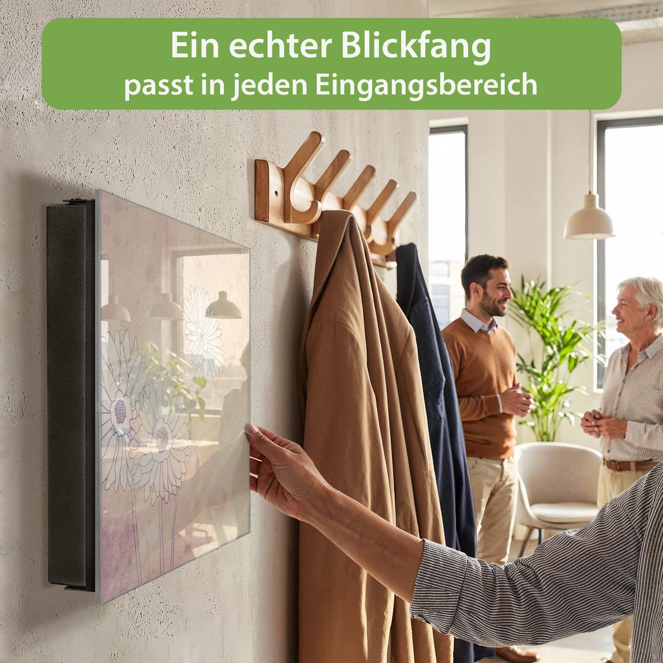 Bringe Ordnung und Eleganz in deinen Eingangsbereich mit dem banjado Schlüsselkasten Motiv Motiv Gerbera. Die moderne Schlüsselbox kombiniert funktionales Design mit hochwertiger Verarbeitung und wird so zu einem echten Hingucker in Flur, Büro oder Ferienwohnung. ✅ Stilvolle Schlüsselaufbewahrung mit Glasfront im Motiv Motiv Gerbera Der Design-Schlüsselkasten Motiv Motiv Gerbera bietet Platz für bis zu 50 Schlüssel, die auf 5 stabilen Reihen mit je 10 Haken übersichtlich verstaut werden. Mit seinen kompakten Maßen von 30 x 30 x 5 cm passt die Schlüsselbox perfekt auch in kleinere Räume. Der schwarz lackierte Stahlkorpus mit rechts angeschlagenem Türscharnier harmoniert mit der Glasfront und fügt sich nahtlos in jedes Wohnambiente ein. Ob als Schlüsselorganizer für Zuhause oder als praktische Lösung für Büros, Praxen und Gewerbe, der banjado Schlüsselkasten sorgt für Ordnung und Übersicht. Dank der magnetischen, mit Kreidestiften beschreibbaren Glasfront kannst du Notizen anheften oder Termine direkt auf der Oberfläche festhalten. Die Schlüsselbox Motiv Motiv Gerbera zur Wandmontage wird inklusive Befestigungsmaterial geliefert und ist schnell angebracht. So hast du deine Schlüssel jederzeit griffbereit und zugleich stilvoll verstaut. Mit diesem banjado Schlüsselkasten Motiv Motiv Gerbera kombinierst du praktische Aufbewahrung mit stilvollem Wohndesign. Ob privat oder geschäftlich, die Schlüsselbox sorgt für mehr Ordnung, Übersicht und ein wohnliches Ambiente.Vorteile im Überblick