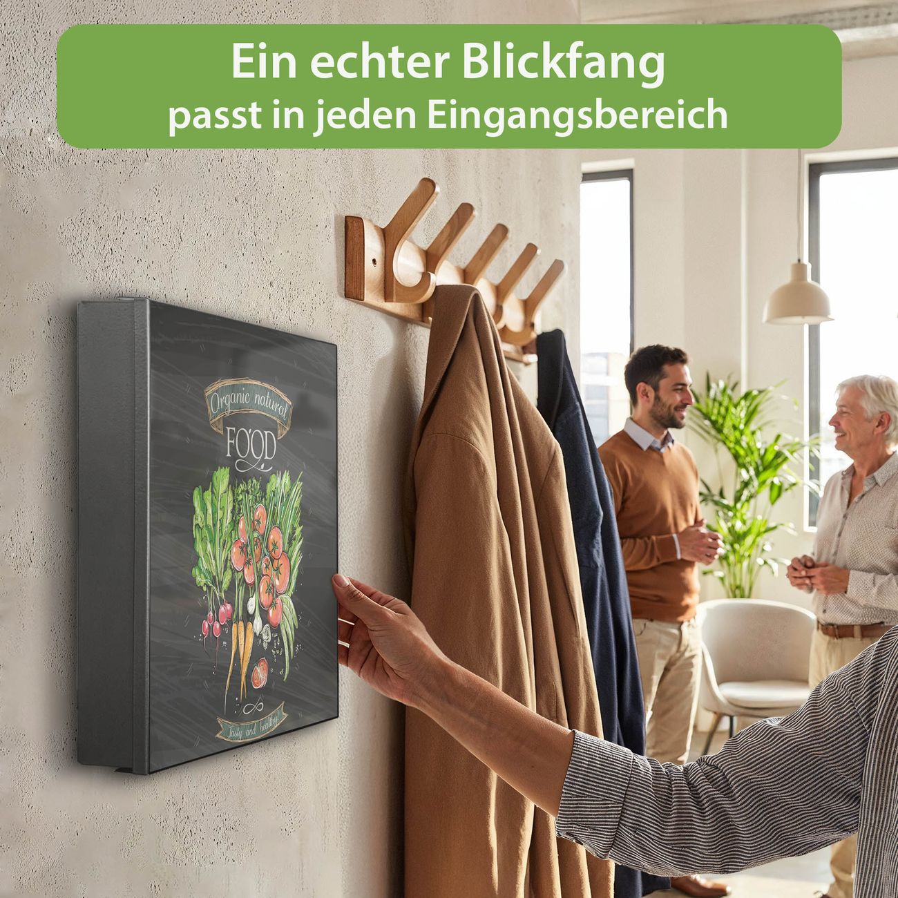 Bringe Ordnung und Eleganz in deinen Eingangsbereich mit dem banjado Schlüsselkasten Motiv Motiv Gesund Und Lecker. Die moderne Schlüsselbox kombiniert funktionales Design mit hochwertiger Verarbeitung und wird so zu einem echten Hingucker in Flur, Büro oder Ferienwohnung. ✅ Stilvolle Schlüsselaufbewahrung mit Motiv Motiv Gesund Und Lecker Der Design-Schlüsselkasten Motiv Motiv Gesund Und Lecker bietet Platz für bis zu 32 Schlüssel, die auf 4 stabilen Reihen mit je 8 Haken übersichtlich verstaut werden. Mit seinen kompakten Maßen von 30 x 30 x 5 cm passt die Schlüsselbox perfekt auch in kleinere Räume. Der schwarz lackierte Stahlkorpus mit rechts angeschlagenem Türscharnier harmoniert mit gedruckten Folie auf der Front und fügt sich nahtlos in jedes Wohnambiente ein. Ob als Schlüsselorganizer für Zuhause oder als praktische Lösung für Büros, Praxen und Gewerbe, der banjado Schlüsselkasten sorgt für Ordnung und Übersicht. Dank der magnetischen, mit Kreidestiften beschreibbaren Folie auf der Front kannst du Notizen anheften oder Termine direkt auf der Oberfläche festhalten. Die Schlüsselbox Motiv Motiv Gesund Und Lecker zur Wandmontage wird inklusive Befestigungsmaterial geliefert und ist schnell angebracht. So hast du deine Schlüssel jederzeit griffbereit und zugleich stilvoll verstaut. Mit diesem banjado Schlüsselkasten Motiv Motiv Gesund Und Lecker kombinierst du praktische Aufbewahrung mit stilvollem Wohndesign. Ob privat oder geschäftlich, die Schlüsselbox sorgt für mehr Ordnung, Übersicht und ein wohnliches Ambiente.Vorteile im Überblick