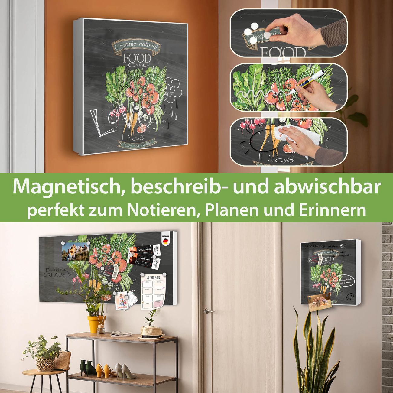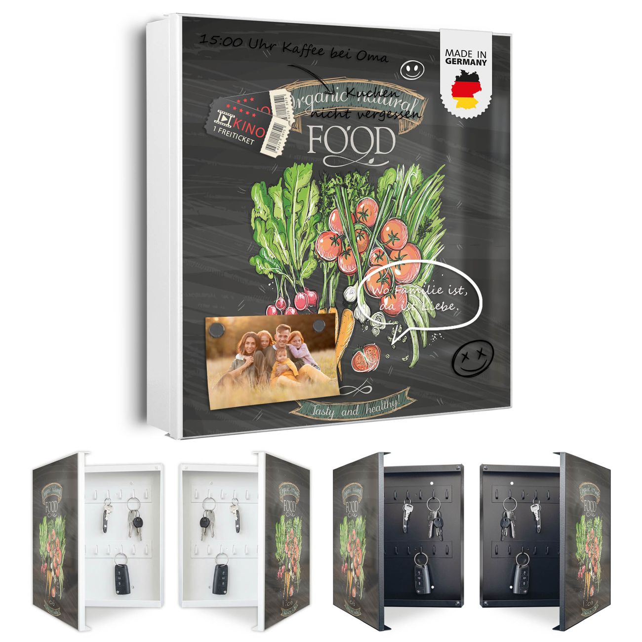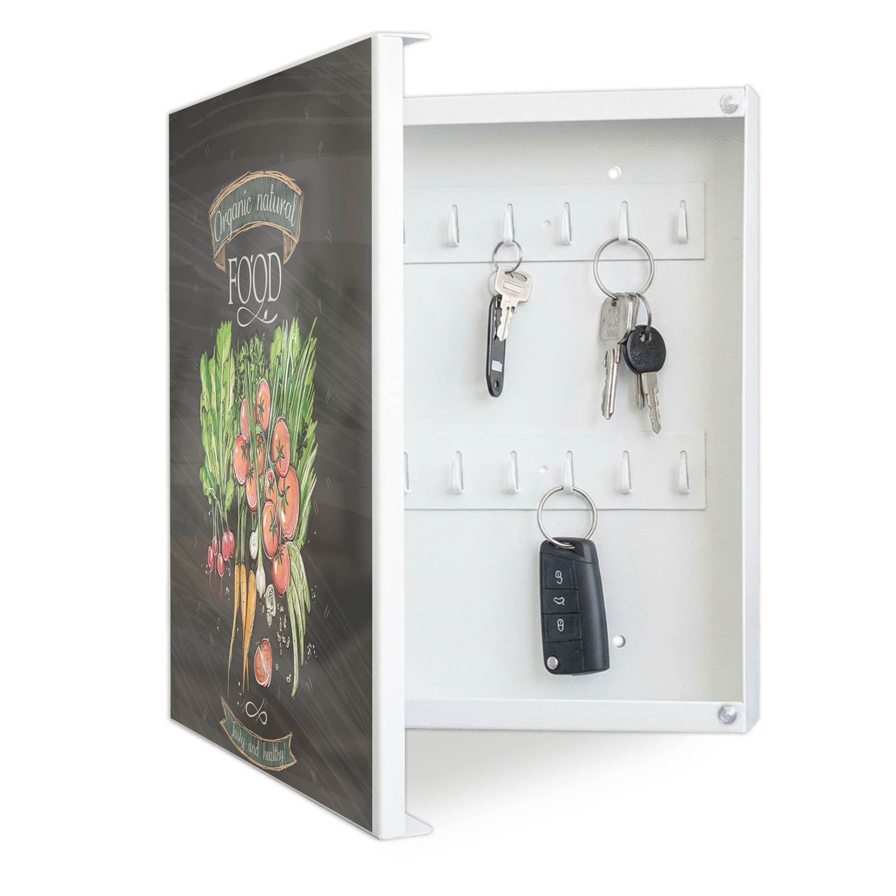 Bringe Ordnung und Eleganz in deinen Eingangsbereich mit dem banjado Schlüsselkasten Motiv Motiv Gesund Und Lecker. Die moderne Schlüsselbox kombiniert funktionales Design mit hochwertiger Verarbeitung und wird so zu einem echten Hingucker in Flur, Büro oder Ferienwohnung. ✅ Stilvolle Schlüsselaufbewahrung mit Motiv Motiv Gesund Und Lecker Der Design-Schlüsselkasten Motiv Motiv Gesund Und Lecker bietet Platz für bis zu 32 Schlüssel, die auf 4 stabilen Reihen mit je 8 Haken übersichtlich verstaut werden. Mit seinen kompakten Maßen von 30 x 30 x 5 cm passt die Schlüsselbox perfekt auch in kleinere Räume. Der weiß lackierte Stahlkorpus mit links angeschlagenem Türscharnier harmoniert mit gedruckten Folie auf der Front und fügt sich nahtlos in jedes Wohnambiente ein. Ob als Schlüsselorganizer für Zuhause oder als praktische Lösung für Büros, Praxen und Gewerbe, der banjado Schlüsselkasten sorgt für Ordnung und Übersicht. Dank der magnetischen, mit Kreidestiften beschreibbaren Folie auf der Front kannst du Notizen anheften oder Termine direkt auf der Oberfläche festhalten. Die Schlüsselbox Motiv Motiv Gesund Und Lecker zur Wandmontage wird inklusive Befestigungsmaterial geliefert und ist schnell angebracht. So hast du deine Schlüssel jederzeit griffbereit und zugleich stilvoll verstaut. Mit diesem banjado Schlüsselkasten Motiv Motiv Gesund Und Lecker kombinierst du praktische Aufbewahrung mit stilvollem Wohndesign. Ob privat oder geschäftlich, die Schlüsselbox sorgt für mehr Ordnung, Übersicht und ein wohnliches Ambiente.Vorteile im Überblick