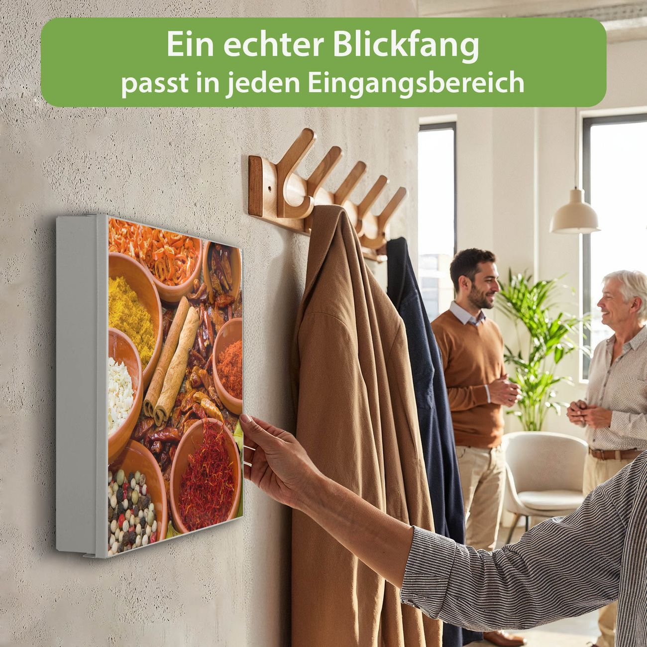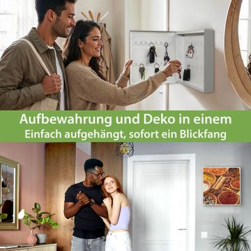 Bringe Ordnung und Eleganz in deinen Eingangsbereich mit dem banjado Schlüsselkasten Motiv Motiv Gewürze. Die moderne Schlüsselbox kombiniert funktionales Design mit hochwertiger Verarbeitung und wird so zu einem echten Hingucker in Flur, Büro oder Ferienwohnung. ✅ Stilvolle Schlüsselaufbewahrung mit Motiv Motiv Gewürze Der Design-Schlüsselkasten Motiv Motiv Gewürze bietet Platz für bis zu 32 Schlüssel, die auf 4 stabilen Reihen mit je 8 Haken übersichtlich verstaut werden. Mit seinen kompakten Maßen von 30 x 30 x 5 cm passt die Schlüsselbox perfekt auch in kleinere Räume. Der weiß lackierte Stahlkorpus mit rechts angeschlagenem Türscharnier harmoniert mit gedruckten Folie auf der Front und fügt sich nahtlos in jedes Wohnambiente ein. Ob als Schlüsselorganizer für Zuhause oder als praktische Lösung für Büros, Praxen und Gewerbe, der banjado Schlüsselkasten sorgt für Ordnung und Übersicht. Dank der magnetischen, mit Kreidestiften beschreibbaren Folie auf der Front kannst du Notizen anheften oder Termine direkt auf der Oberfläche festhalten. Die Schlüsselbox Motiv Motiv Gewürze zur Wandmontage wird inklusive Befestigungsmaterial geliefert und ist schnell angebracht. So hast du deine Schlüssel jederzeit griffbereit und zugleich stilvoll verstaut. Mit diesem banjado Schlüsselkasten Motiv Motiv Gewürze kombinierst du praktische Aufbewahrung mit stilvollem Wohndesign. Ob privat oder geschäftlich, die Schlüsselbox sorgt für mehr Ordnung, Übersicht und ein wohnliches Ambiente.Vorteile im Überblick