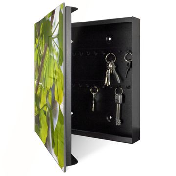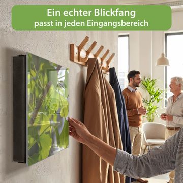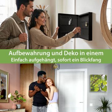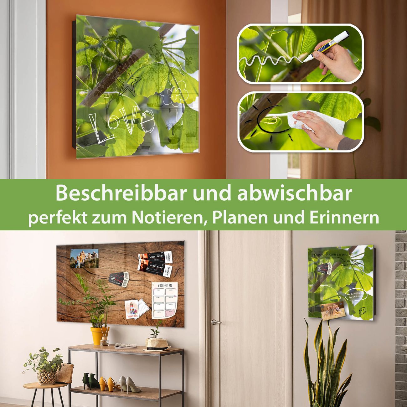 Bringe Ordnung und Eleganz in deinen Eingangsbereich mit dem banjado Schlüsselkasten Motiv Motiv Gingko. Die moderne Schlüsselbox kombiniert funktionales Design mit hochwertiger Verarbeitung und wird so zu einem echten Hingucker in Flur, Büro oder Ferienwohnung. ✅ Stilvolle Schlüsselaufbewahrung mit Glasfront im Motiv Motiv Gingko Der Design-Schlüsselkasten Motiv Motiv Gingko bietet Platz für bis zu 50 Schlüssel, die auf 5 stabilen Reihen mit je 10 Haken übersichtlich verstaut werden. Mit seinen kompakten Maßen von 30 x 30 x 5 cm passt die Schlüsselbox perfekt auch in kleinere Räume. Der schwarz lackierte Stahlkorpus mit rechts angeschlagenem Türscharnier harmoniert mit der Glasfront und fügt sich nahtlos in jedes Wohnambiente ein. Ob als Schlüsselorganizer für Zuhause oder als praktische Lösung für Büros, Praxen und Gewerbe, der banjado Schlüsselkasten sorgt für Ordnung und Übersicht. Dank der magnetischen, mit Kreidestiften beschreibbaren Glasfront kannst du Notizen anheften oder Termine direkt auf der Oberfläche festhalten. Die Schlüsselbox Motiv Motiv Gingko zur Wandmontage wird inklusive Befestigungsmaterial geliefert und ist schnell angebracht. So hast du deine Schlüssel jederzeit griffbereit und zugleich stilvoll verstaut. Mit diesem banjado Schlüsselkasten Motiv Motiv Gingko kombinierst du praktische Aufbewahrung mit stilvollem Wohndesign. Ob privat oder geschäftlich, die Schlüsselbox sorgt für mehr Ordnung, Übersicht und ein wohnliches Ambiente.Vorteile im Überblick