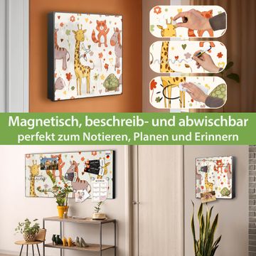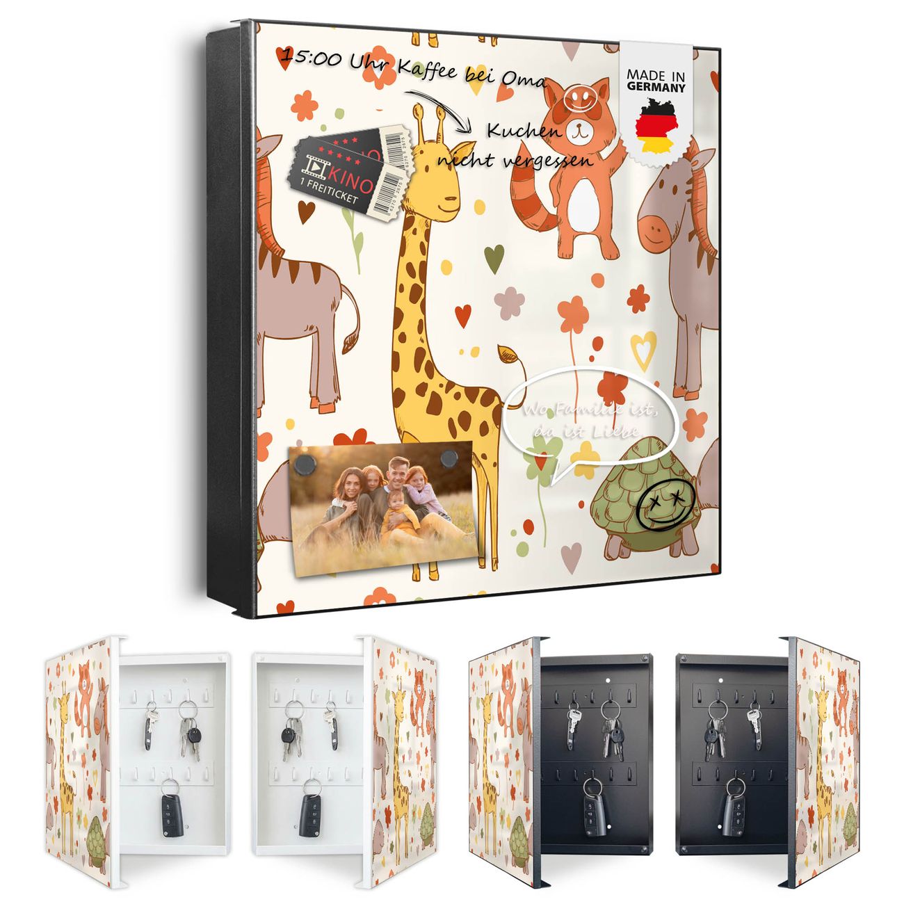 Bringe Ordnung und Eleganz in deinen Eingangsbereich mit dem banjado Schlüsselkasten Motiv Motiv Giraffe & Co. Die moderne Schlüsselbox kombiniert funktionales Design mit hochwertiger Verarbeitung und wird so zu einem echten Hingucker in Flur, Büro oder Ferienwohnung. ✅ Stilvolle Schlüsselaufbewahrung mit Motiv Motiv Giraffe & Co Der Design-Schlüsselkasten Motiv Motiv Giraffe & Co bietet Platz für bis zu 32 Schlüssel, die auf 4 stabilen Reihen mit je 8 Haken übersichtlich verstaut werden. Mit seinen kompakten Maßen von 30 x 30 x 5 cm passt die Schlüsselbox perfekt auch in kleinere Räume. Der schwarz lackierte Stahlkorpus mit rechts angeschlagenem Türscharnier harmoniert mit gedruckten Folie auf der Front und fügt sich nahtlos in jedes Wohnambiente ein. Ob als Schlüsselorganizer für Zuhause oder als praktische Lösung für Büros, Praxen und Gewerbe, der banjado Schlüsselkasten sorgt für Ordnung und Übersicht. Dank der magnetischen, mit Kreidestiften beschreibbaren Folie auf der Front kannst du Notizen anheften oder Termine direkt auf der Oberfläche festhalten. Die Schlüsselbox Motiv Motiv Giraffe & Co zur Wandmontage wird inklusive Befestigungsmaterial geliefert und ist schnell angebracht. So hast du deine Schlüssel jederzeit griffbereit und zugleich stilvoll verstaut. Mit diesem banjado Schlüsselkasten Motiv Motiv Giraffe & Co kombinierst du praktische Aufbewahrung mit stilvollem Wohndesign. Ob privat oder geschäftlich, die Schlüsselbox sorgt für mehr Ordnung, Übersicht und ein wohnliches Ambiente.Vorteile im Überblick