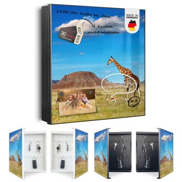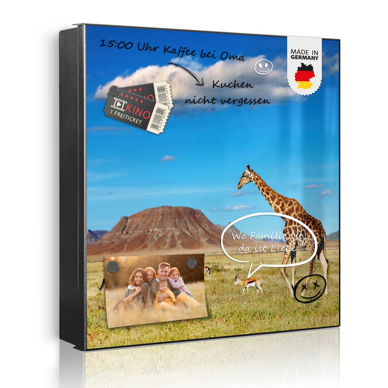 Motiv Giraffe Nr. 10656 Größe: 30x30x5cm BxHxT Türanschlag: Rechts Material: Stahlkorpus schwarz mit Glastür Eigenschaften: magnetisch, beschreibbar Zubehör: Montagematerial Gewicht: ca. 2700g