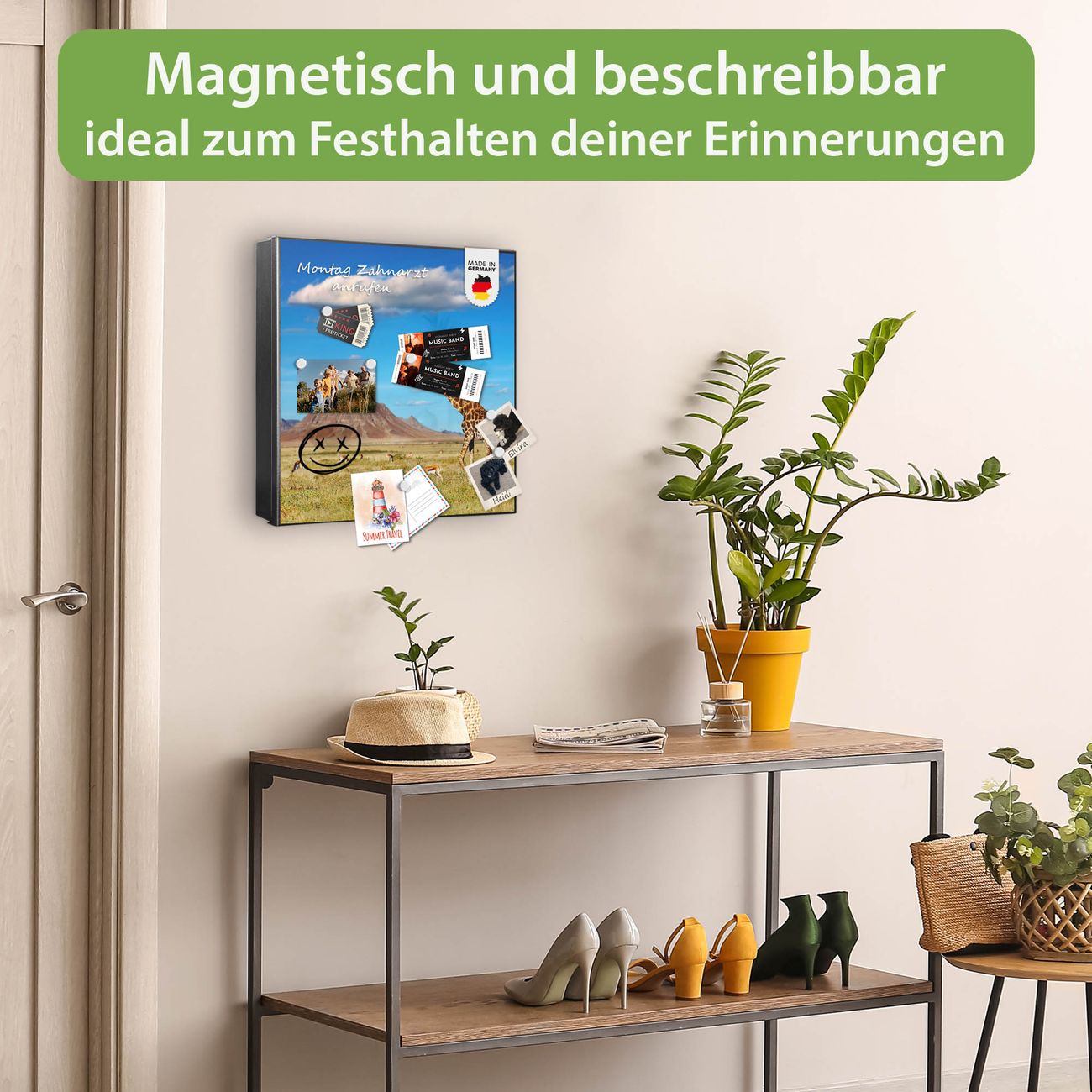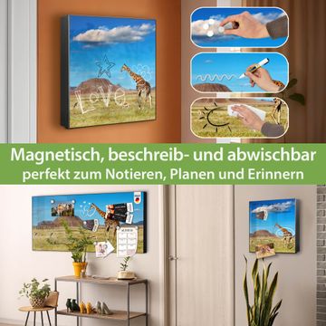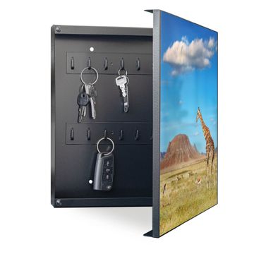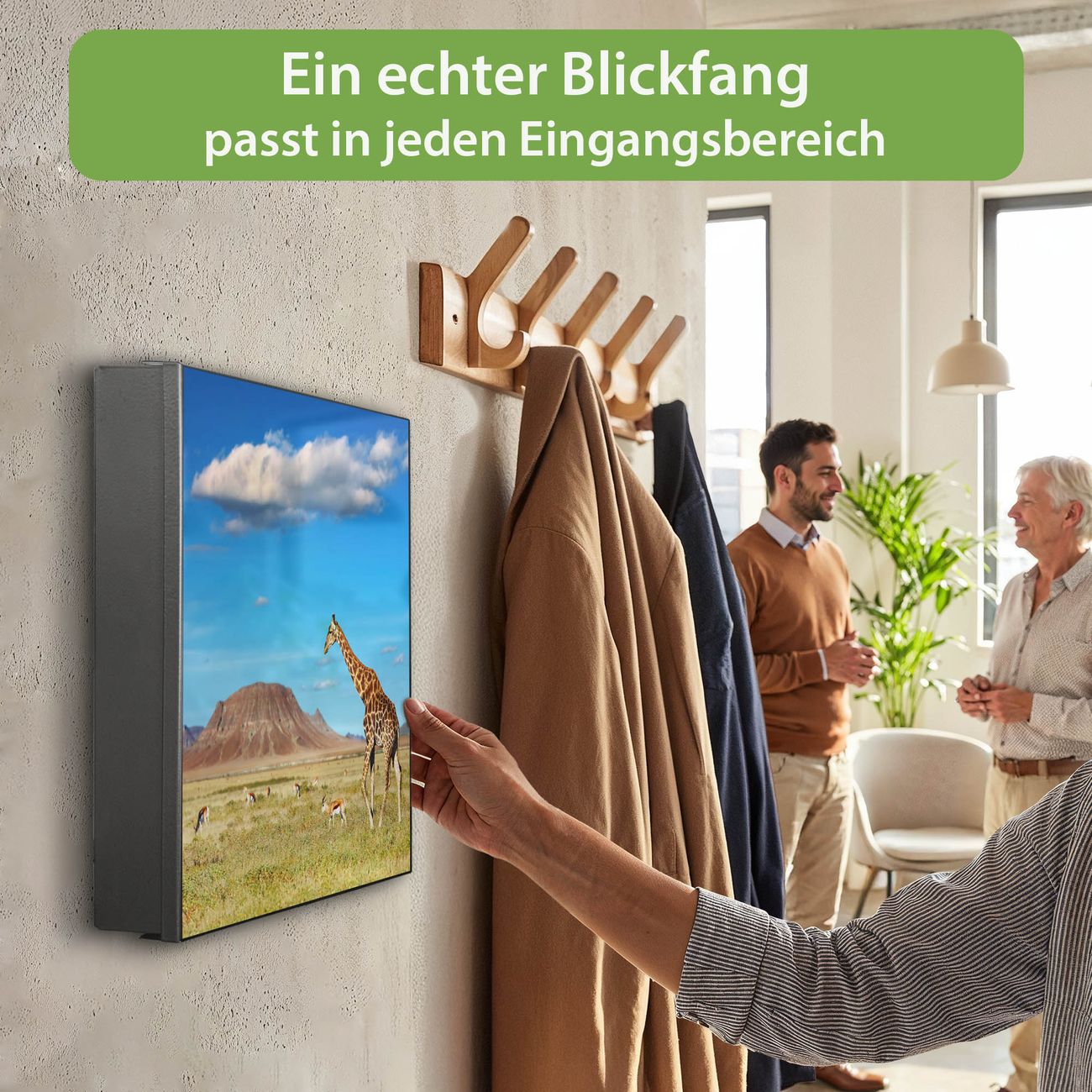 Bringe Ordnung und Eleganz in deinen Eingangsbereich mit dem banjado Schlüsselkasten Motiv Motiv Giraffe. Die moderne Schlüsselbox kombiniert funktionales Design mit hochwertiger Verarbeitung und wird so zu einem echten Hingucker in Flur, Büro oder Ferienwohnung. ✅ Stilvolle Schlüsselaufbewahrung mit Glasfront im Motiv Motiv Giraffe Der Design-Schlüsselkasten Motiv Motiv Giraffe bietet Platz für bis zu 50 Schlüssel, die auf 5 stabilen Reihen mit je 10 Haken übersichtlich verstaut werden. Mit seinen kompakten Maßen von 30 x 30 x 5 cm passt die Schlüsselbox perfekt auch in kleinere Räume. Der schwarz lackierte Stahlkorpus mit rechts angeschlagenem Türscharnier harmoniert mit der Glasfront und fügt sich nahtlos in jedes Wohnambiente ein. Ob als Schlüsselorganizer für Zuhause oder als praktische Lösung für Büros, Praxen und Gewerbe, der banjado Schlüsselkasten sorgt für Ordnung und Übersicht. Dank der magnetischen, mit Kreidestiften beschreibbaren Glasfront kannst du Notizen anheften oder Termine direkt auf der Oberfläche festhalten. Die Schlüsselbox Motiv Motiv Giraffe zur Wandmontage wird inklusive Befestigungsmaterial geliefert und ist schnell angebracht. So hast du deine Schlüssel jederzeit griffbereit und zugleich stilvoll verstaut. Mit diesem banjado Schlüsselkasten Motiv Motiv Giraffe kombinierst du praktische Aufbewahrung mit stilvollem Wohndesign. Ob privat oder geschäftlich, die Schlüsselbox sorgt für mehr Ordnung, Übersicht und ein wohnliches Ambiente.Vorteile im Überblick
