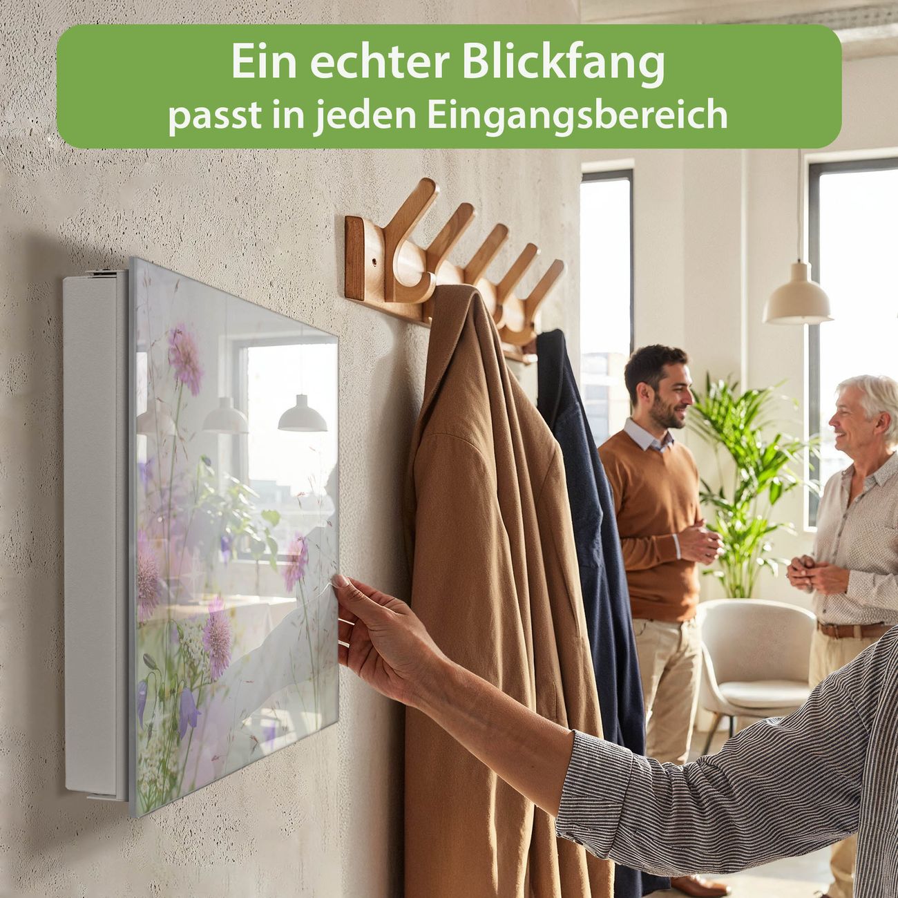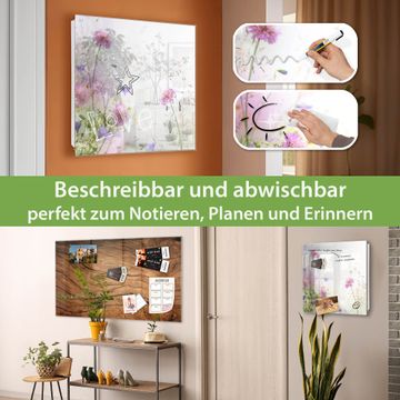 Bringe Ordnung und Eleganz in deinen Eingangsbereich mit dem banjado Schlüsselkasten Motiv Motiv Glitzernde Wiese. Die moderne Schlüsselbox kombiniert funktionales Design mit hochwertiger Verarbeitung und wird so zu einem echten Hingucker in Flur, Büro oder Ferienwohnung. ✅ Stilvolle Schlüsselaufbewahrung mit Glasfront im Motiv Motiv Glitzernde Wiese Der Design-Schlüsselkasten Motiv Motiv Glitzernde Wiese bietet Platz für bis zu 50 Schlüssel, die auf 5 stabilen Reihen mit je 10 Haken übersichtlich verstaut werden. Mit seinen kompakten Maßen von 30 x 30 x 5 cm passt die Schlüsselbox perfekt auch in kleinere Räume. Der weiß lackierte Stahlkorpus mit rechts angeschlagenem Türscharnier harmoniert mit der Glasfront und fügt sich nahtlos in jedes Wohnambiente ein. Ob als Schlüsselorganizer für Zuhause oder als praktische Lösung für Büros, Praxen und Gewerbe, der banjado Schlüsselkasten sorgt für Ordnung und Übersicht. Dank der magnetischen, mit Kreidestiften beschreibbaren Glasfront kannst du Notizen anheften oder Termine direkt auf der Oberfläche festhalten. Die Schlüsselbox Motiv Motiv Glitzernde Wiese zur Wandmontage wird inklusive Befestigungsmaterial geliefert und ist schnell angebracht. So hast du deine Schlüssel jederzeit griffbereit und zugleich stilvoll verstaut. Mit diesem banjado Schlüsselkasten Motiv Motiv Glitzernde Wiese kombinierst du praktische Aufbewahrung mit stilvollem Wohndesign. Ob privat oder geschäftlich, die Schlüsselbox sorgt für mehr Ordnung, Übersicht und ein wohnliches Ambiente.Vorteile im Überblick