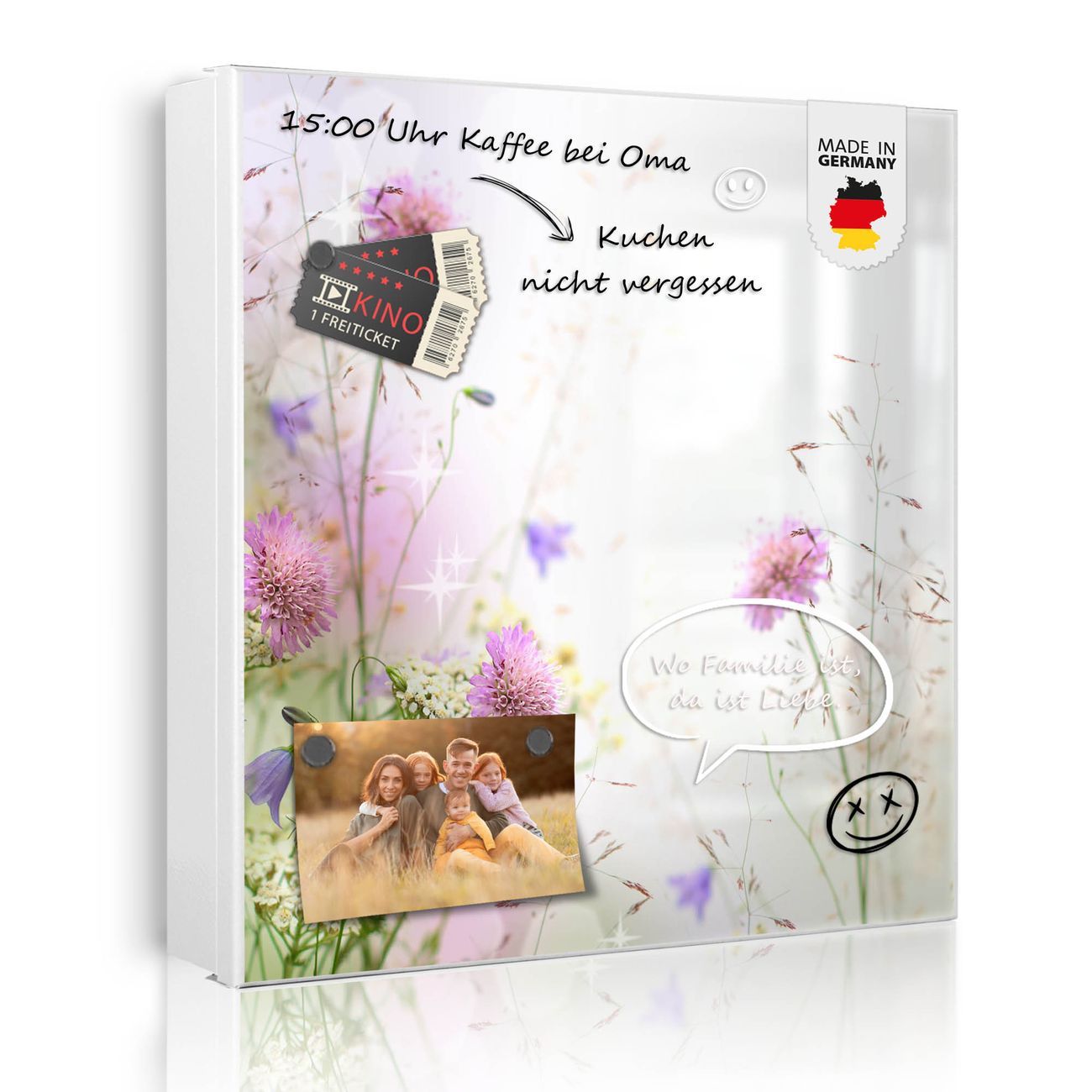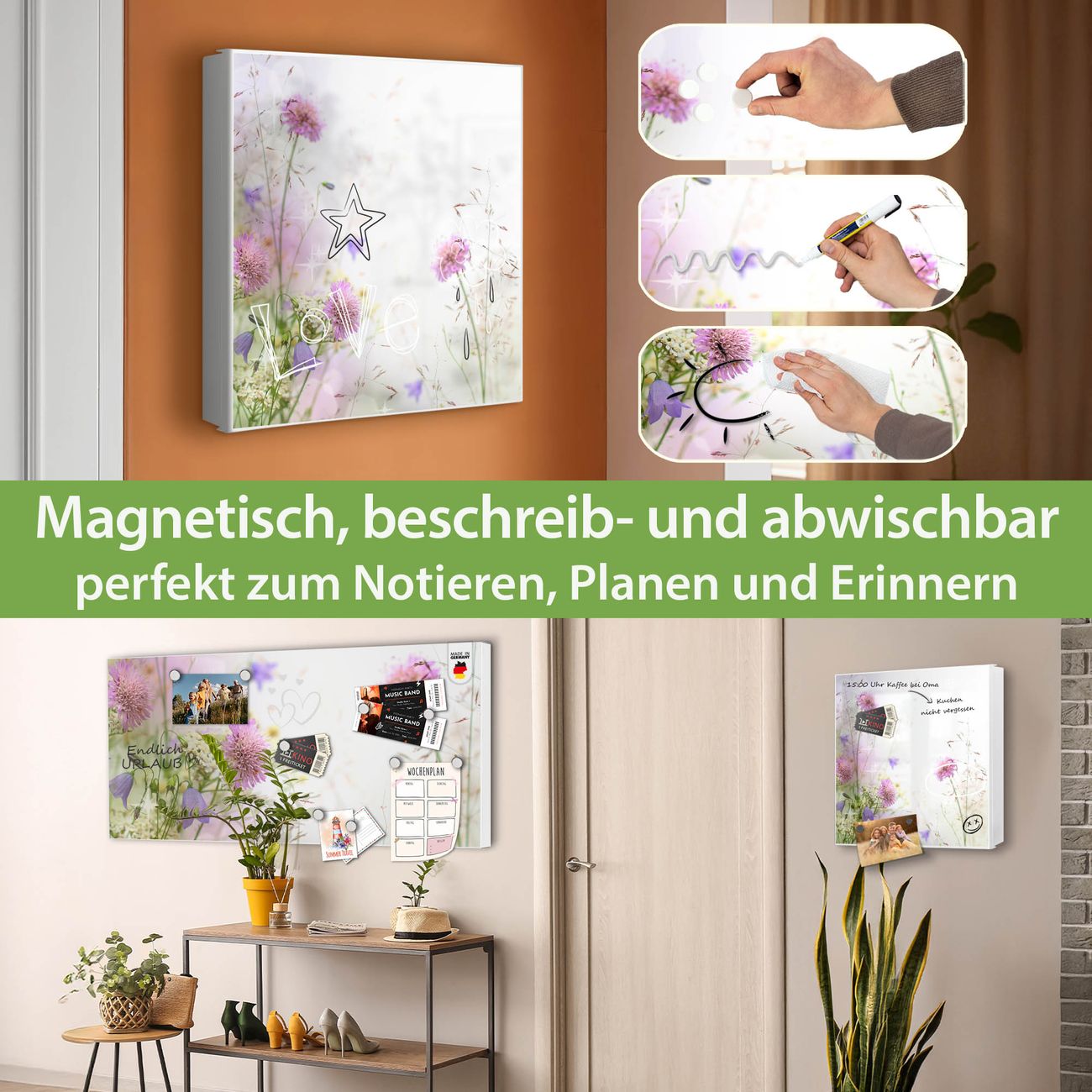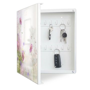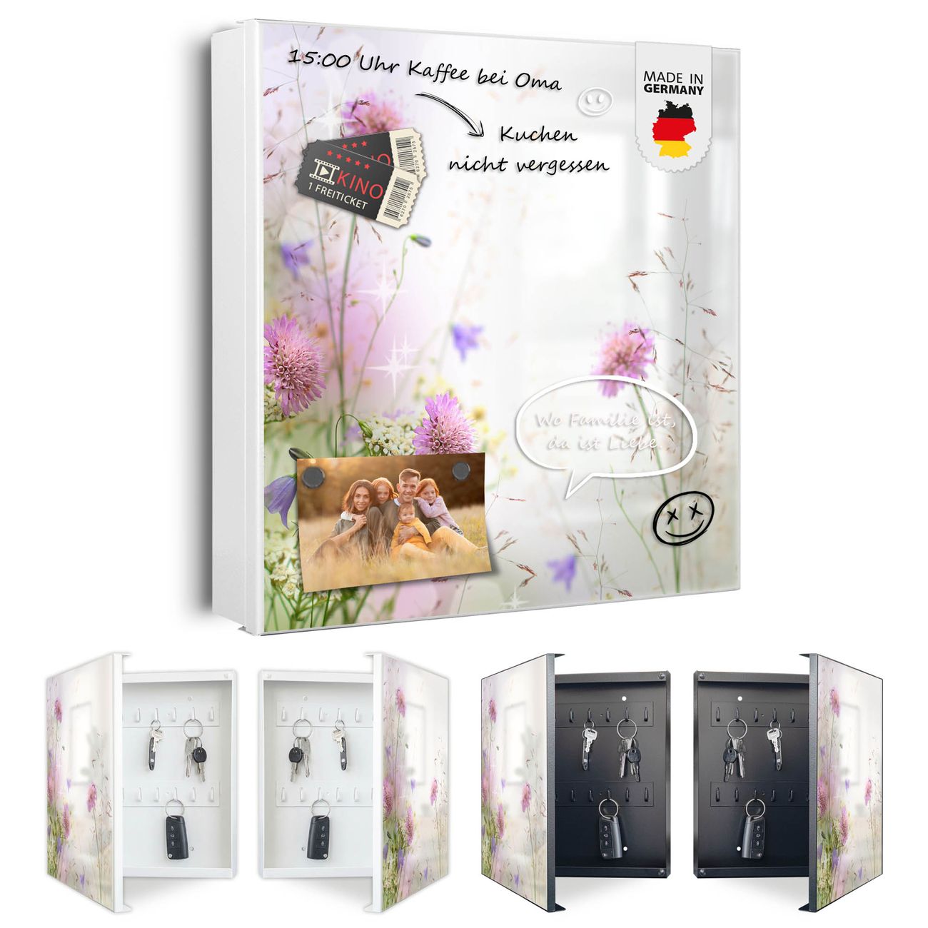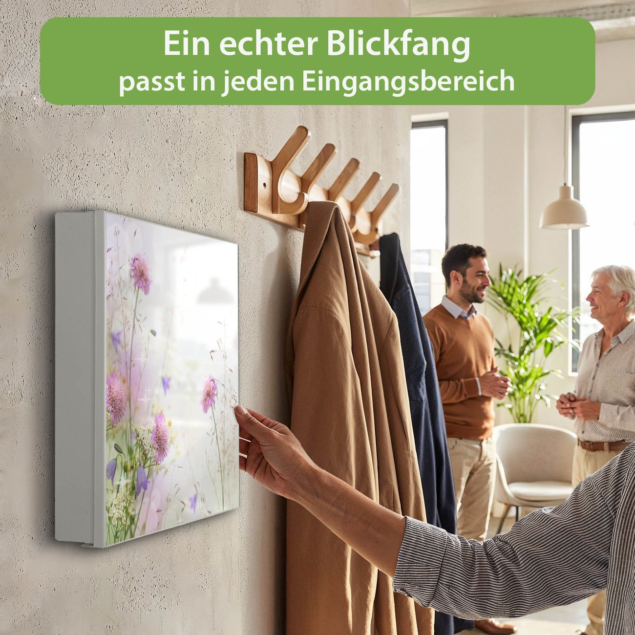 Bringe Ordnung und Eleganz in deinen Eingangsbereich mit dem banjado Schlüsselkasten Motiv Motiv Glitzernde Wiese. Die moderne Schlüsselbox kombiniert funktionales Design mit hochwertiger Verarbeitung und wird so zu einem echten Hingucker in Flur, Büro oder Ferienwohnung. ✅ Stilvolle Schlüsselaufbewahrung mit Motiv Motiv Glitzernde Wiese Der Design-Schlüsselkasten Motiv Motiv Glitzernde Wiese bietet Platz für bis zu 32 Schlüssel, die auf 4 stabilen Reihen mit je 8 Haken übersichtlich verstaut werden. Mit seinen kompakten Maßen von 30 x 30 x 5 cm passt die Schlüsselbox perfekt auch in kleinere Räume. Der weiß lackierte Stahlkorpus mit links angeschlagenem Türscharnier harmoniert mit gedruckten Folie auf der Front und fügt sich nahtlos in jedes Wohnambiente ein. Ob als Schlüsselorganizer für Zuhause oder als praktische Lösung für Büros, Praxen und Gewerbe, der banjado Schlüsselkasten sorgt für Ordnung und Übersicht. Dank der magnetischen, mit Kreidestiften beschreibbaren Folie auf der Front kannst du Notizen anheften oder Termine direkt auf der Oberfläche festhalten. Die Schlüsselbox Motiv Motiv Glitzernde Wiese zur Wandmontage wird inklusive Befestigungsmaterial geliefert und ist schnell angebracht. So hast du deine Schlüssel jederzeit griffbereit und zugleich stilvoll verstaut. Mit diesem banjado Schlüsselkasten Motiv Motiv Glitzernde Wiese kombinierst du praktische Aufbewahrung mit stilvollem Wohndesign. Ob privat oder geschäftlich, die Schlüsselbox sorgt für mehr Ordnung, Übersicht und ein wohnliches Ambiente.Vorteile im Überblick
