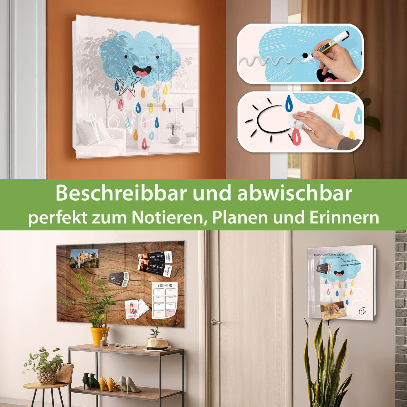 Bringe Ordnung und Eleganz in deinen Eingangsbereich mit dem banjado Schlüsselkasten Motiv Motiv glückliche Regenwolke. Die moderne Schlüsselbox kombiniert funktionales Design mit hochwertiger Verarbeitung und wird so zu einem echten Hingucker in Flur, Büro oder Ferienwohnung. ✅ Stilvolle Schlüsselaufbewahrung mit Glasfront im Motiv Motiv glückliche Regenwolke Der Design-Schlüsselkasten Motiv Motiv glückliche Regenwolke bietet Platz für bis zu 50 Schlüssel, die auf 5 stabilen Reihen mit je 10 Haken übersichtlich verstaut werden. Mit seinen kompakten Maßen von 30 x 30 x 5 cm passt die Schlüsselbox perfekt auch in kleinere Räume. Der weiß lackierte Stahlkorpus mit rechts angeschlagenem Türscharnier harmoniert mit der Glasfront und fügt sich nahtlos in jedes Wohnambiente ein. Ob als Schlüsselorganizer für Zuhause oder als praktische Lösung für Büros, Praxen und Gewerbe, der banjado Schlüsselkasten sorgt für Ordnung und Übersicht. Dank der magnetischen, mit Kreidestiften beschreibbaren Glasfront kannst du Notizen anheften oder Termine direkt auf der Oberfläche festhalten. Die Schlüsselbox Motiv Motiv glückliche Regenwolke zur Wandmontage wird inklusive Befestigungsmaterial geliefert und ist schnell angebracht. So hast du deine Schlüssel jederzeit griffbereit und zugleich stilvoll verstaut. Mit diesem banjado Schlüsselkasten Motiv Motiv glückliche Regenwolke kombinierst du praktische Aufbewahrung mit stilvollem Wohndesign. Ob privat oder geschäftlich, die Schlüsselbox sorgt für mehr Ordnung, Übersicht und ein wohnliches Ambiente.Vorteile im Überblick