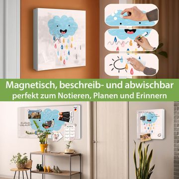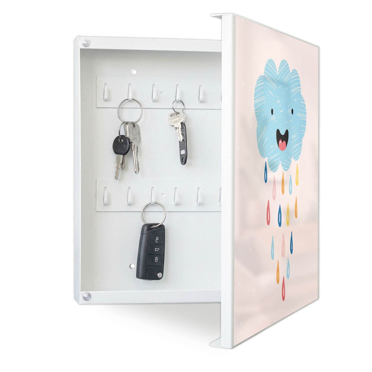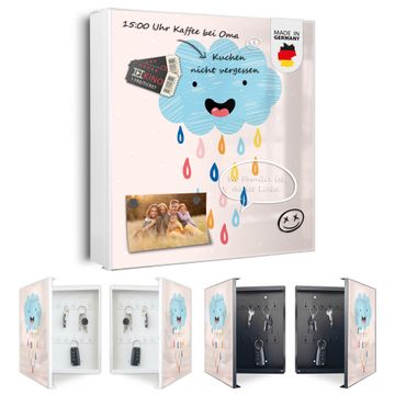 Bringe Ordnung und Eleganz in deinen Eingangsbereich mit dem banjado Schlüsselkasten Motiv Motiv glückliche Regenwolke. Die moderne Schlüsselbox kombiniert funktionales Design mit hochwertiger Verarbeitung und wird so zu einem echten Hingucker in Flur, Büro oder Ferienwohnung. ✅ Stilvolle Schlüsselaufbewahrung mit Motiv Motiv glückliche Regenwolke Der Design-Schlüsselkasten Motiv Motiv glückliche Regenwolke bietet Platz für bis zu 32 Schlüssel, die auf 4 stabilen Reihen mit je 8 Haken übersichtlich verstaut werden. Mit seinen kompakten Maßen von 30 x 30 x 5 cm passt die Schlüsselbox perfekt auch in kleinere Räume. Der weiß lackierte Stahlkorpus mit rechts angeschlagenem Türscharnier harmoniert mit gedruckten Folie auf der Front und fügt sich nahtlos in jedes Wohnambiente ein. Ob als Schlüsselorganizer für Zuhause oder als praktische Lösung für Büros, Praxen und Gewerbe, der banjado Schlüsselkasten sorgt für Ordnung und Übersicht. Dank der magnetischen, mit Kreidestiften beschreibbaren Folie auf der Front kannst du Notizen anheften oder Termine direkt auf der Oberfläche festhalten. Die Schlüsselbox Motiv Motiv glückliche Regenwolke zur Wandmontage wird inklusive Befestigungsmaterial geliefert und ist schnell angebracht. So hast du deine Schlüssel jederzeit griffbereit und zugleich stilvoll verstaut. Mit diesem banjado Schlüsselkasten Motiv Motiv glückliche Regenwolke kombinierst du praktische Aufbewahrung mit stilvollem Wohndesign. Ob privat oder geschäftlich, die Schlüsselbox sorgt für mehr Ordnung, Übersicht und ein wohnliches Ambiente.Vorteile im Überblick