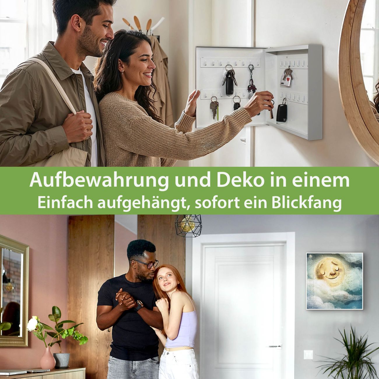 Bringe Ordnung und Eleganz in deinen Eingangsbereich mit dem banjado Schlüsselkasten Motiv Motiv Glücksmond. Die moderne Schlüsselbox kombiniert funktionales Design mit hochwertiger Verarbeitung und wird so zu einem echten Hingucker in Flur, Büro oder Ferienwohnung. ✅ Stilvolle Schlüsselaufbewahrung mit Motiv Motiv Glücksmond Der Design-Schlüsselkasten Motiv Motiv Glücksmond bietet Platz für bis zu 32 Schlüssel, die auf 4 stabilen Reihen mit je 8 Haken übersichtlich verstaut werden. Mit seinen kompakten Maßen von 30 x 30 x 5 cm passt die Schlüsselbox perfekt auch in kleinere Räume. Der weiß lackierte Stahlkorpus mit links angeschlagenem Türscharnier harmoniert mit gedruckten Folie auf der Front und fügt sich nahtlos in jedes Wohnambiente ein. Ob als Schlüsselorganizer für Zuhause oder als praktische Lösung für Büros, Praxen und Gewerbe, der banjado Schlüsselkasten sorgt für Ordnung und Übersicht. Dank der magnetischen, mit Kreidestiften beschreibbaren Folie auf der Front kannst du Notizen anheften oder Termine direkt auf der Oberfläche festhalten. Die Schlüsselbox Motiv Motiv Glücksmond zur Wandmontage wird inklusive Befestigungsmaterial geliefert und ist schnell angebracht. So hast du deine Schlüssel jederzeit griffbereit und zugleich stilvoll verstaut. Mit diesem banjado Schlüsselkasten Motiv Motiv Glücksmond kombinierst du praktische Aufbewahrung mit stilvollem Wohndesign. Ob privat oder geschäftlich, die Schlüsselbox sorgt für mehr Ordnung, Übersicht und ein wohnliches Ambiente.Vorteile im Überblick