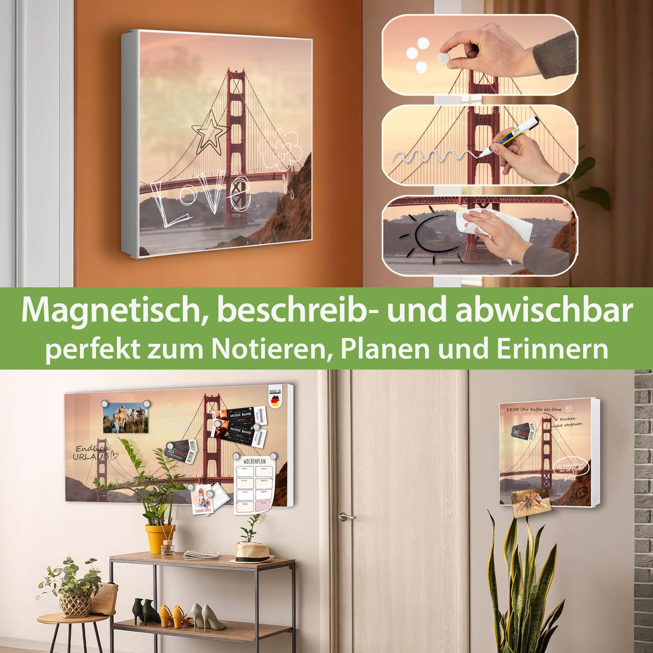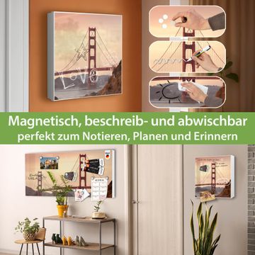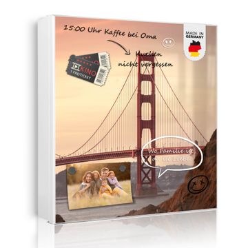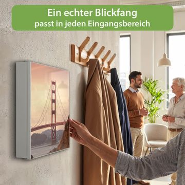 Bringe Ordnung und Eleganz in deinen Eingangsbereich mit dem banjado Schlüsselkasten Motiv Motiv Golden Gate Bridge 2. Die moderne Schlüsselbox kombiniert funktionales Design mit hochwertiger Verarbeitung und wird so zu einem echten Hingucker in Flur, Büro oder Ferienwohnung. ✅ Stilvolle Schlüsselaufbewahrung mit Motiv Motiv Golden Gate Bridge 2 Der Design-Schlüsselkasten Motiv Motiv Golden Gate Bridge 2 bietet Platz für bis zu 32 Schlüssel, die auf 4 stabilen Reihen mit je 8 Haken übersichtlich verstaut werden. Mit seinen kompakten Maßen von 30 x 30 x 5 cm passt die Schlüsselbox perfekt auch in kleinere Räume. Der weiß lackierte Stahlkorpus mit rechts angeschlagenem Türscharnier harmoniert mit gedruckten Folie auf der Front und fügt sich nahtlos in jedes Wohnambiente ein. Ob als Schlüsselorganizer für Zuhause oder als praktische Lösung für Büros, Praxen und Gewerbe, der banjado Schlüsselkasten sorgt für Ordnung und Übersicht. Dank der magnetischen, mit Kreidestiften beschreibbaren Folie auf der Front kannst du Notizen anheften oder Termine direkt auf der Oberfläche festhalten. Die Schlüsselbox Motiv Motiv Golden Gate Bridge 2 zur Wandmontage wird inklusive Befestigungsmaterial geliefert und ist schnell angebracht. So hast du deine Schlüssel jederzeit griffbereit und zugleich stilvoll verstaut. Mit diesem banjado Schlüsselkasten Motiv Motiv Golden Gate Bridge 2 kombinierst du praktische Aufbewahrung mit stilvollem Wohndesign. Ob privat oder geschäftlich, die Schlüsselbox sorgt für mehr Ordnung, Übersicht und ein wohnliches Ambiente.Vorteile im Überblick