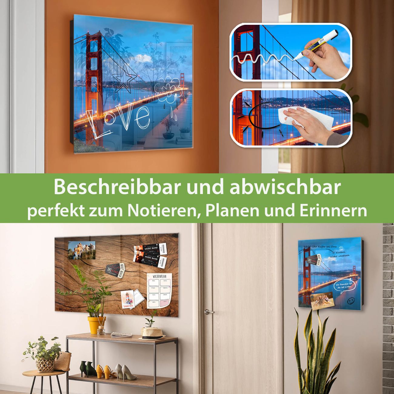Bringe Ordnung und Eleganz in deinen Eingangsbereich mit dem banjado Schlüsselkasten Motiv Motiv Golden Gate Bridge. Die moderne Schlüsselbox kombiniert funktionales Design mit hochwertiger Verarbeitung und wird so zu einem echten Hingucker in Flur, Büro oder Ferienwohnung. ✅ Stilvolle Schlüsselaufbewahrung mit Glasfront im Motiv Motiv Golden Gate Bridge Der Design-Schlüsselkasten Motiv Motiv Golden Gate Bridge bietet Platz für bis zu 50 Schlüssel, die auf 5 stabilen Reihen mit je 10 Haken übersichtlich verstaut werden. Mit seinen kompakten Maßen von 30 x 30 x 5 cm passt die Schlüsselbox perfekt auch in kleinere Räume. Der schwarz lackierte Stahlkorpus mit rechts angeschlagenem Türscharnier harmoniert mit der Glasfront und fügt sich nahtlos in jedes Wohnambiente ein. Ob als Schlüsselorganizer für Zuhause oder als praktische Lösung für Büros, Praxen und Gewerbe, der banjado Schlüsselkasten sorgt für Ordnung und Übersicht. Dank der magnetischen, mit Kreidestiften beschreibbaren Glasfront kannst du Notizen anheften oder Termine direkt auf der Oberfläche festhalten. Die Schlüsselbox Motiv Motiv Golden Gate Bridge zur Wandmontage wird inklusive Befestigungsmaterial geliefert und ist schnell angebracht. So hast du deine Schlüssel jederzeit griffbereit und zugleich stilvoll verstaut. Mit diesem banjado Schlüsselkasten Motiv Motiv Golden Gate Bridge kombinierst du praktische Aufbewahrung mit stilvollem Wohndesign. Ob privat oder geschäftlich, die Schlüsselbox sorgt für mehr Ordnung, Übersicht und ein wohnliches Ambiente.Vorteile im Überblick